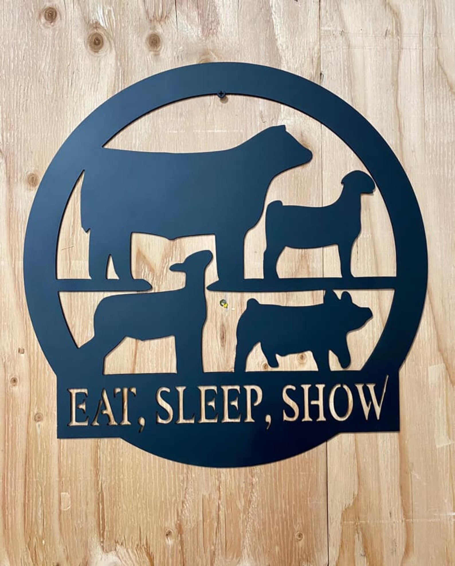 Made in the USA from 16 gauge steel. CNC plasma cut and hand finished. Powder coat for durability. More designs at our facebook page @rmfsigns Reed Machine and Fabrication LLC. Custom names and sizes available. Eat Sleep Show, 4H, Stock Show, Livestock, Beef, Lamb, Hog, Pig, Goat, Farm wall decor.