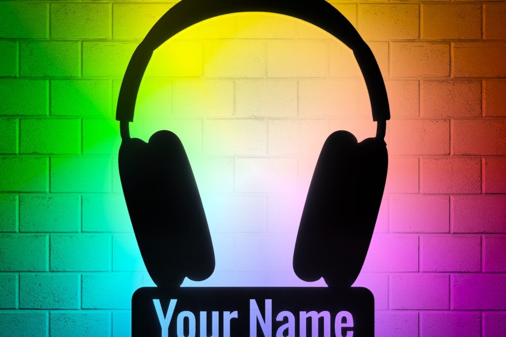 _Personalized Elegance: Your name beautifully illuminated in dynamic RGB colors within the iconic AirPods Headphone design.