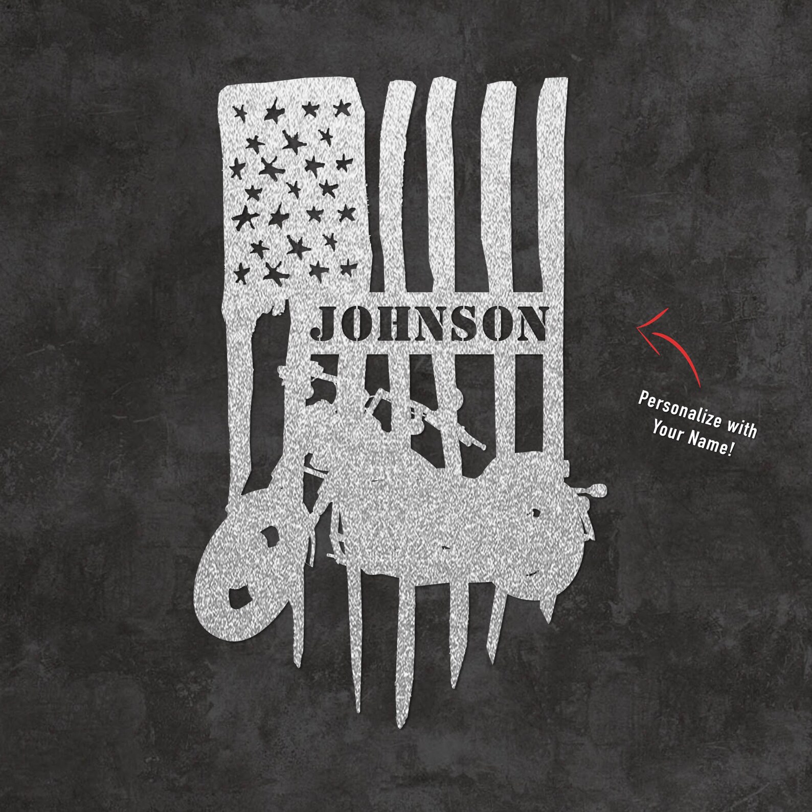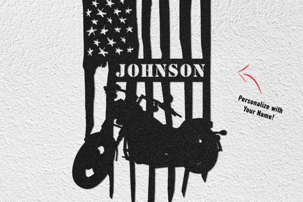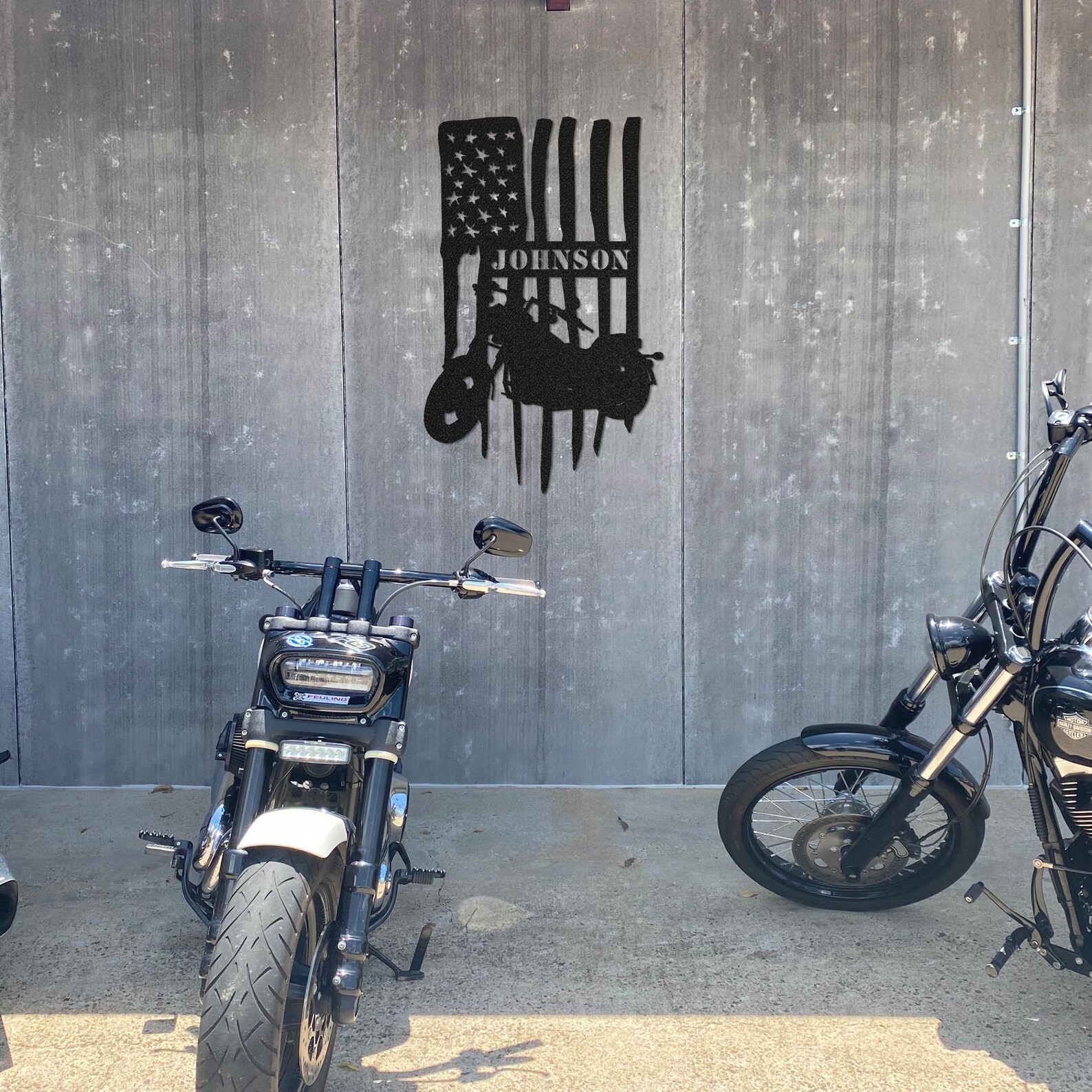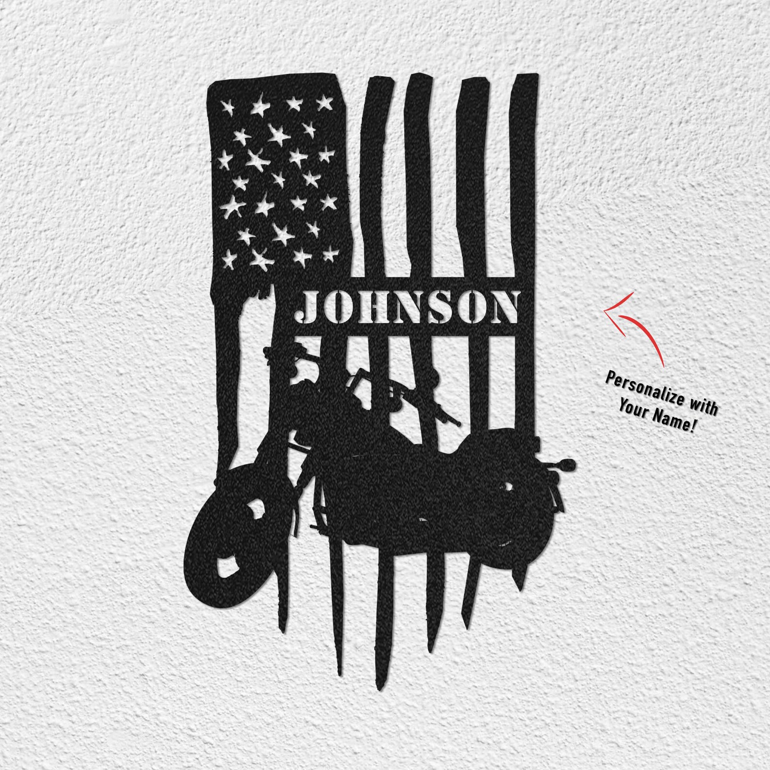 PERSONALIZED Anniversary Gift For Bikers – Metal Wall Art – Patriot Flag – Family Name