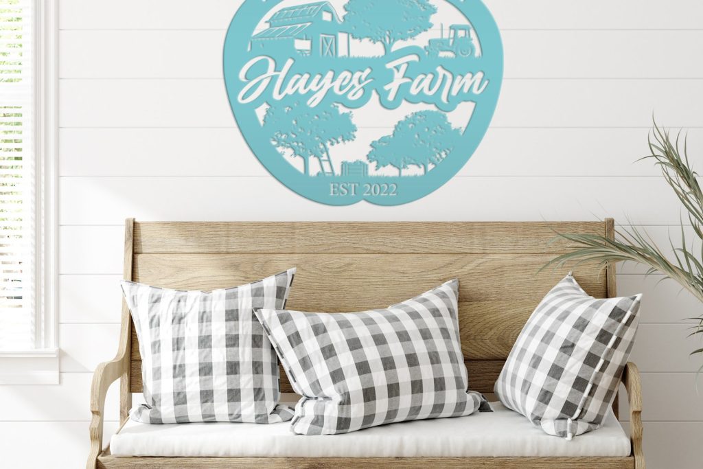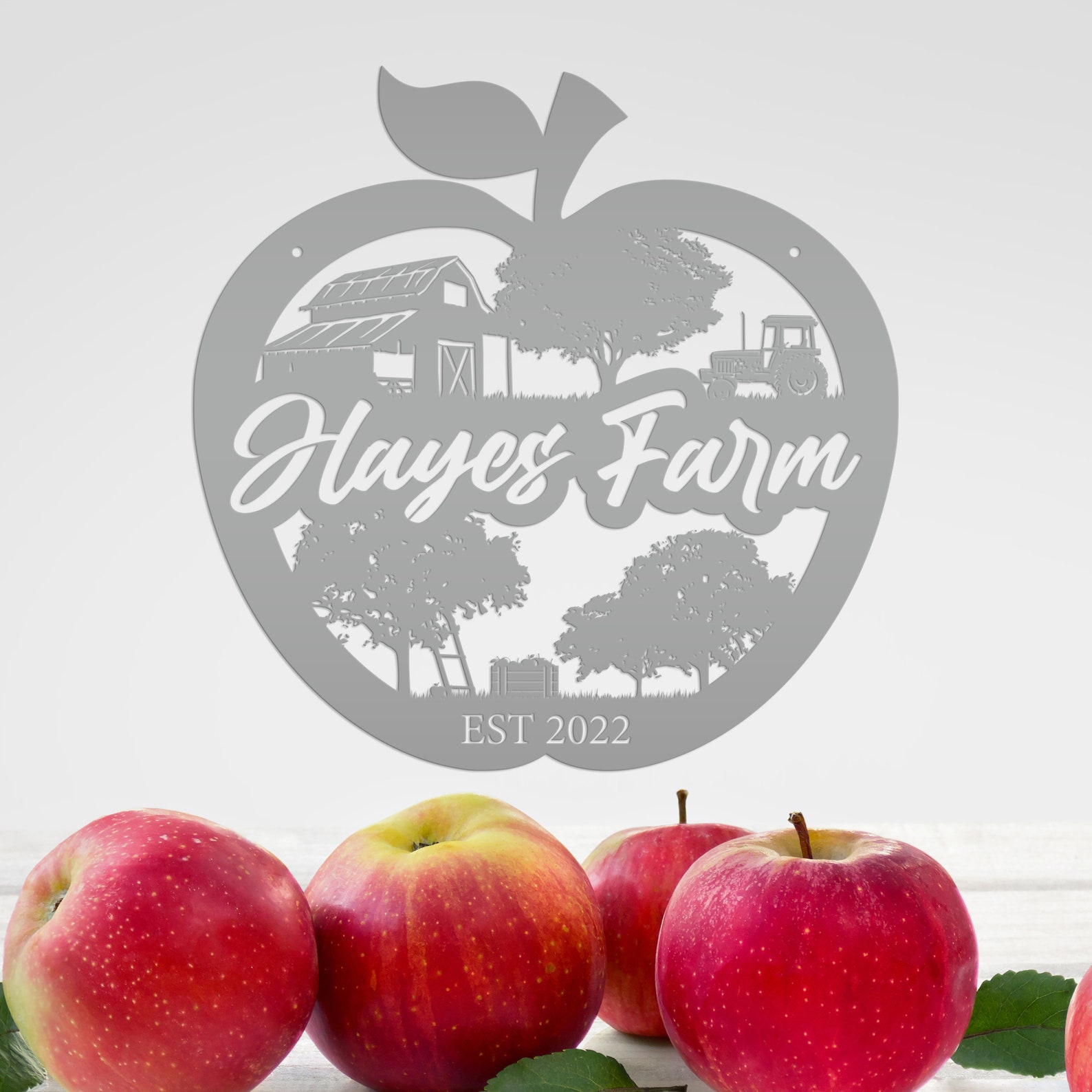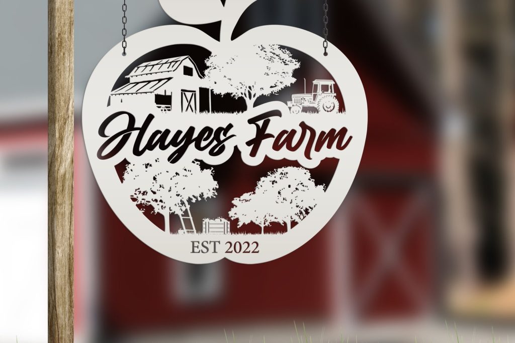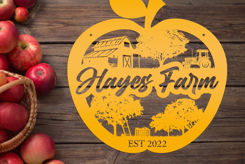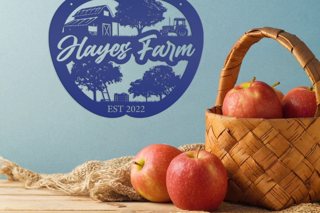 Add a touch of charm to your homestead with our Farm Sign Apple Orchard Sign. Crafted from durable metal, this indoor/outdoor wall signage is perfect for hanging outside your apple orchard or business. Make it personal with your family name for a unique and thoughtful gift idea. With its rustic appeal, this piece is bound to add a cozy touch to your home decor.