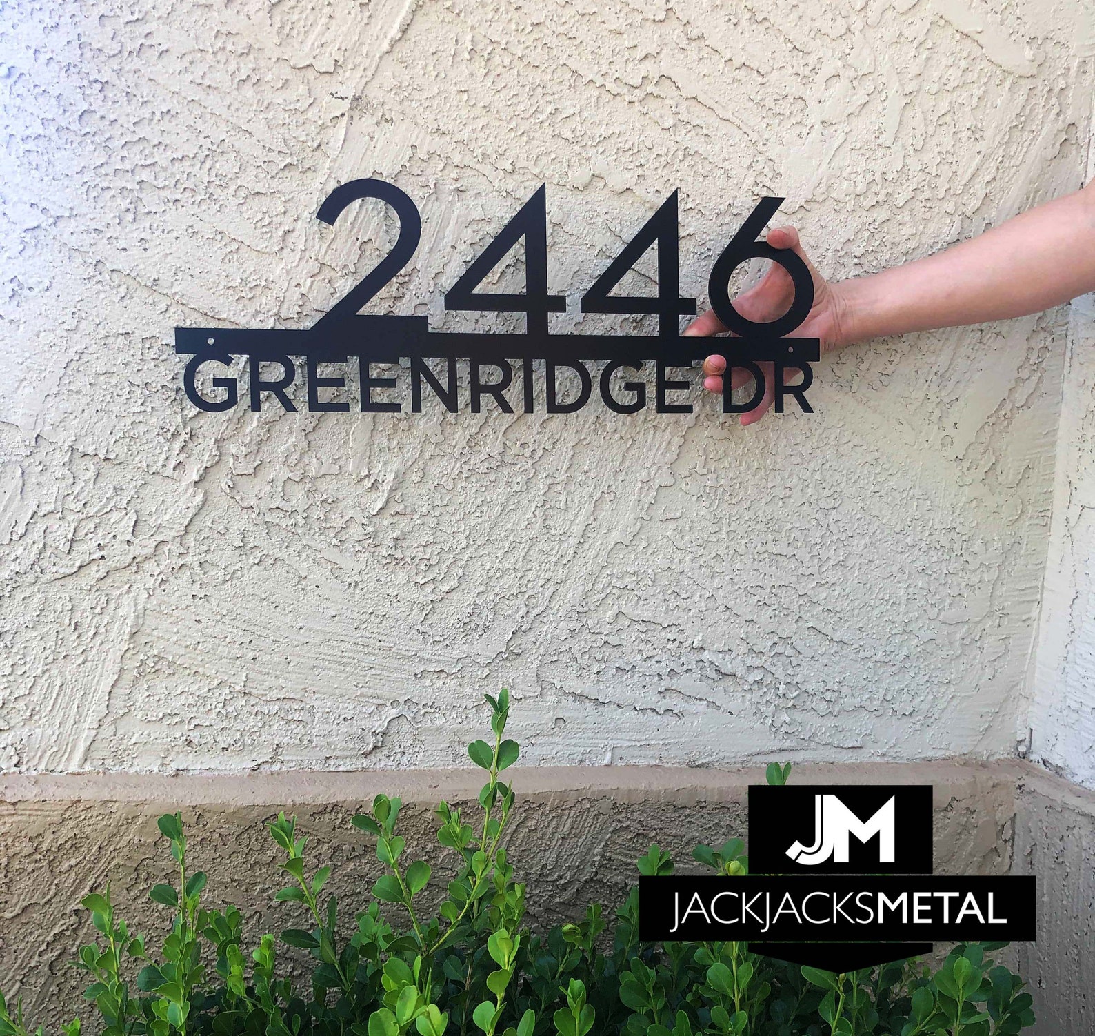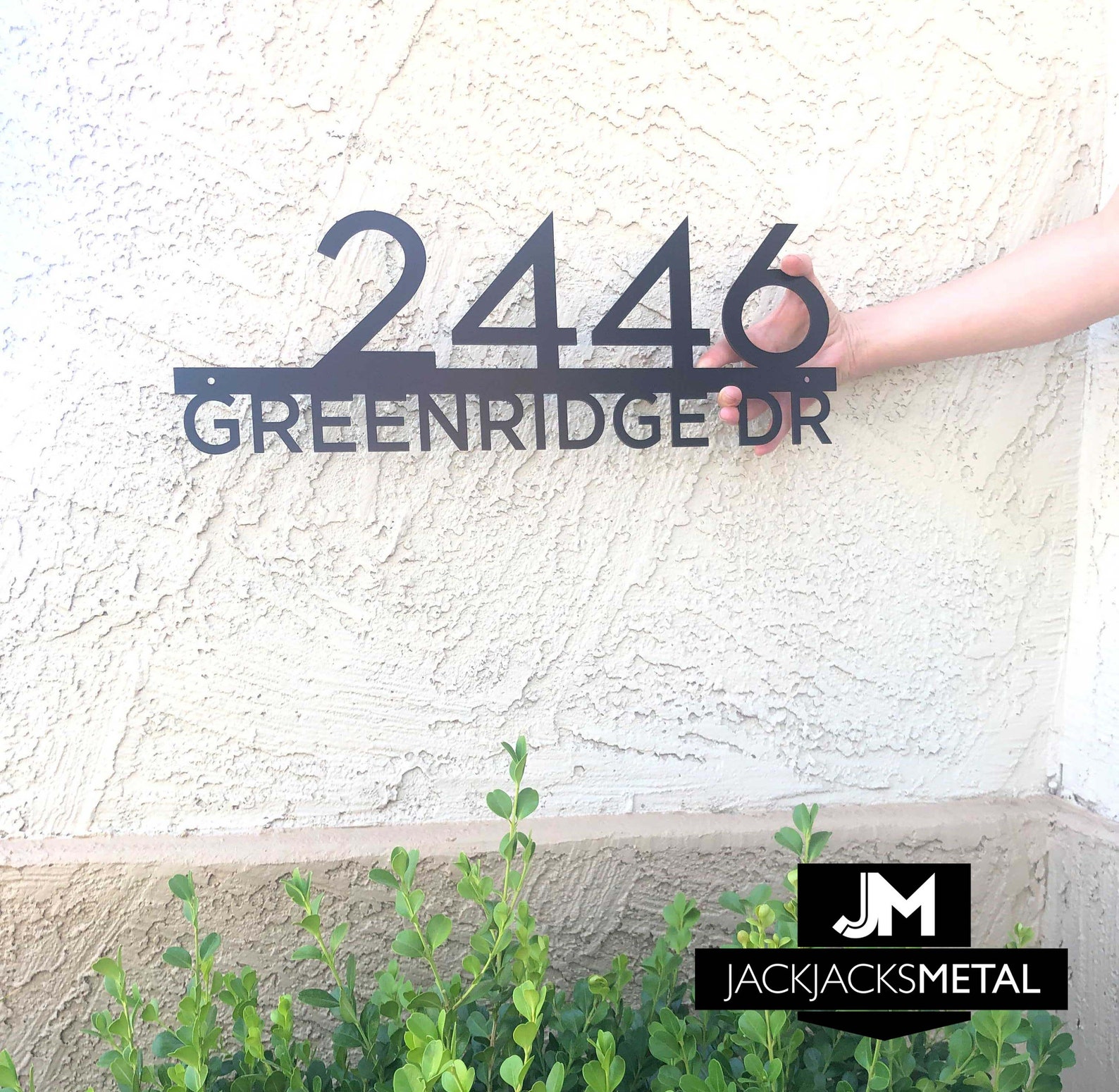 7 inch tall x 20 inch wide Modern Style Metal Address Bar made from iron and offered in raw metal or powder coated steel so they will be protected from outside harsh weather conditions and look great on a house of any color