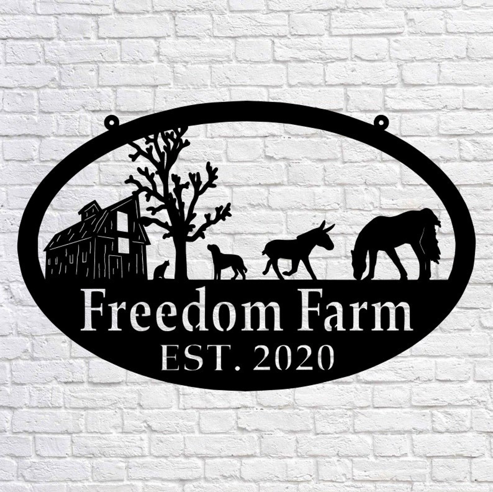 Rustic, personalized , metal, welcome sign with old barn and cow and tractor scene . Measures 30" across .Powder coated black or beautiful copper acid and clear coated.