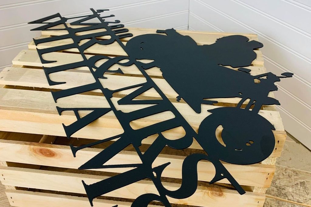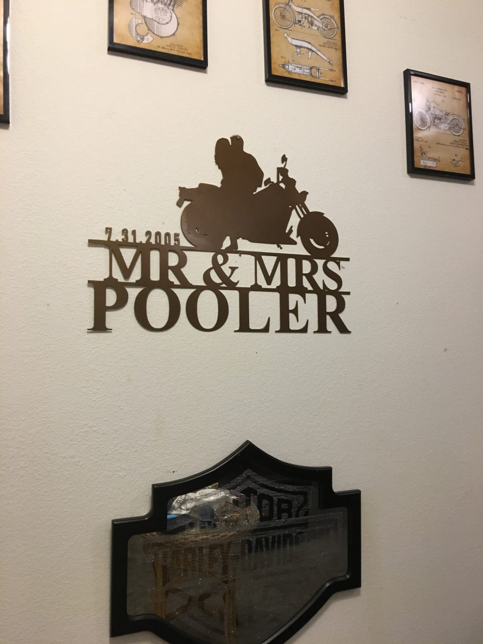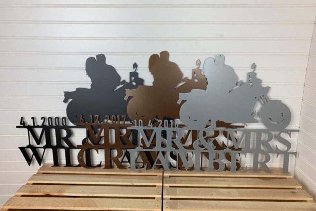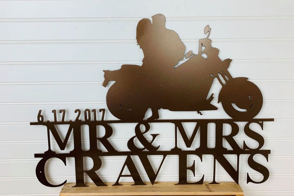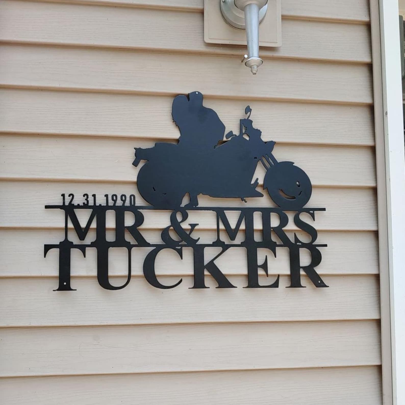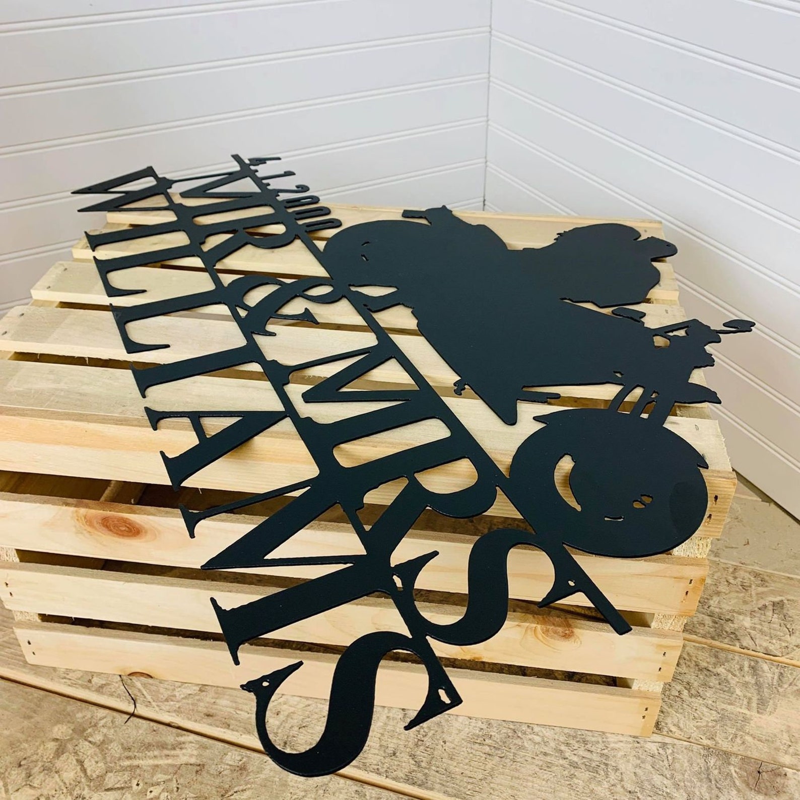 Last Name Sign PERSONALIZED Married Husband Wife Biker Couple Metal Wall Art Wedding / Anniversary / Birthday Gift