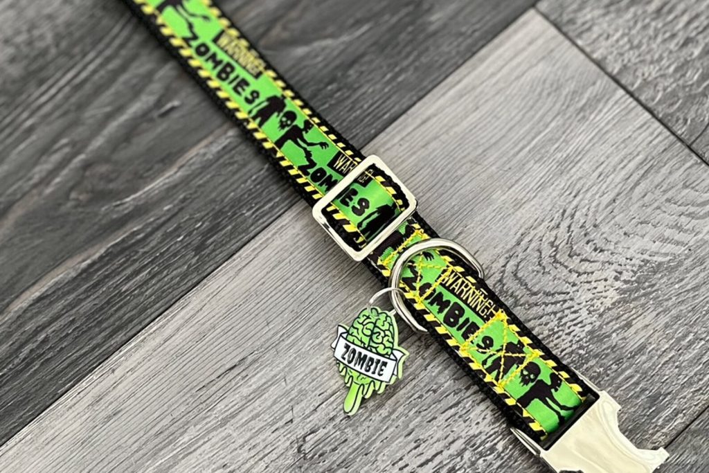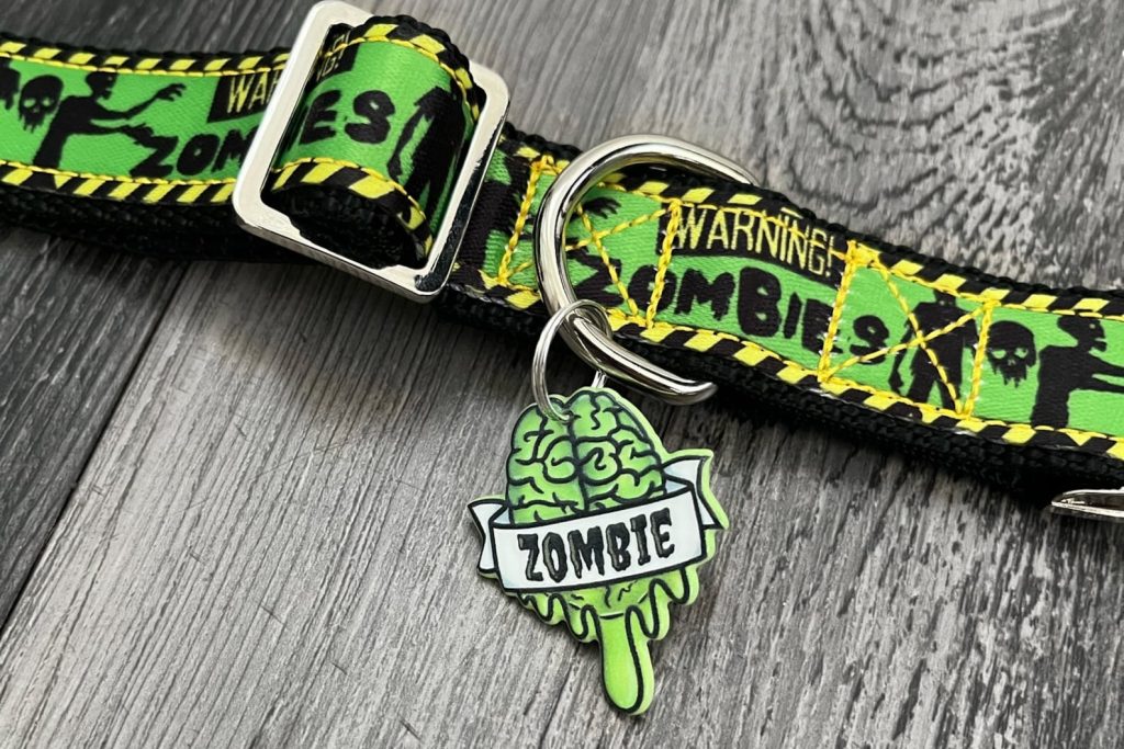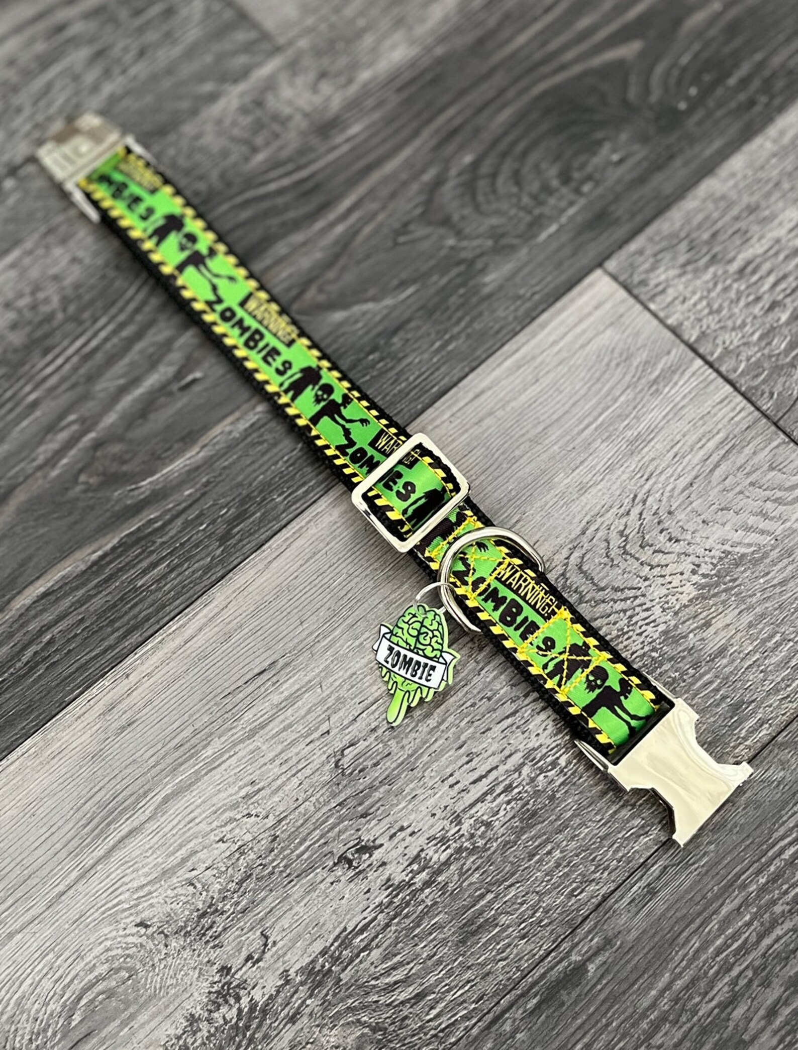 Zombie invasion caution pattern canvas on black heavy duty nylon with a silver metal, green plastic, or black tactical buckle, and silver metal hardware. Each collar is paired with a resin zombie brain charm (38mm.) All collars are adjustable. Buckle personalization is available for 5/8", 1", or 1.5" width collars. Engraved plastic buckles are black.