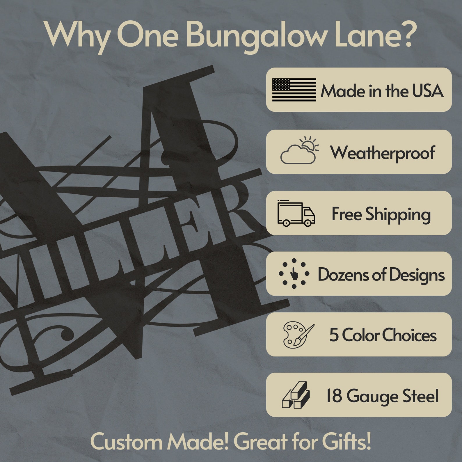 Elevate your space with our exquisite steel signs, seamlessly blending nature-inspired designs with functional elegance. At One Bungalow Lane, we take pride in our craftsmanship and personalized charm. Whether displaying your address, family name, or a combination of both, our signs infuse a unique touch into your abode.