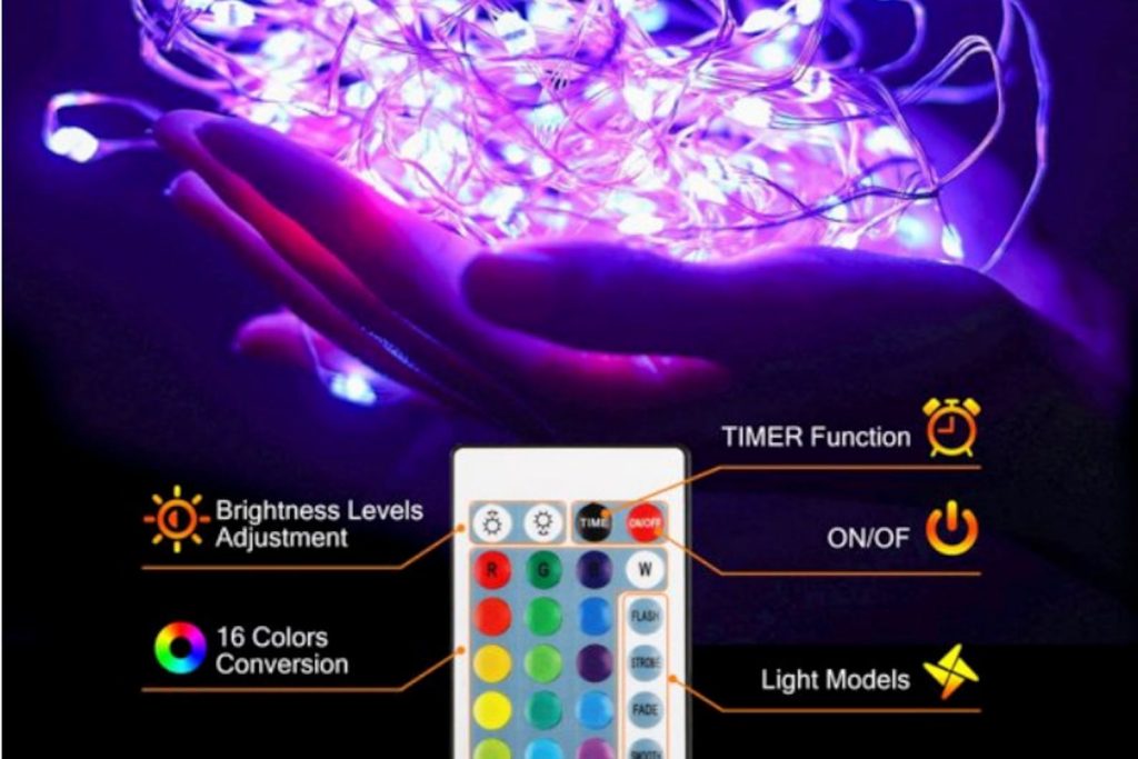 Remote control: You can use the remote to turn the lights on and off, change the color to one of 16 vibrant colors, adjust brightness, cycle through the colors and set a timer.