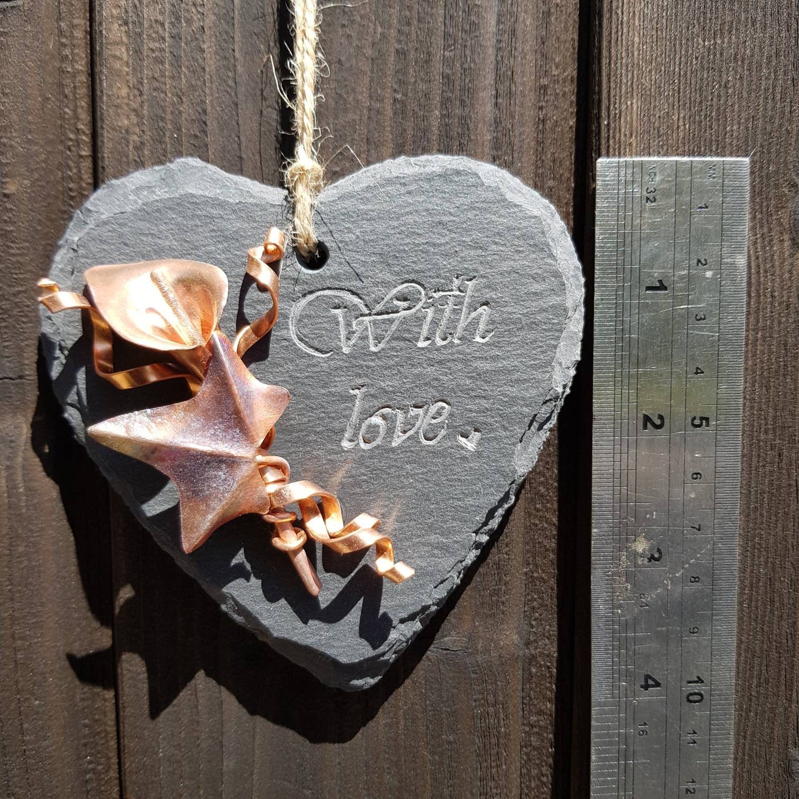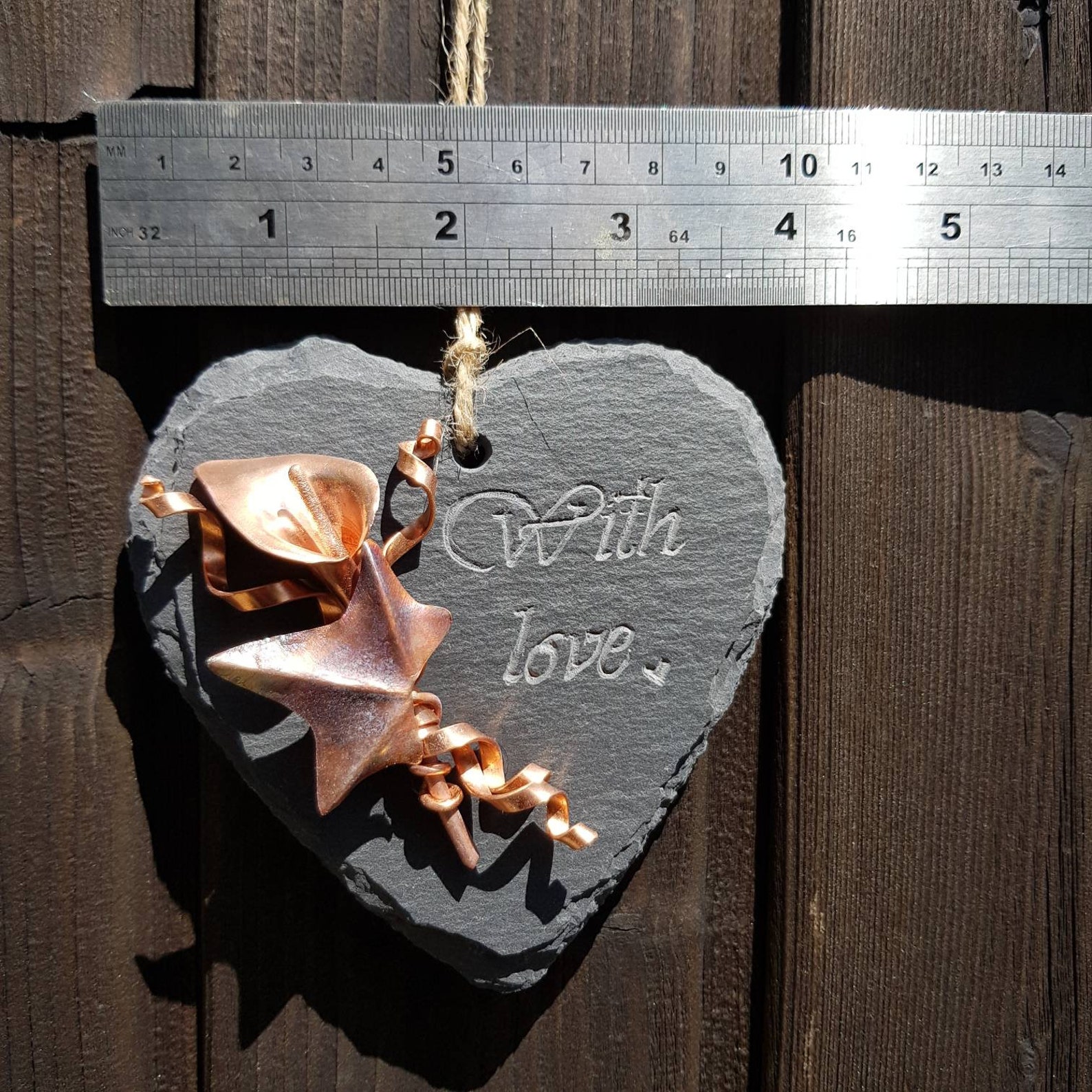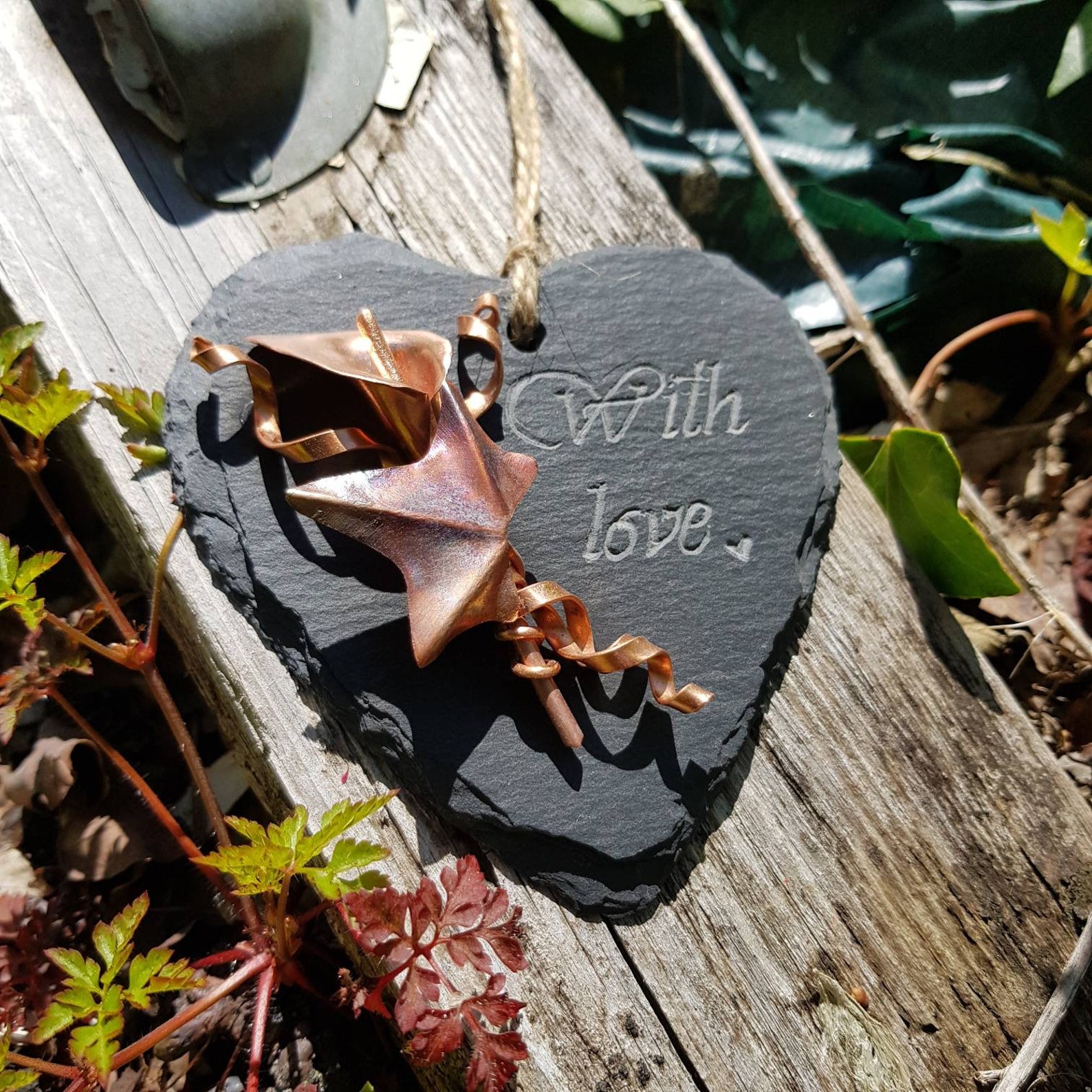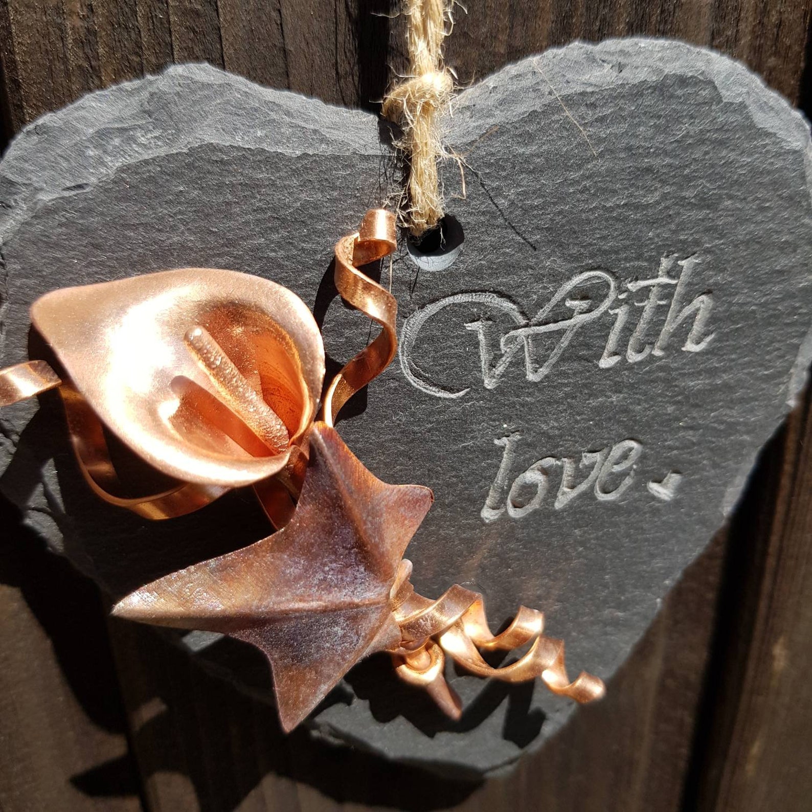 10cm x 10cm slate heart with a copper calla lily and ivy spray attached.
