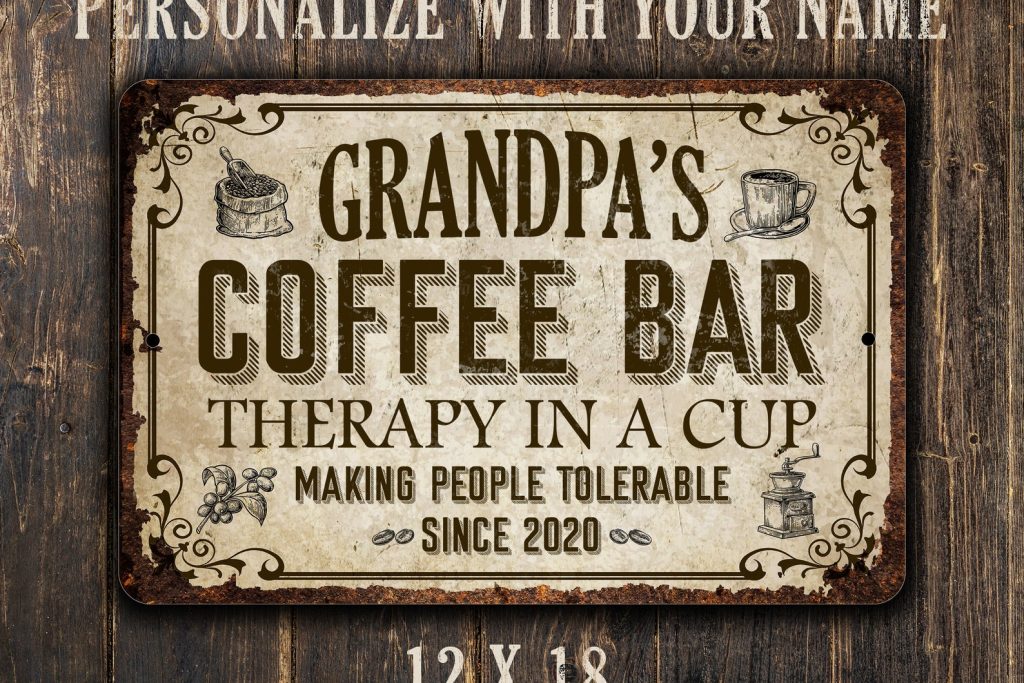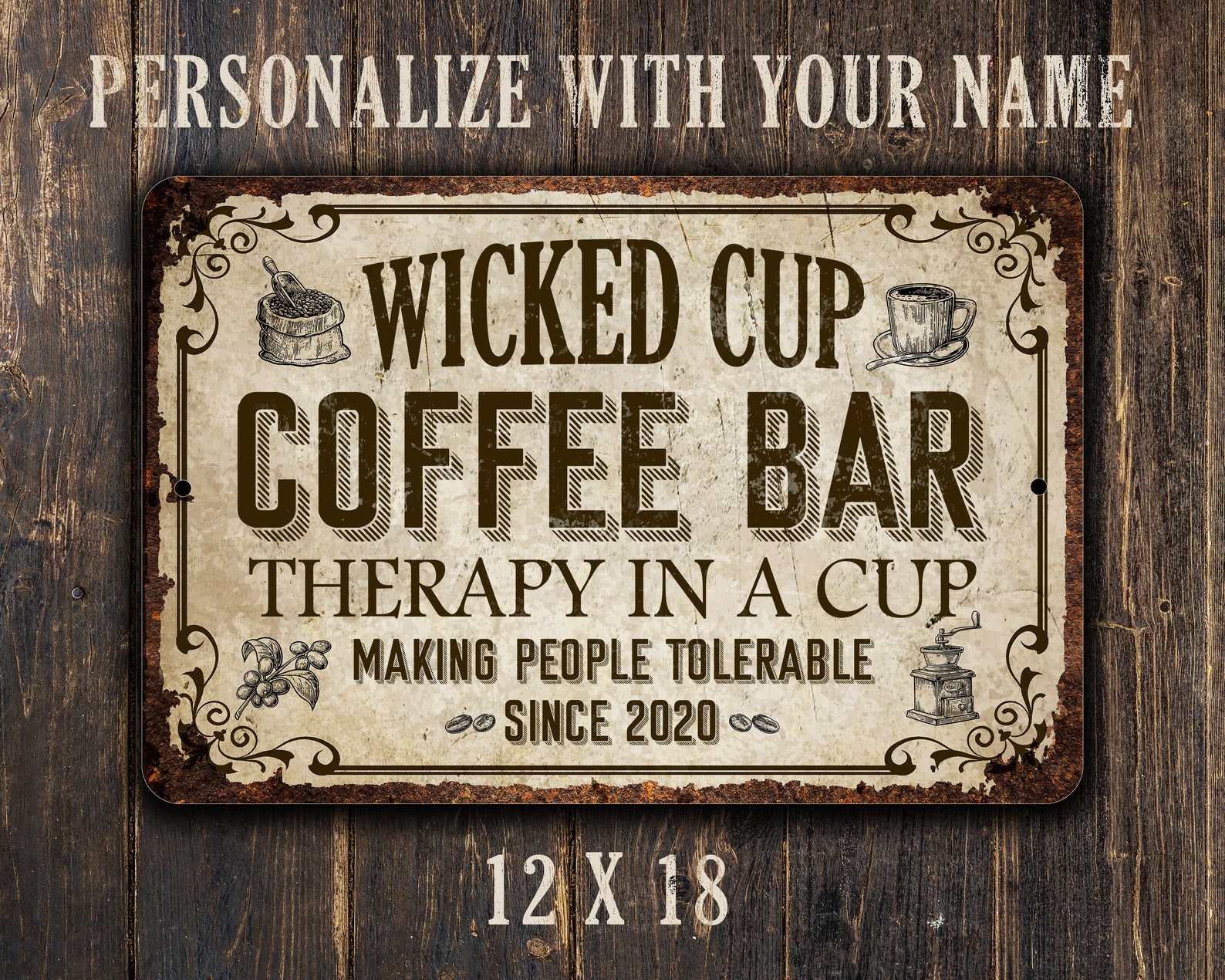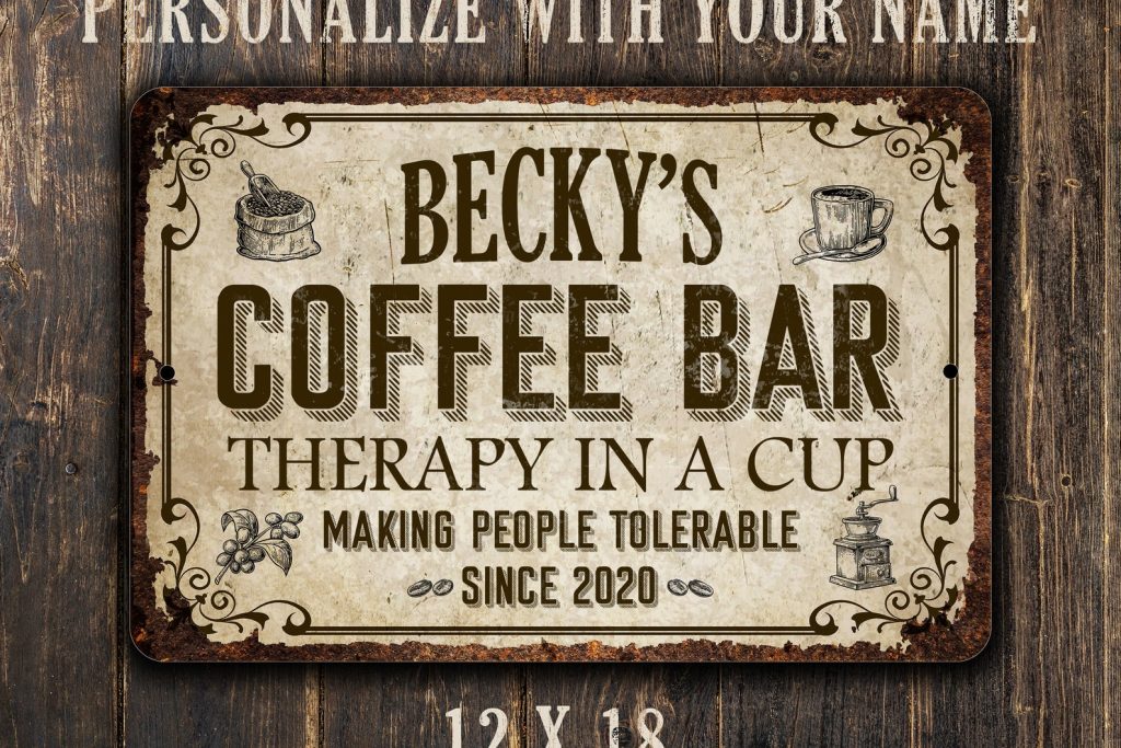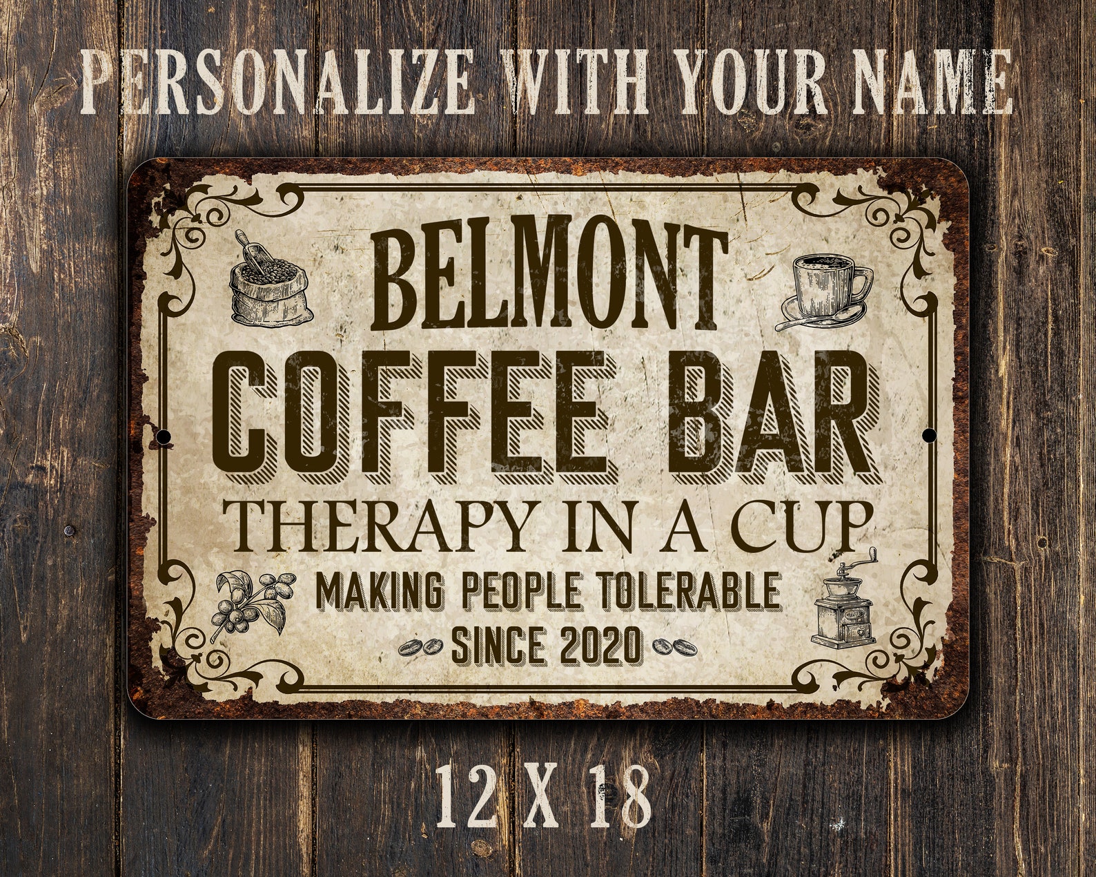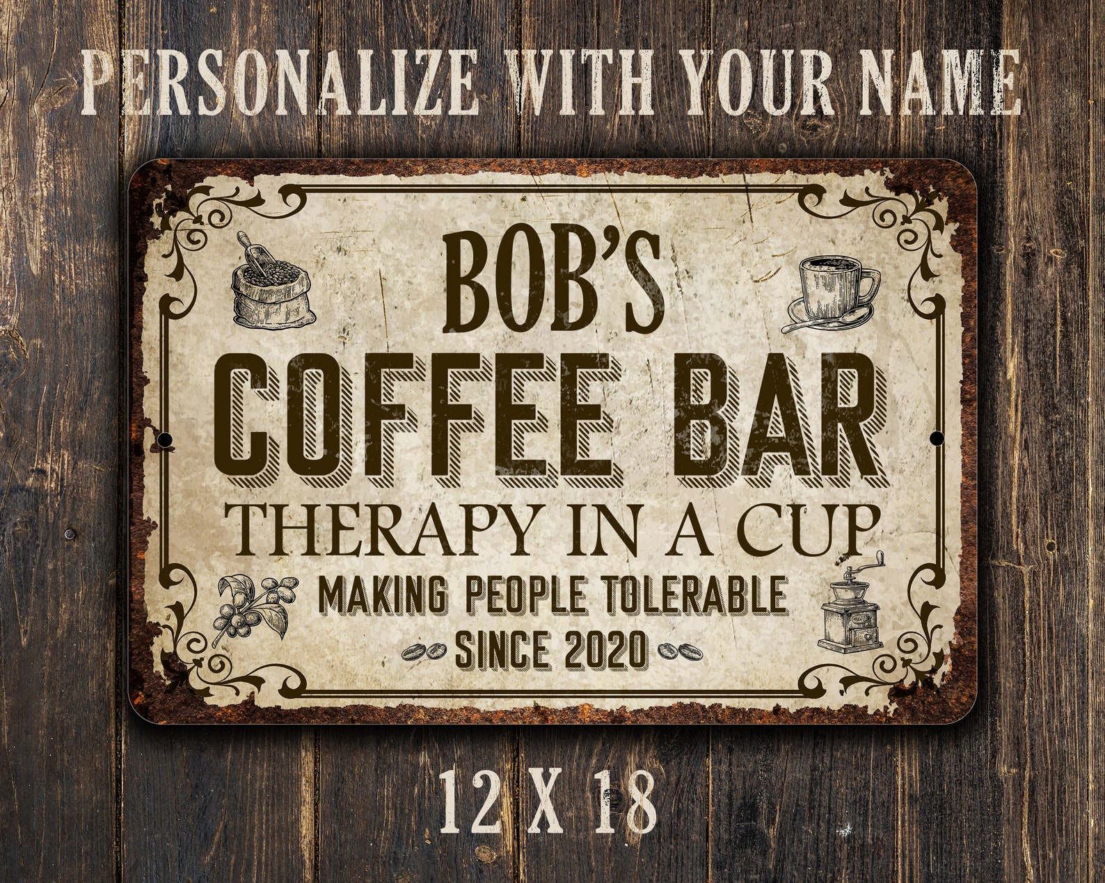 Personalized Metal Coffee Bar Sign | Customize this sign with your first name, last name, or whatever you choose! | Great Gift | Designed with a weathered, antiqued look that will go well with any decor! | Great for business office coffee stations too!