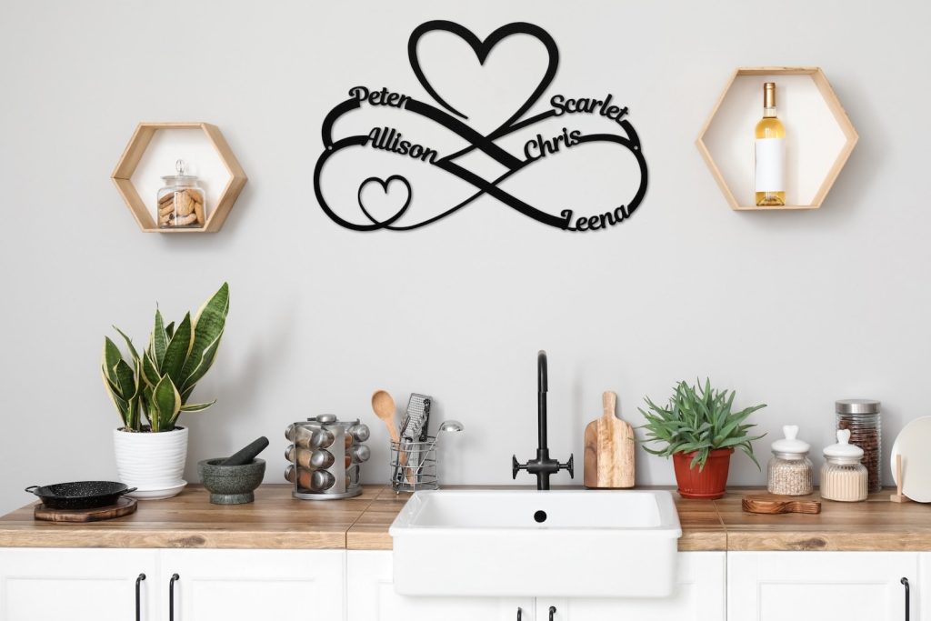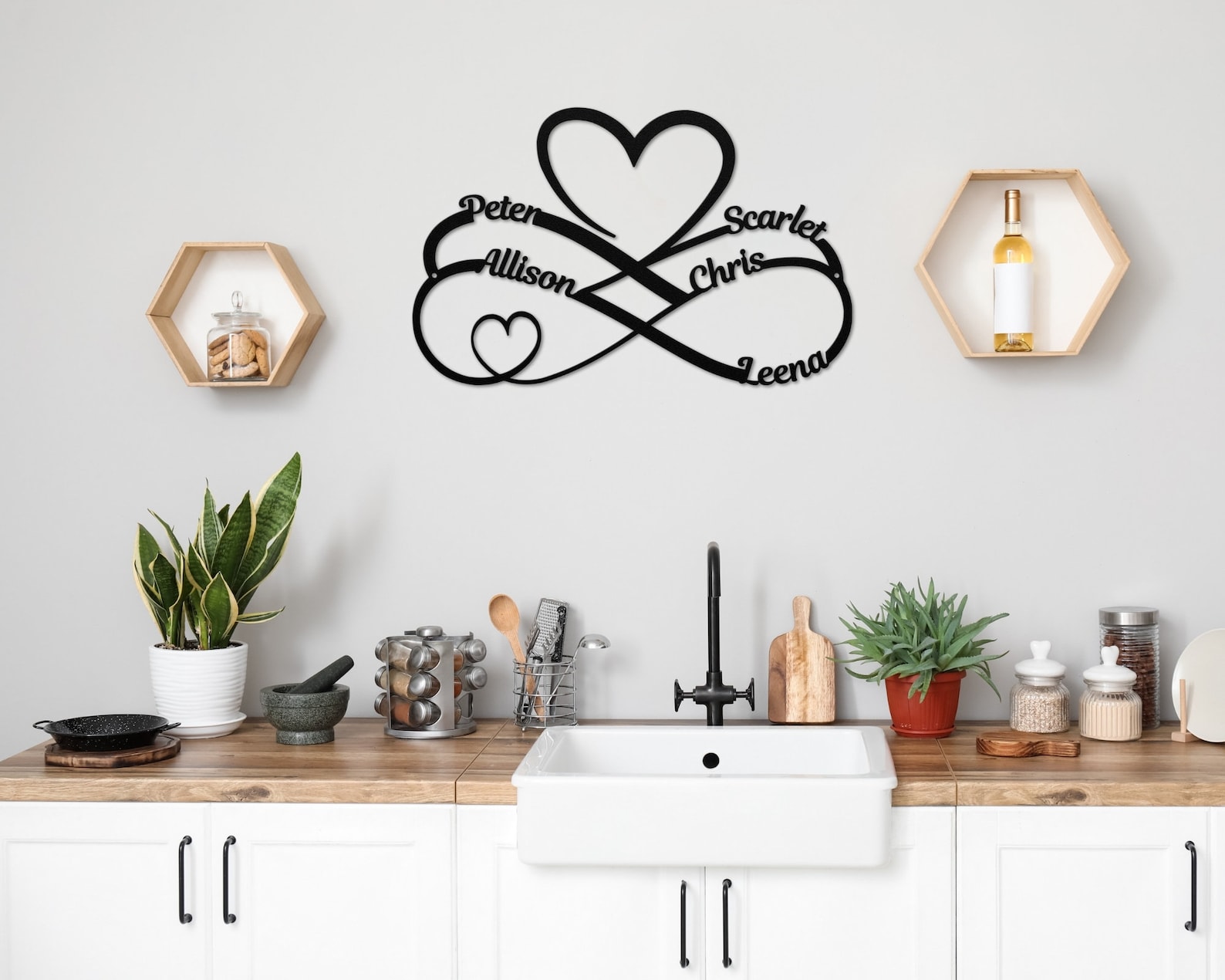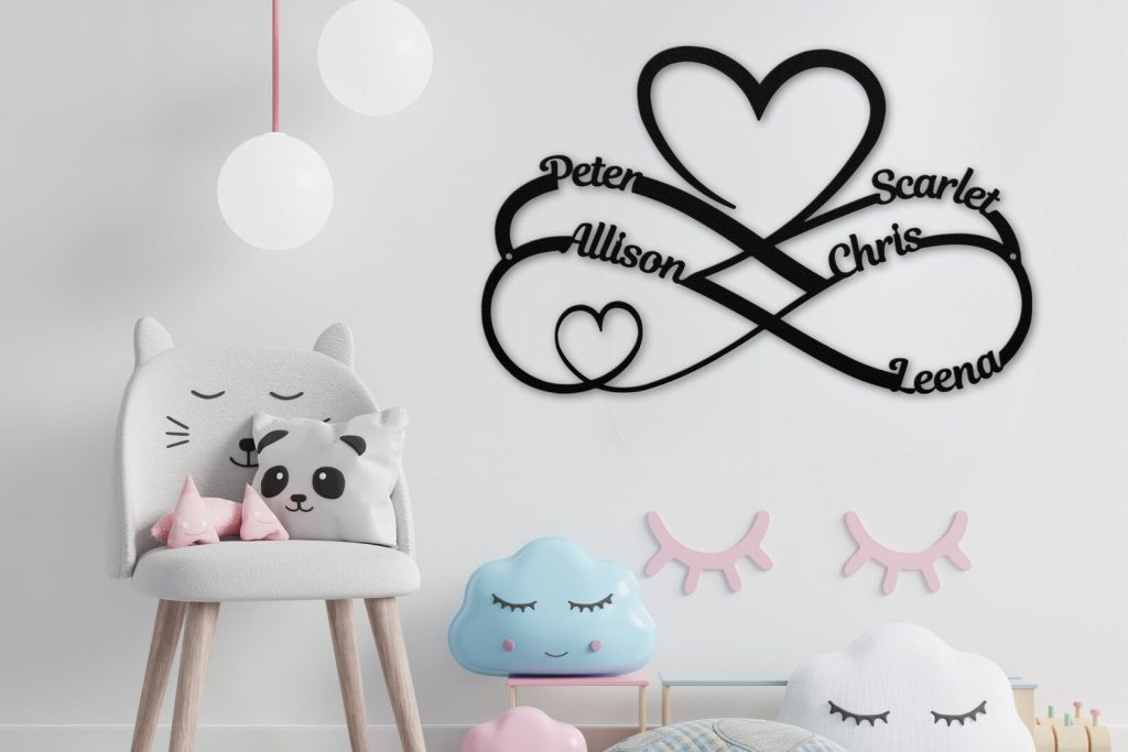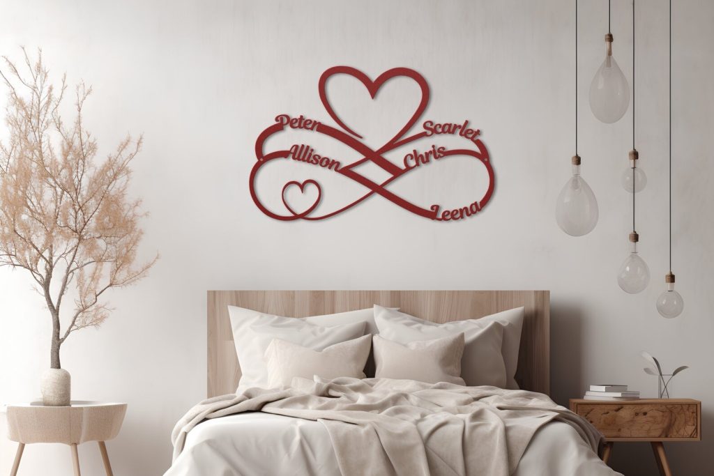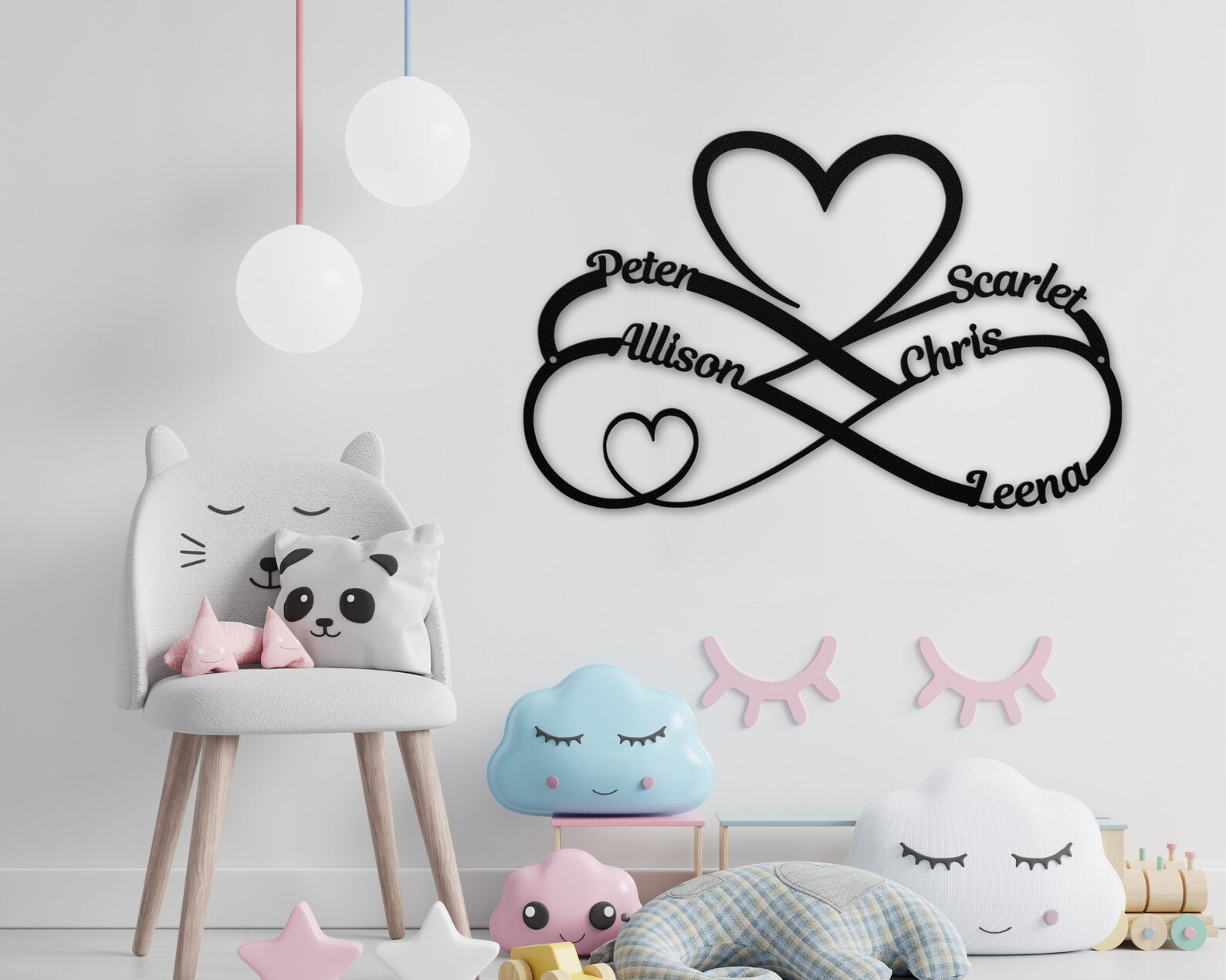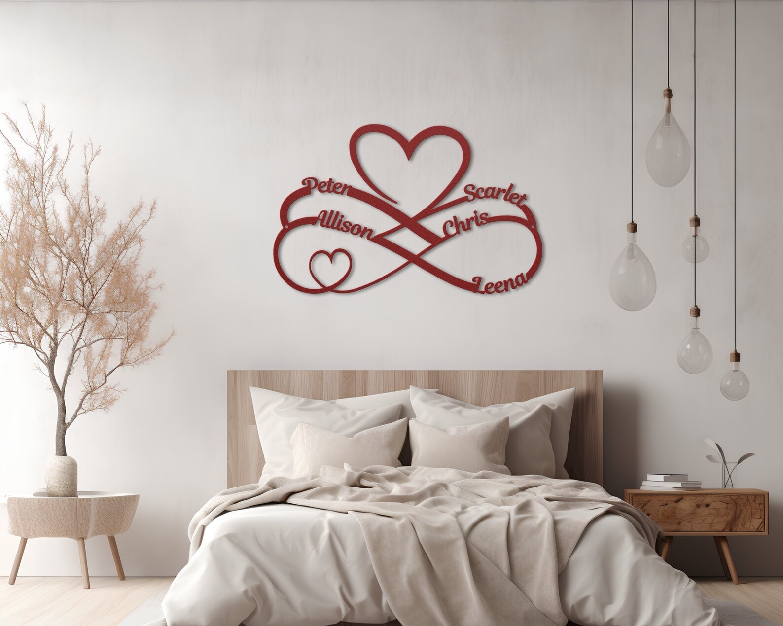 Add a heartfelt touch to your home decor with our 5 Names Infinity Heart Metal Sign. This custom-made love sign will instantly infuse love and warmth into any room, making it perfect for over the bed decor. Celebrate your everlasting love and create a lasting impression with this unique anniversary gift. Not only is this a beautiful family keepsake, but it also makes a wonderful gift for mom. Personalize this metal sign with the names of your loved ones, creating a piece that is as unique as your family9;s bond.