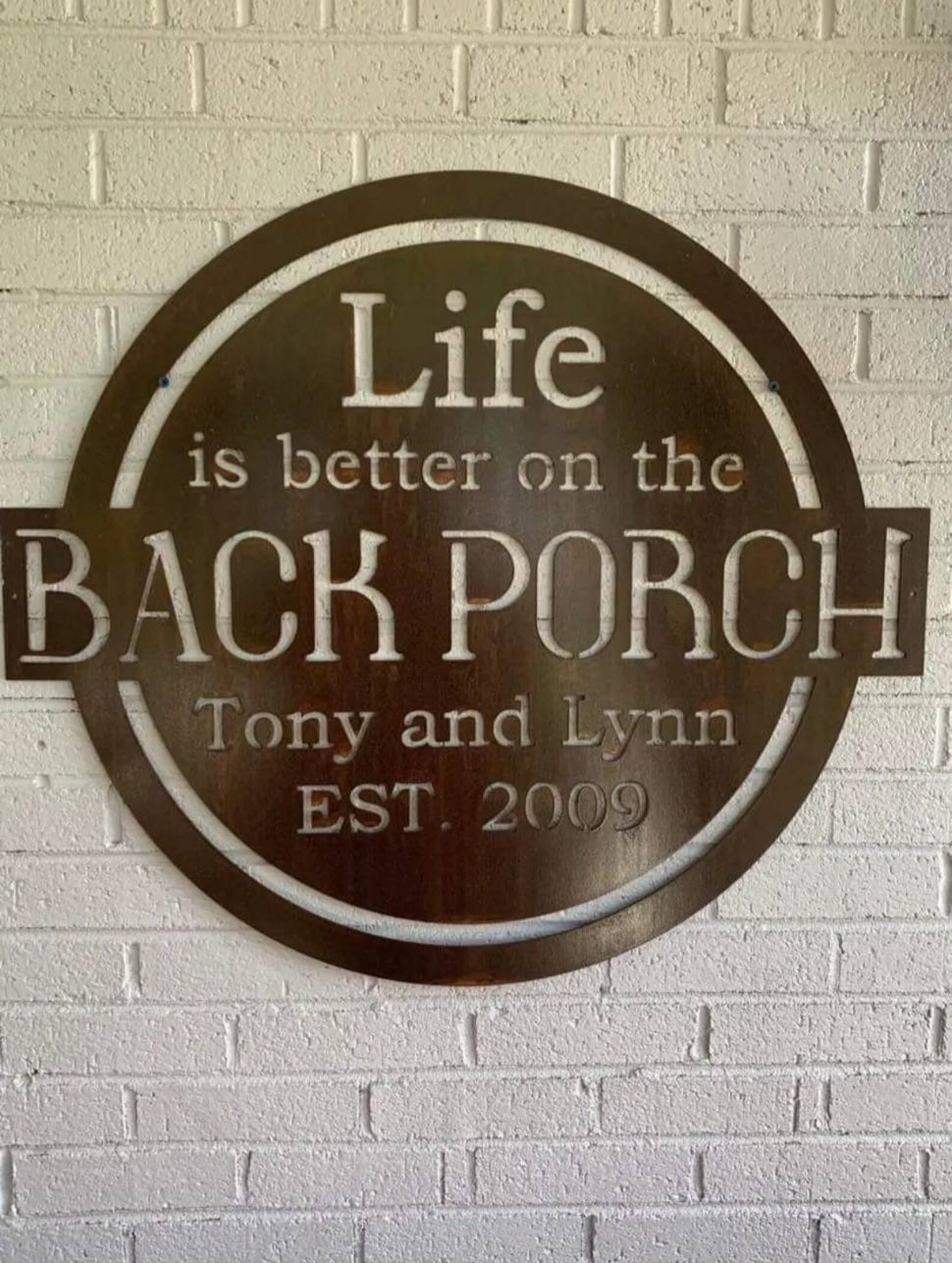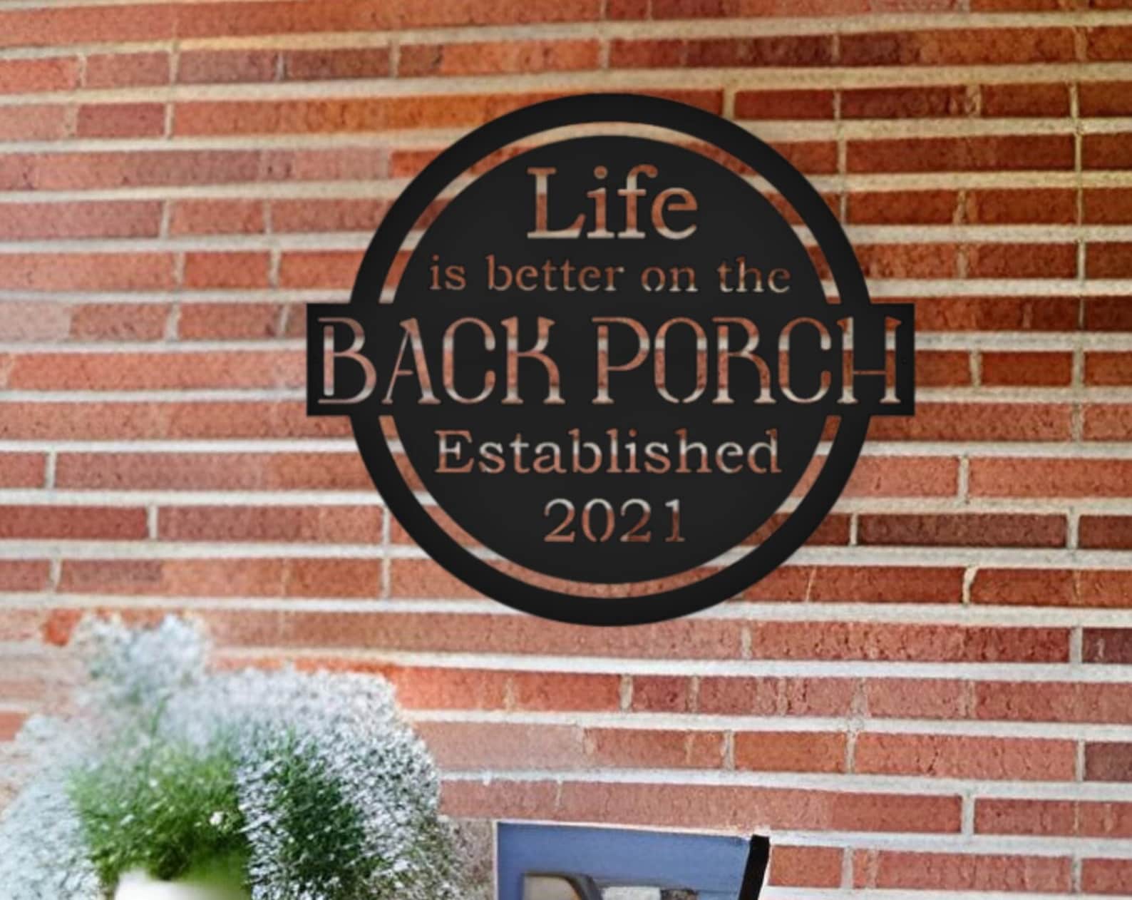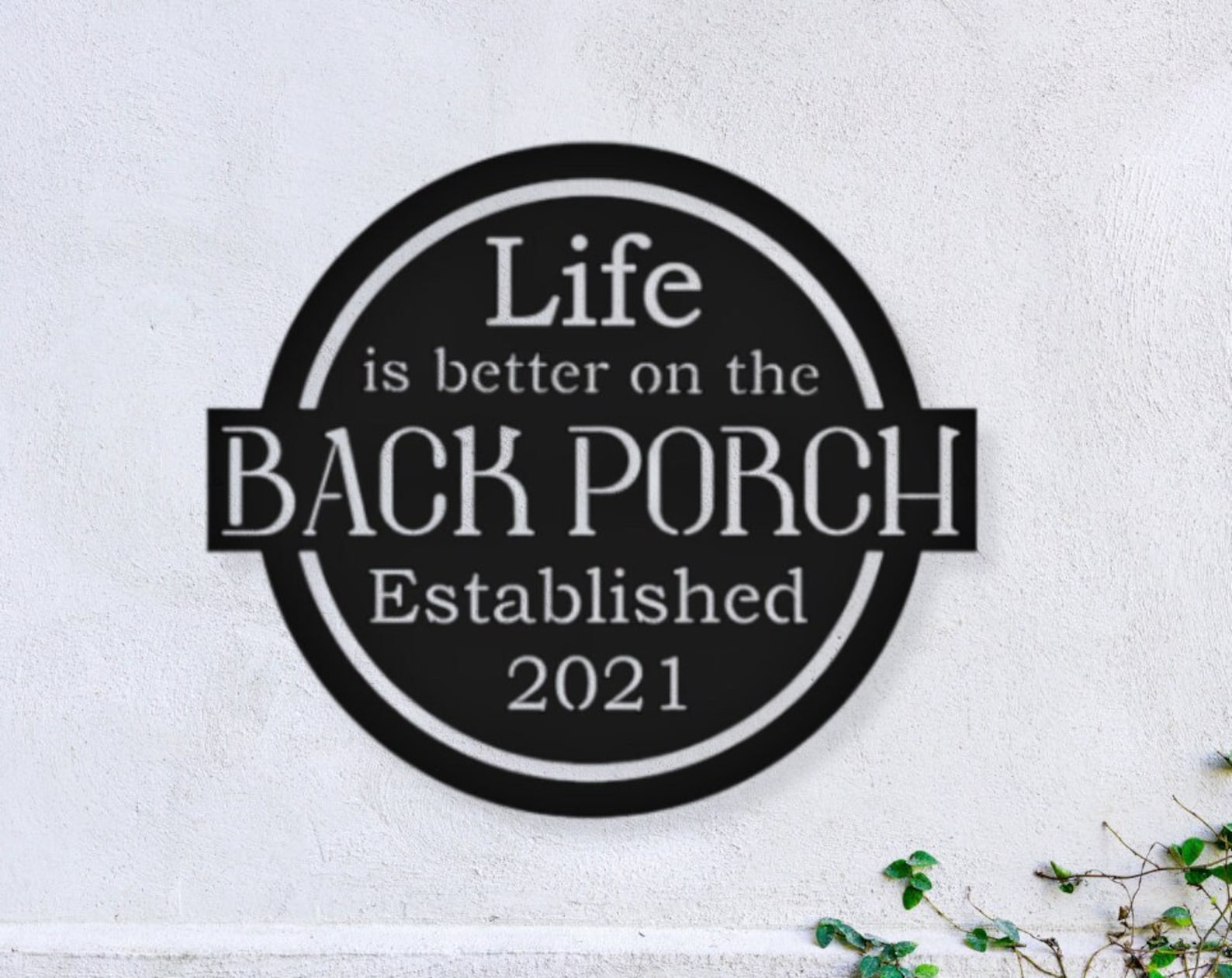 Personalize Life is better on the Back Porch Metal Sign to your home! It is made out of 16-gauge metal and is powder coated for durability. It is weather resistant, so it is perfect for your back porch! This would make a great wedding gift, birthday gift, gift for couples, housewarming gift, gifts for her, and anniversary gifts.