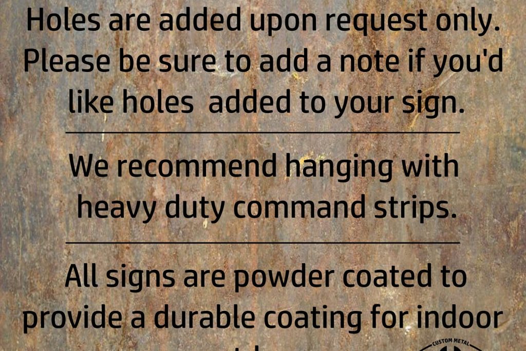 Please Note: Each sign is unique and custom. Some imperfections from the cutting and cleaning process may be found in the metal. All sales are FINAL. Please contact us if you are not completely satisfied with your finished product.