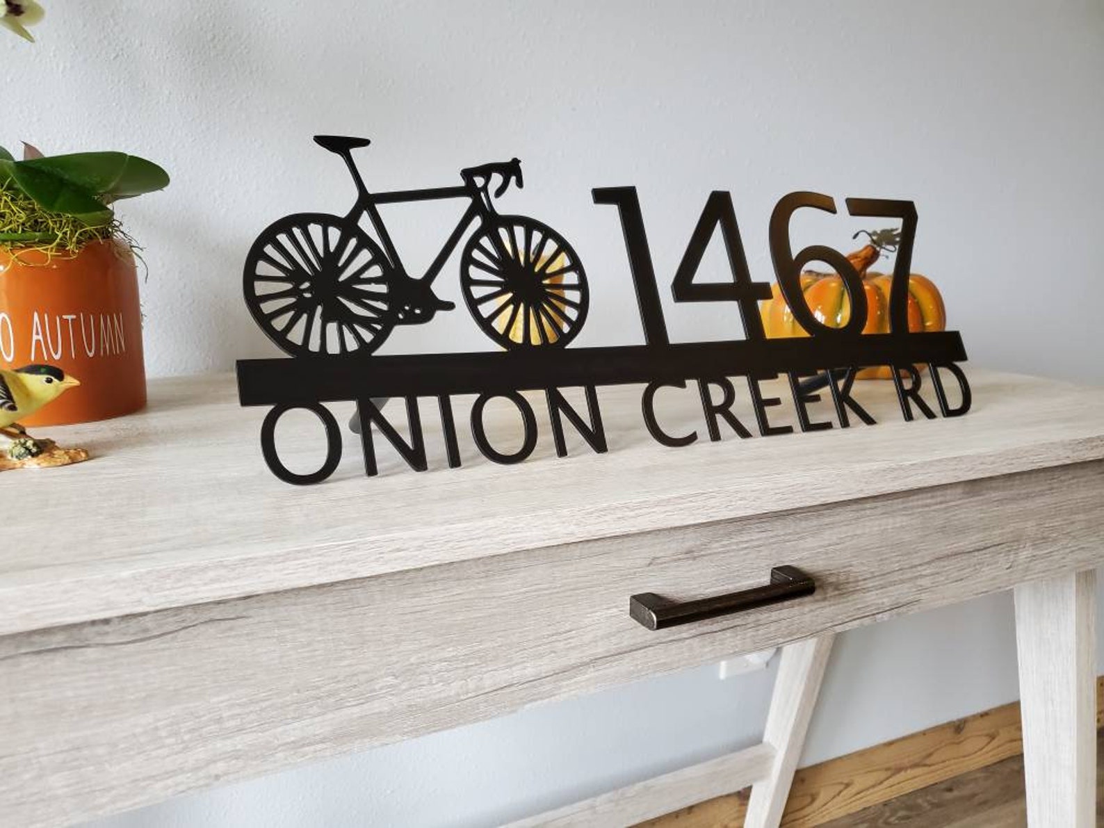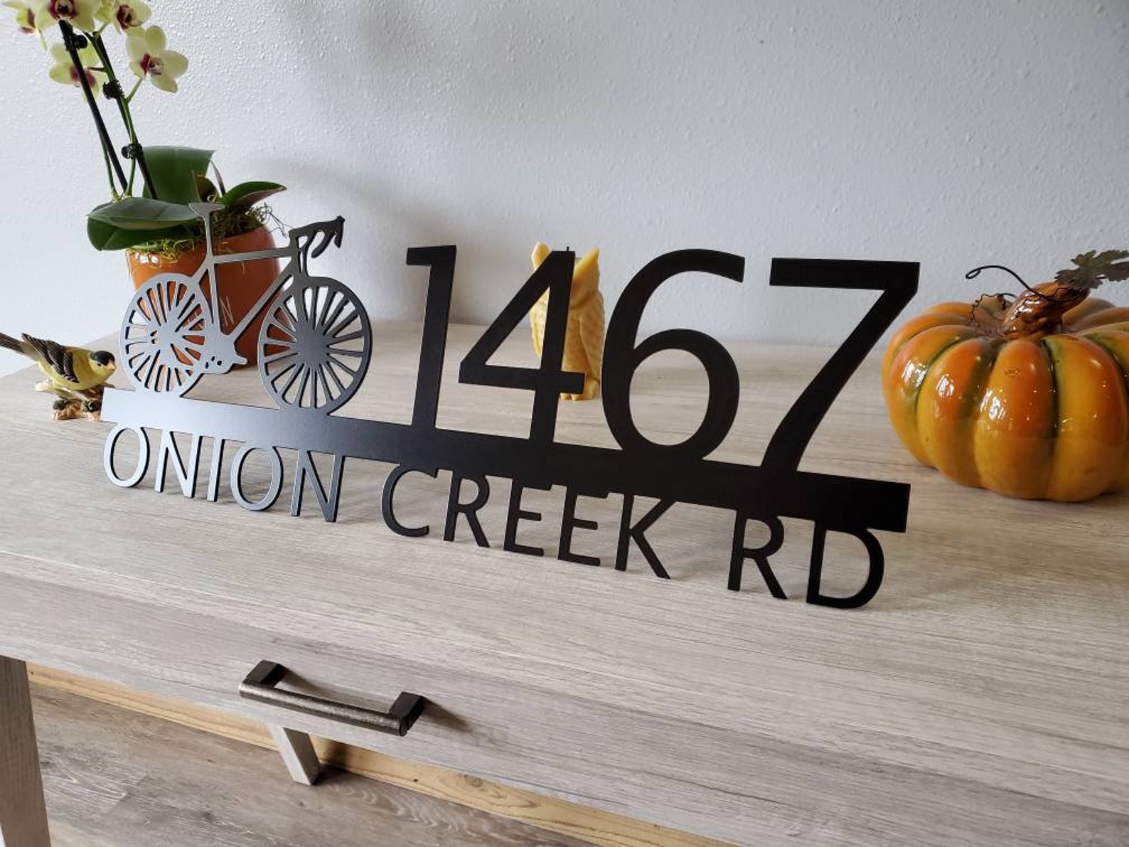 Custom metal personalized address sign/house numbers with bicycle bike for your rock or wall. Finished with highly durable exterior matte black powder coating. This address sign is made out of highly quality durable/sturdy 1/8 inch thick steel(12gauge). This gives the item a very sturdy feel. Item comes as shown in listing photos numbers are offset to the right. We will send you a mock-up of the design. Size is 8 but the height does vary slightly depending on text length.