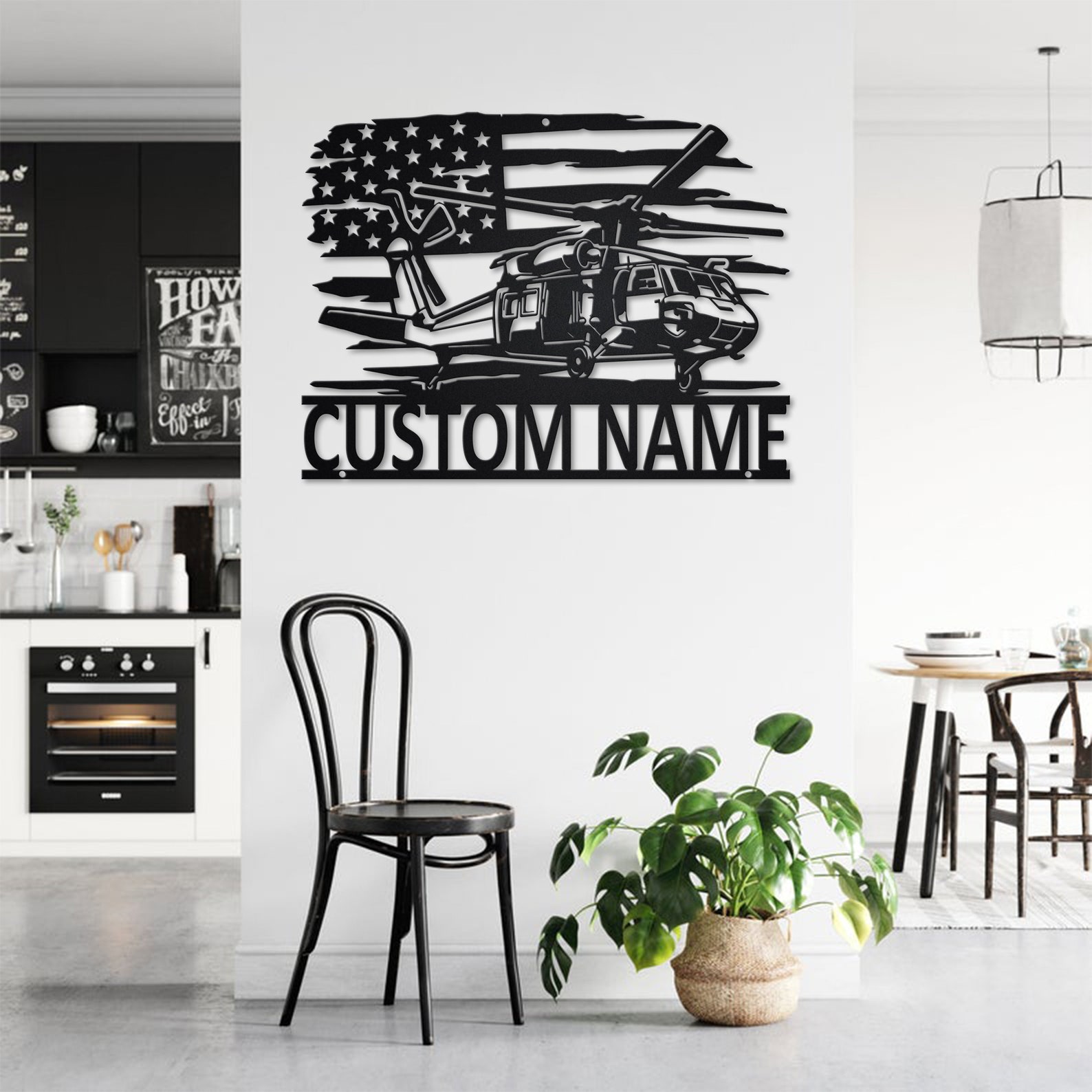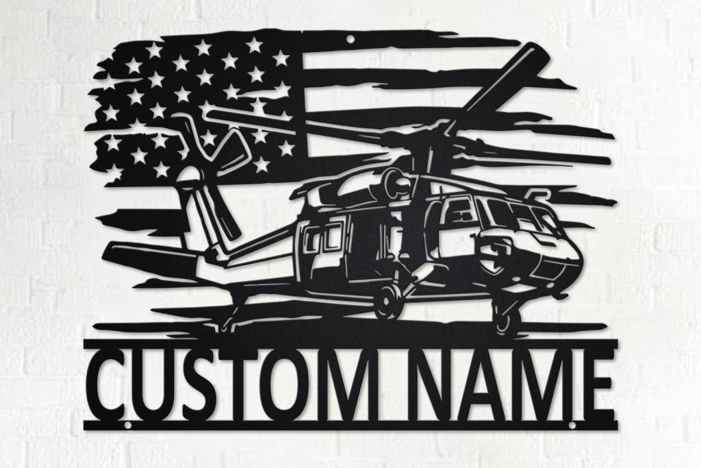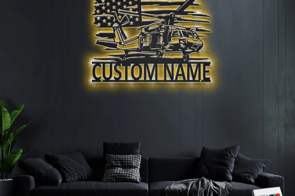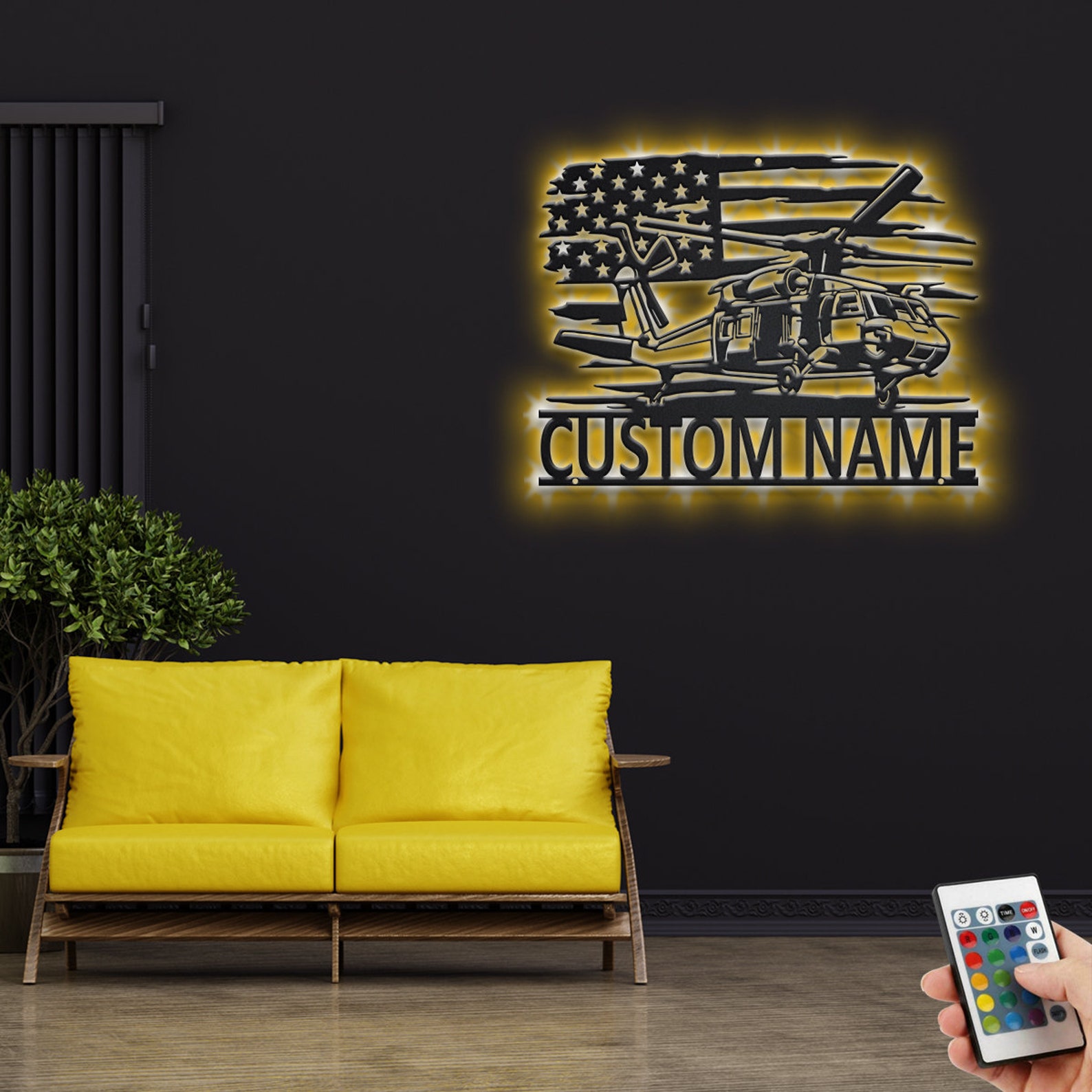 Custom Black Hawk Helicopter Metal Wall Art with LED Light, Personalized Name Sign