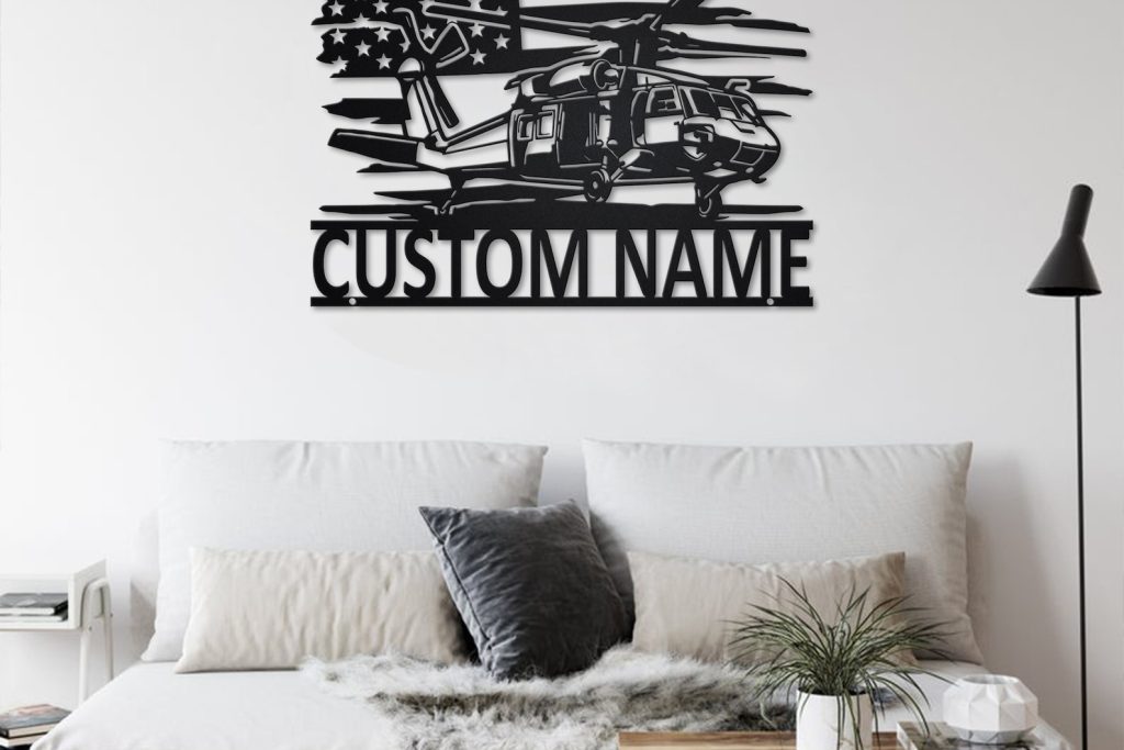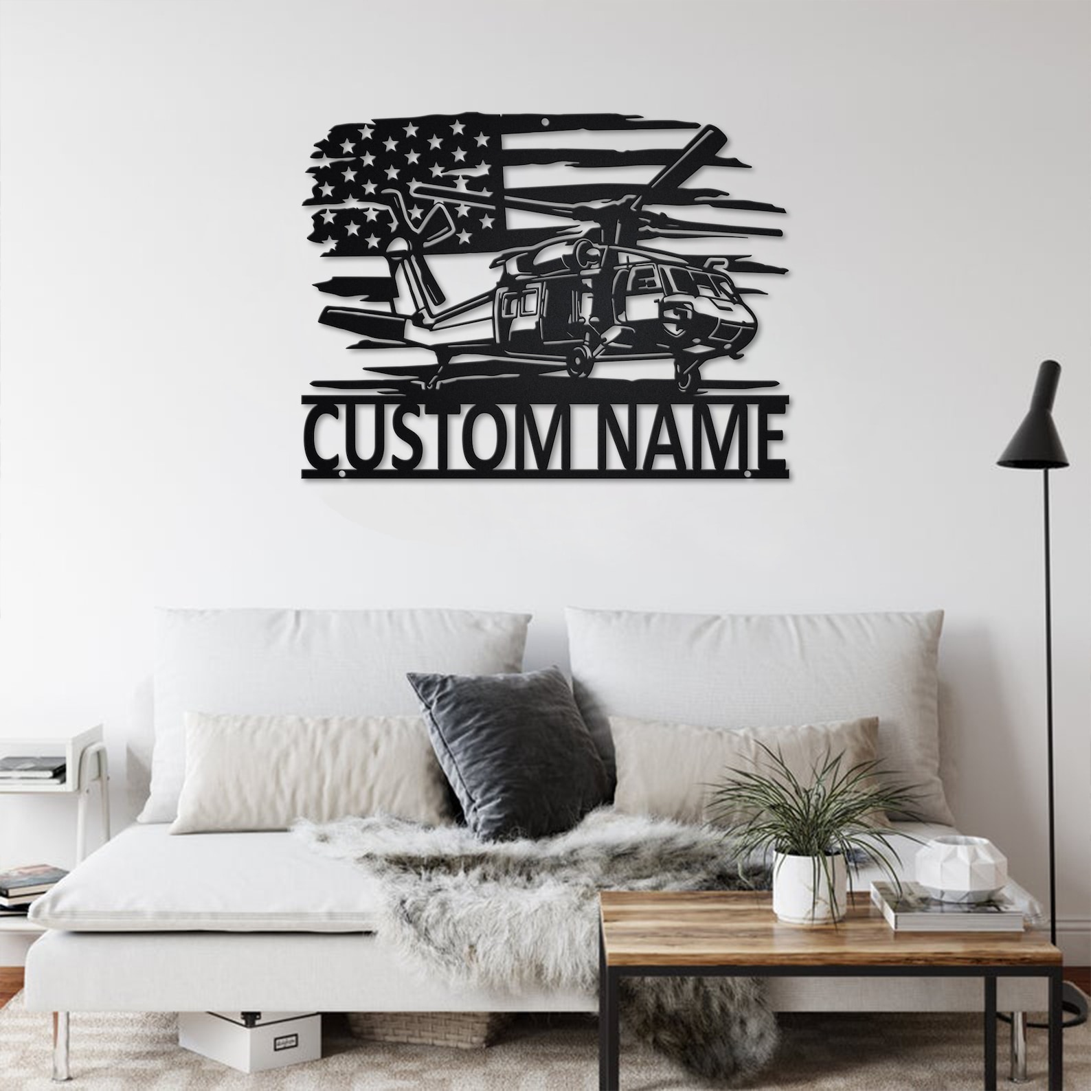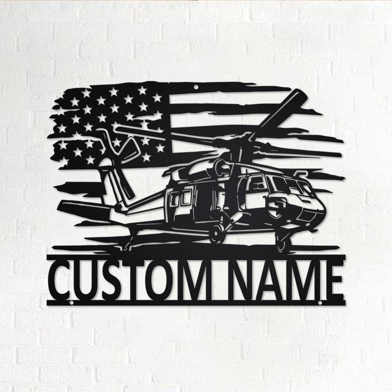 Custom Black Hawk Helicopter Metal Wall Art with LED Light, Personalized Name Sign