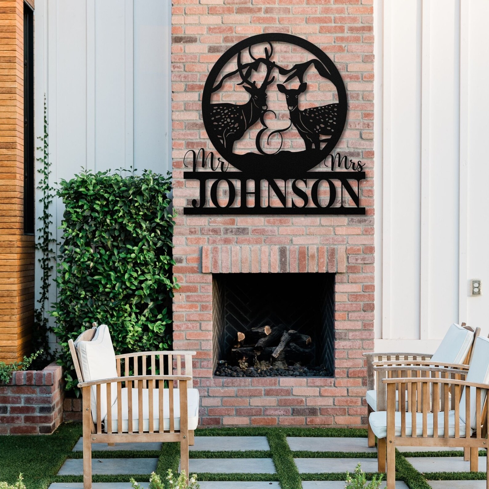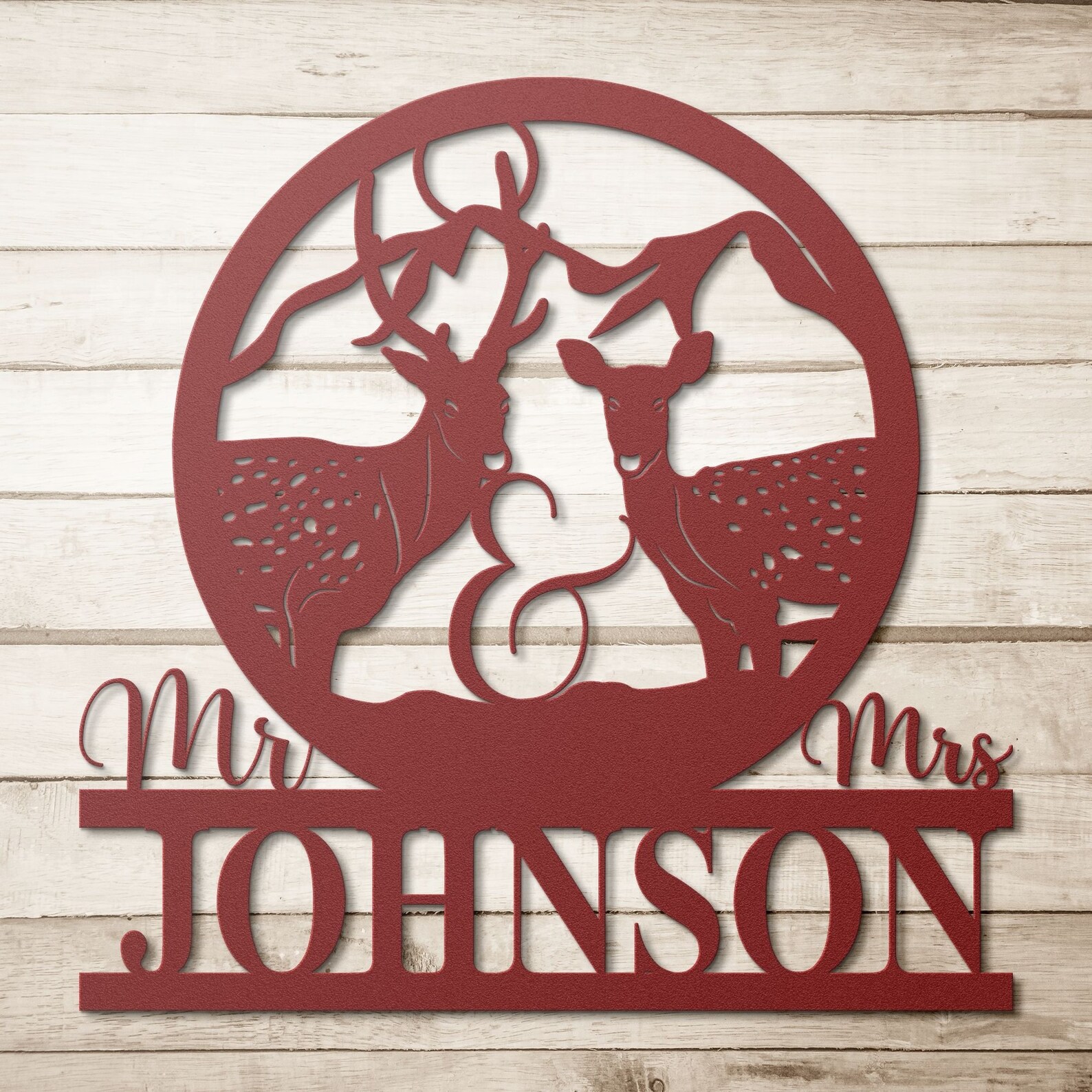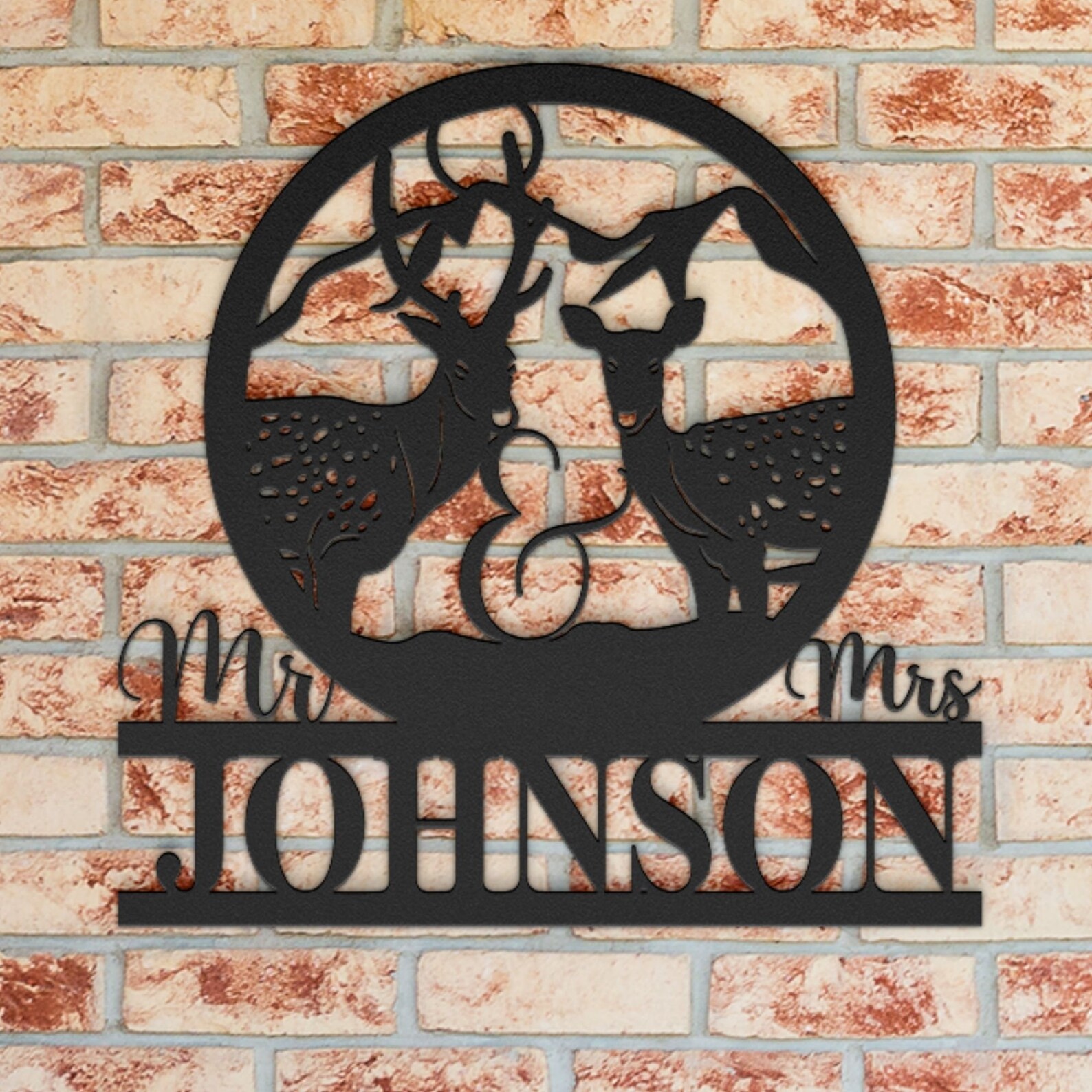 This beautiful piece features a rustic metal deer hunter sign with your loved ones9; last names inscribed in an elegant script.