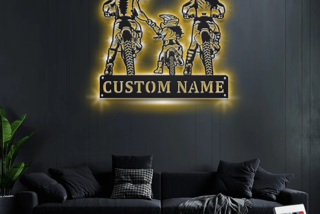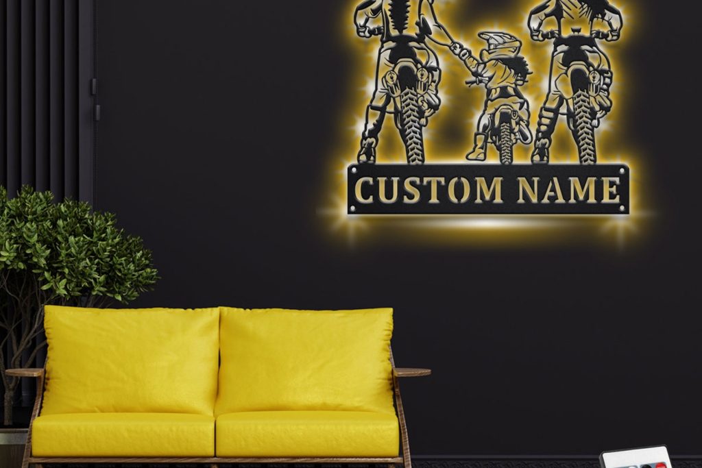 Custom Family Motocross Metal Wall Art – LED Light, Personalized Family Biker Sign