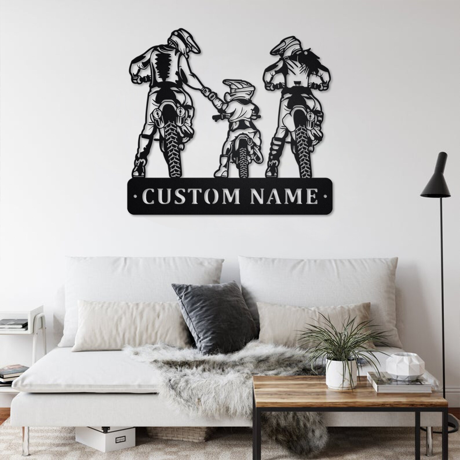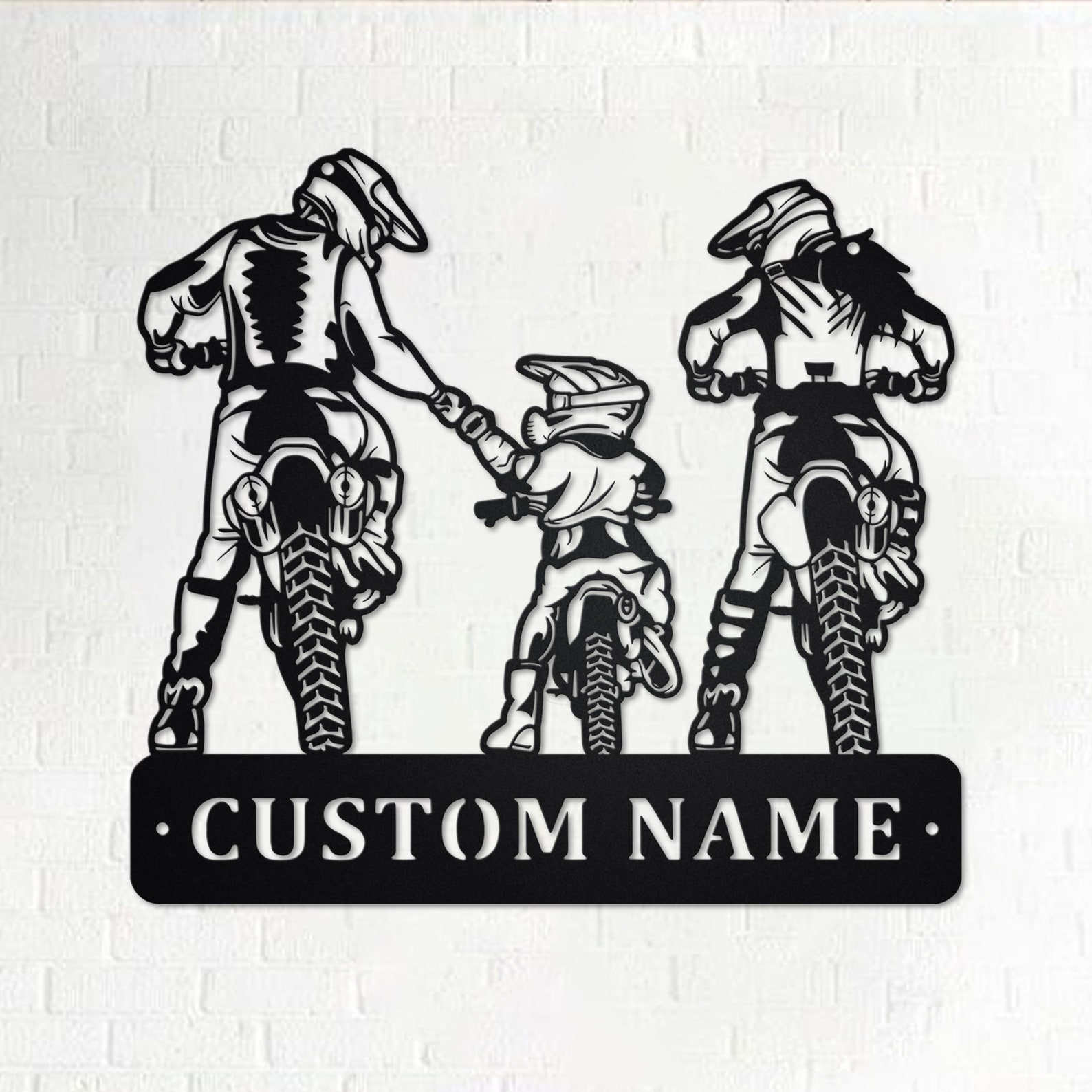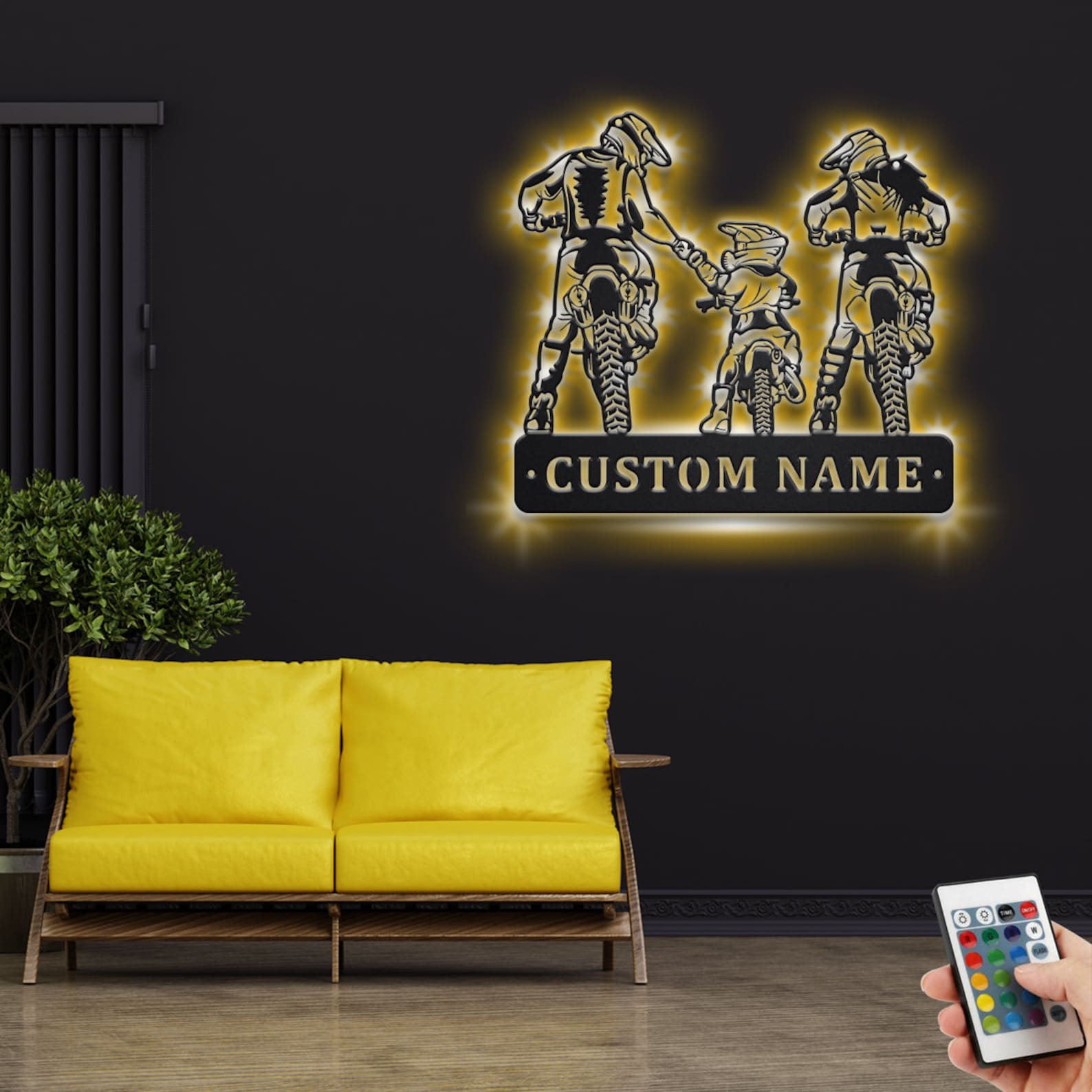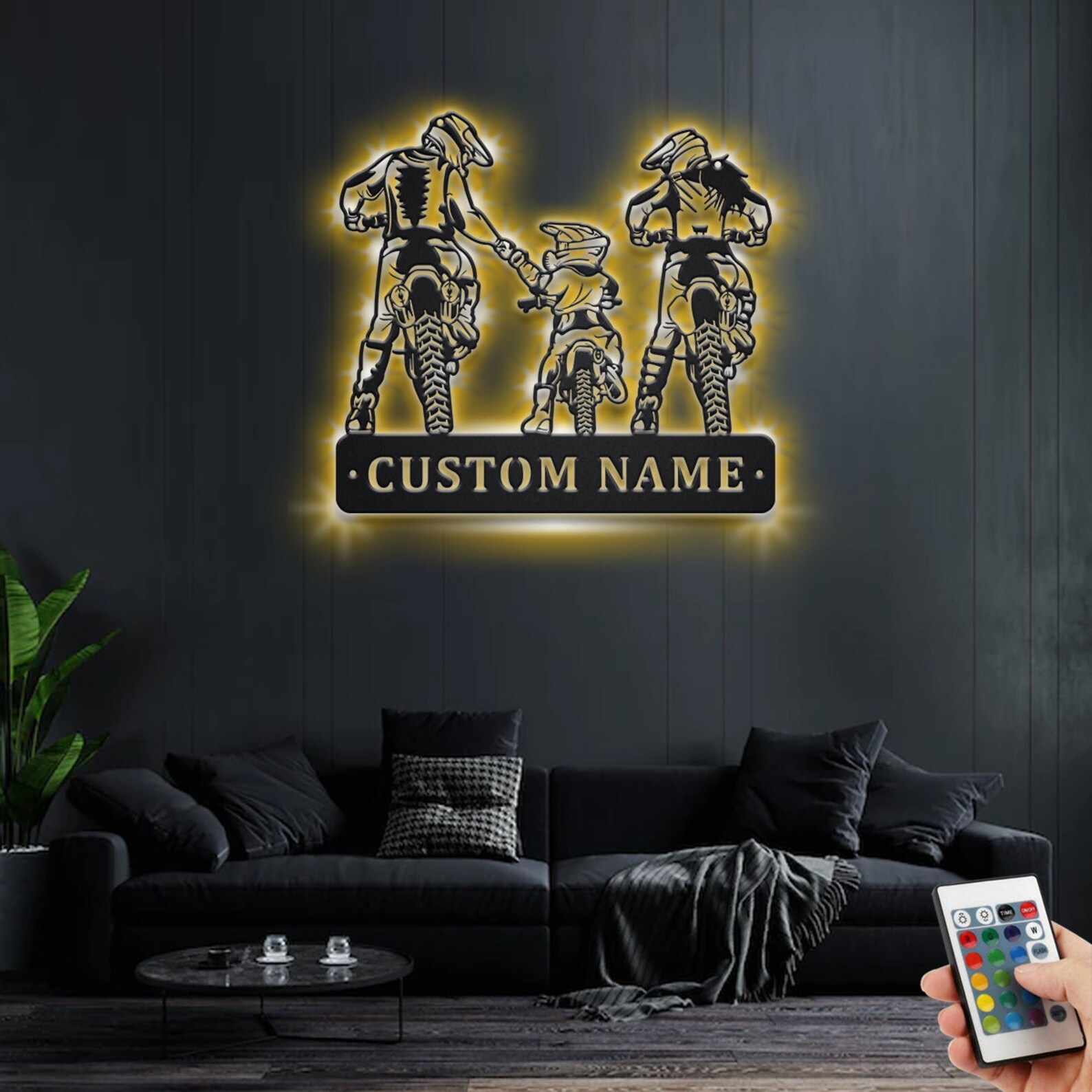Custom Family Motocross Metal Wall Art with LED Light, Personalized Name Sign