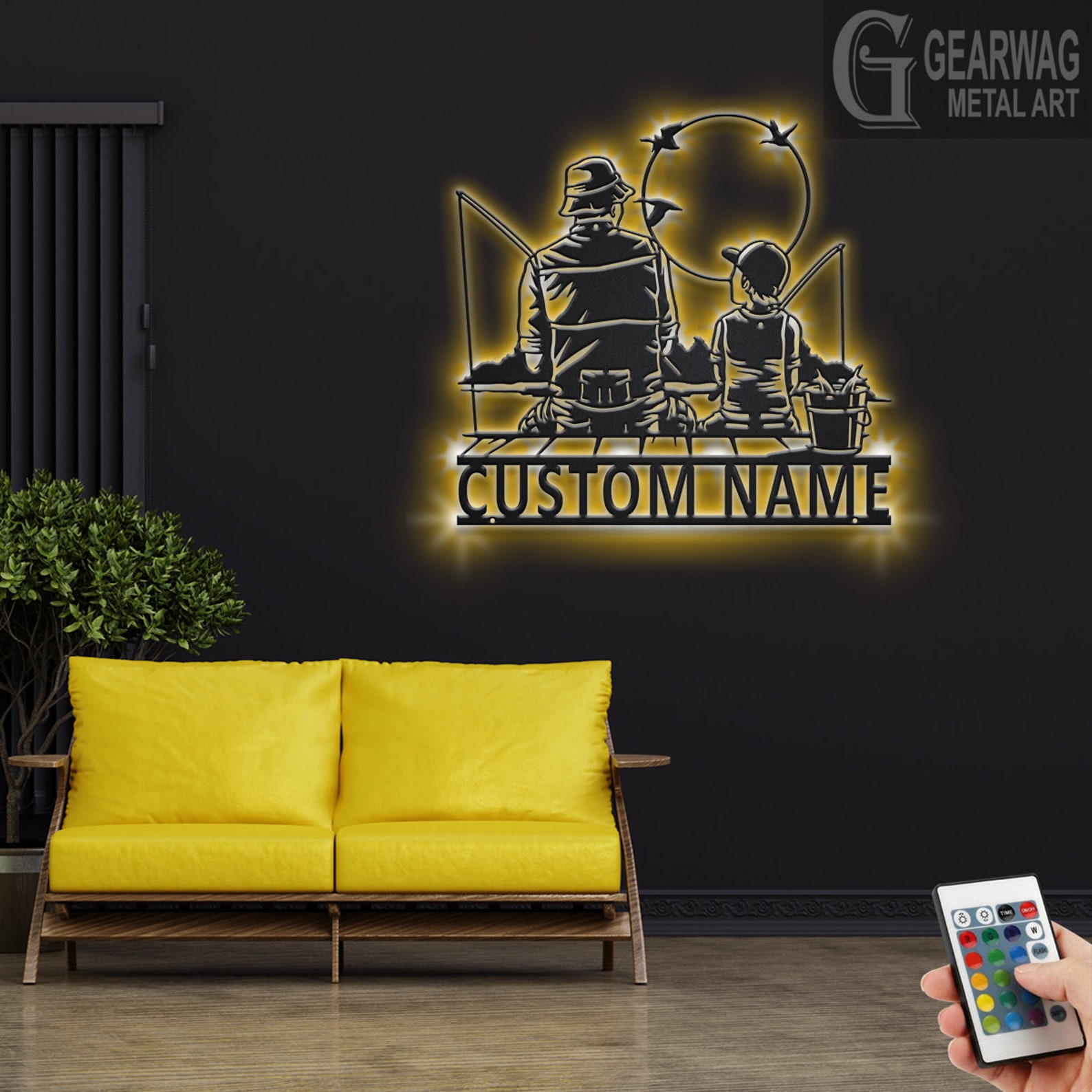 Custom Father and Son Fishing Metal Wall Art with LED Light