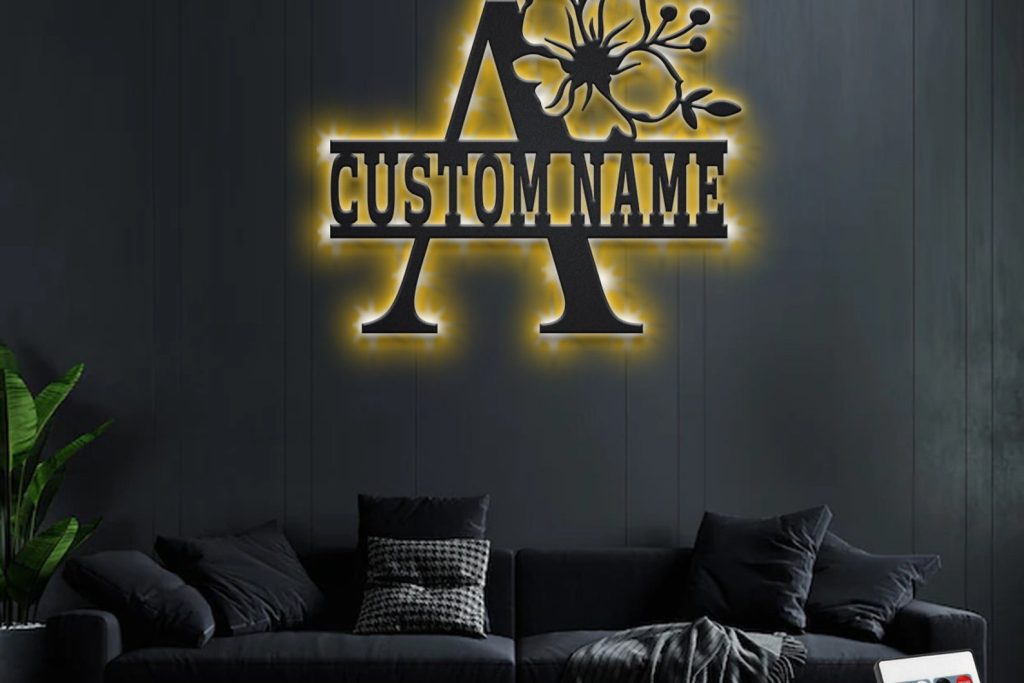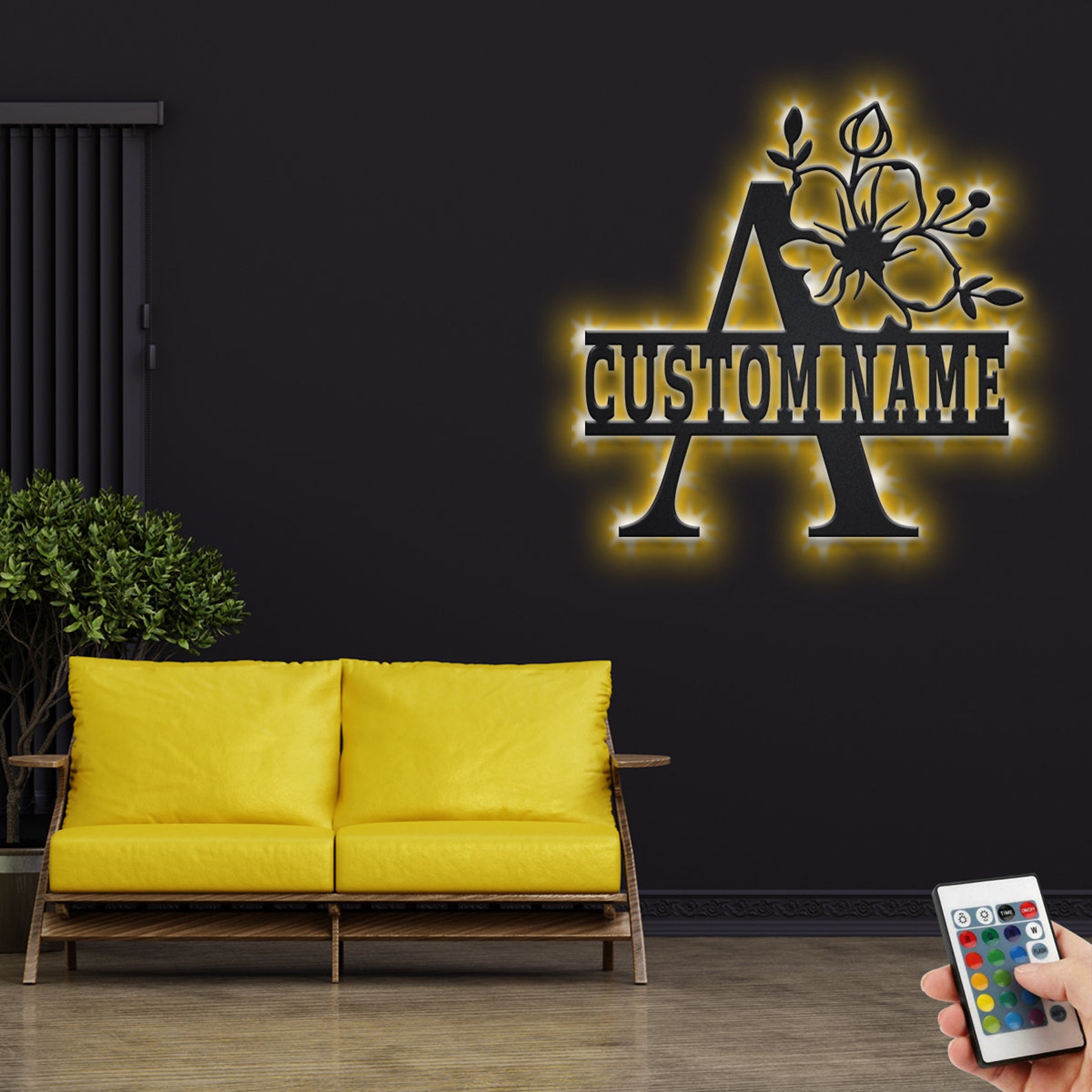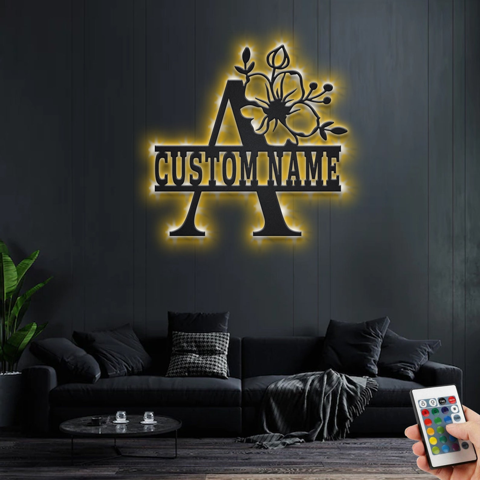 Custom Floral Alphabet A Metal Sign with LED – Family Name Decor