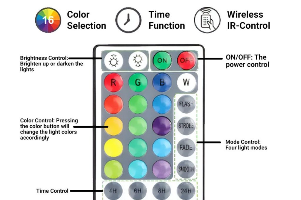 – Remote control: Allows you to easily control the lights, on and off, select from 16 vivid colors, modify the brightness, cycle through various colors, and set a timer.