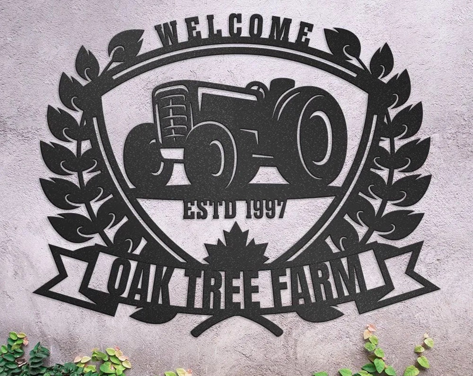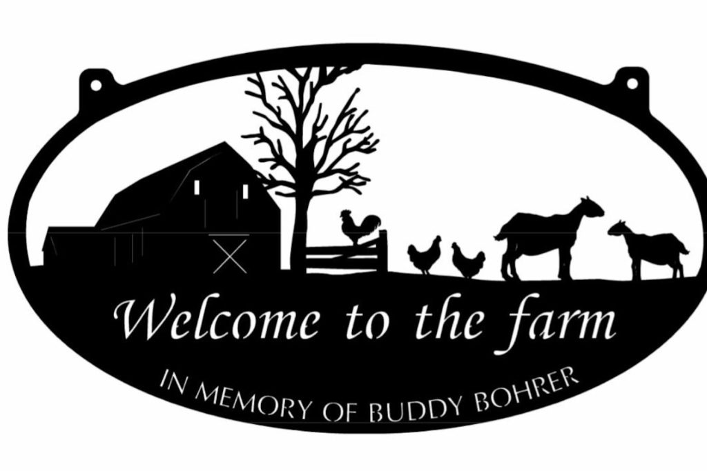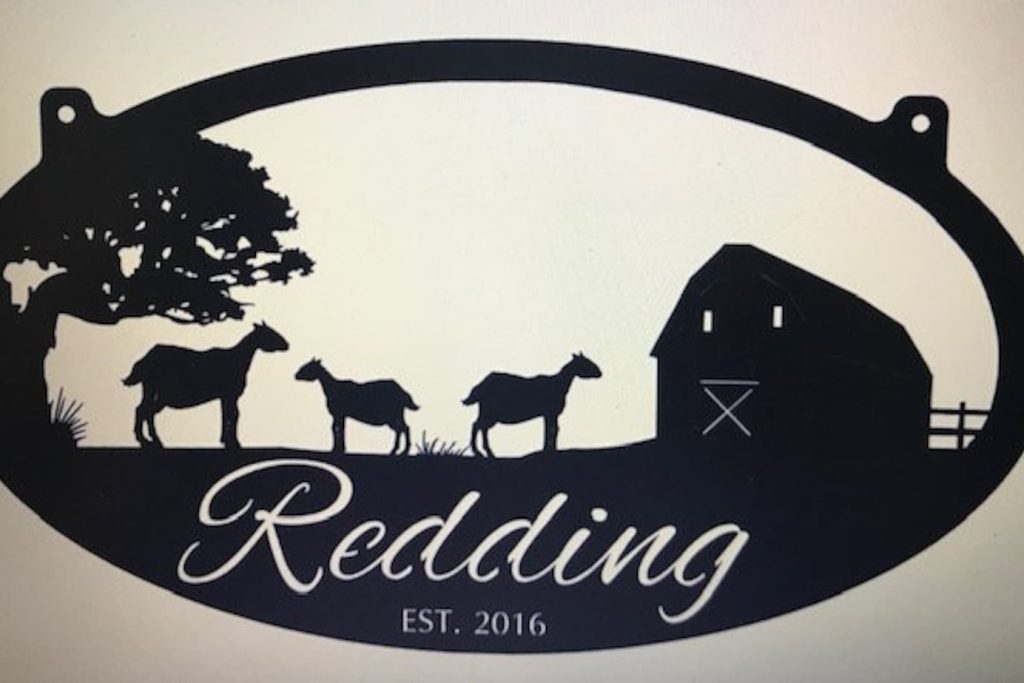 Rustic, personalized metal sign with barn and goat scene. Measures 28" x 16". Powder coated black or beautiful rustic acid finish and clear coated . Makes a very attractive entrance sign.Incl with the price is customizing with your name.Our finish is a baked on powder coat for a very long lasting durable finish.