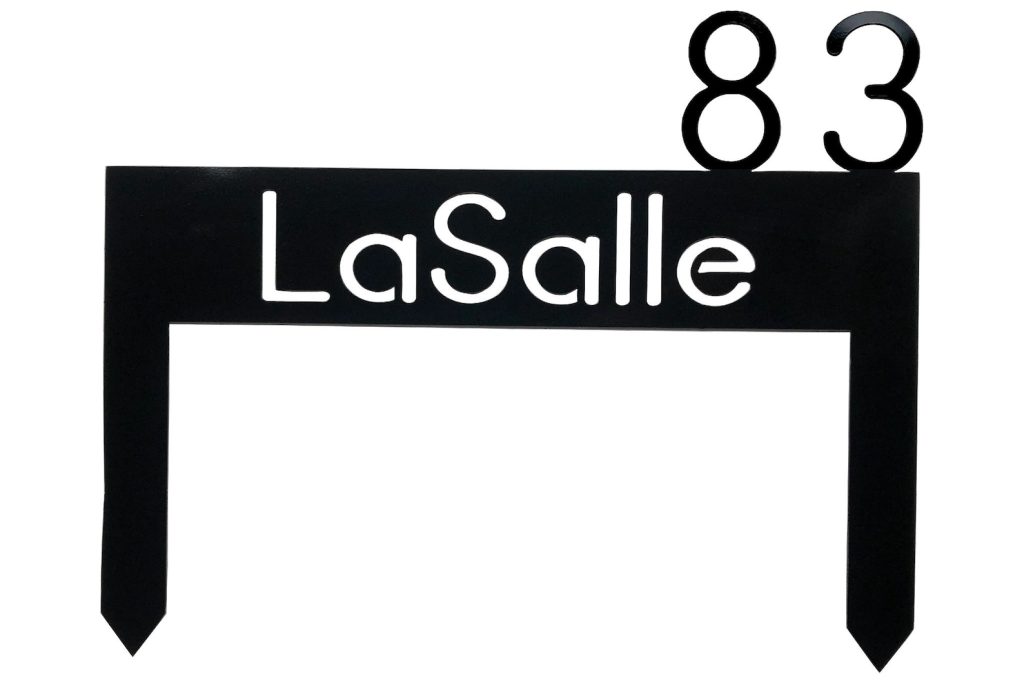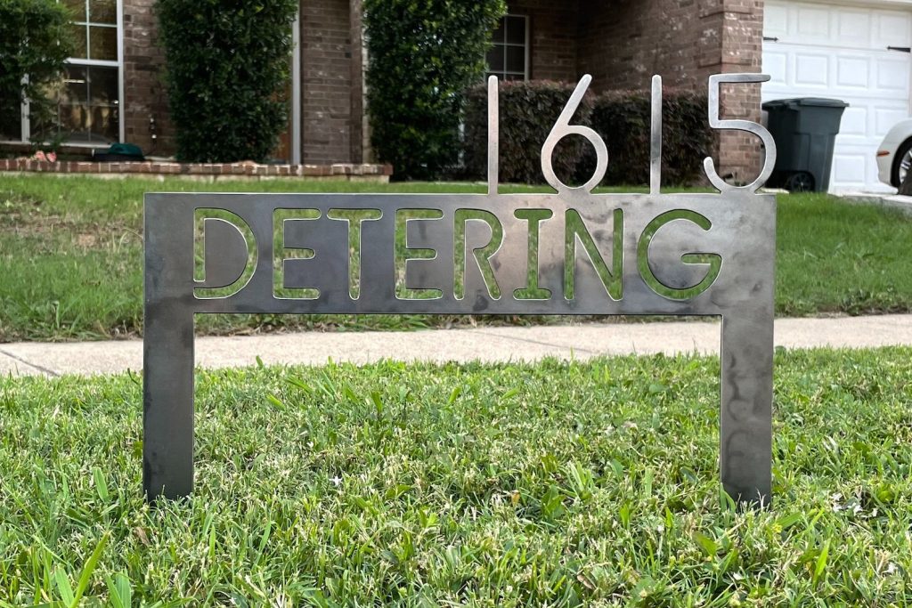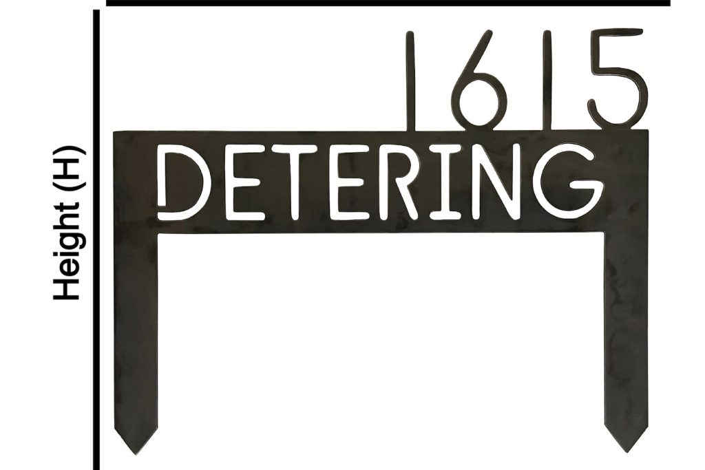 This custom lawn address sign is made out of high quality 16 gauge, locally sourced metal, and comes with integrated stakes for easy insertion in your yard!