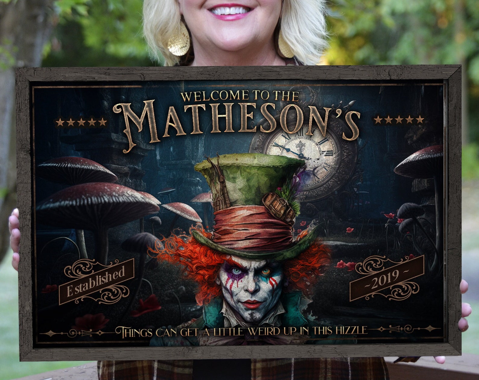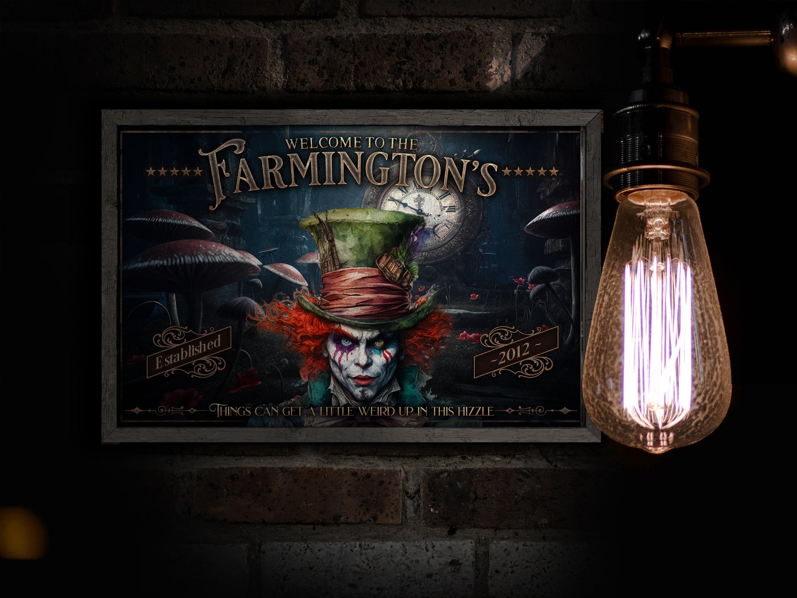 This Alice in Wonderland Mad Hatter Last Name Sign makes a great gift for that special person or even yourself. Display this vintage Mad Hatter sign anywhere in your home. It adds warmth and humor to any wall.