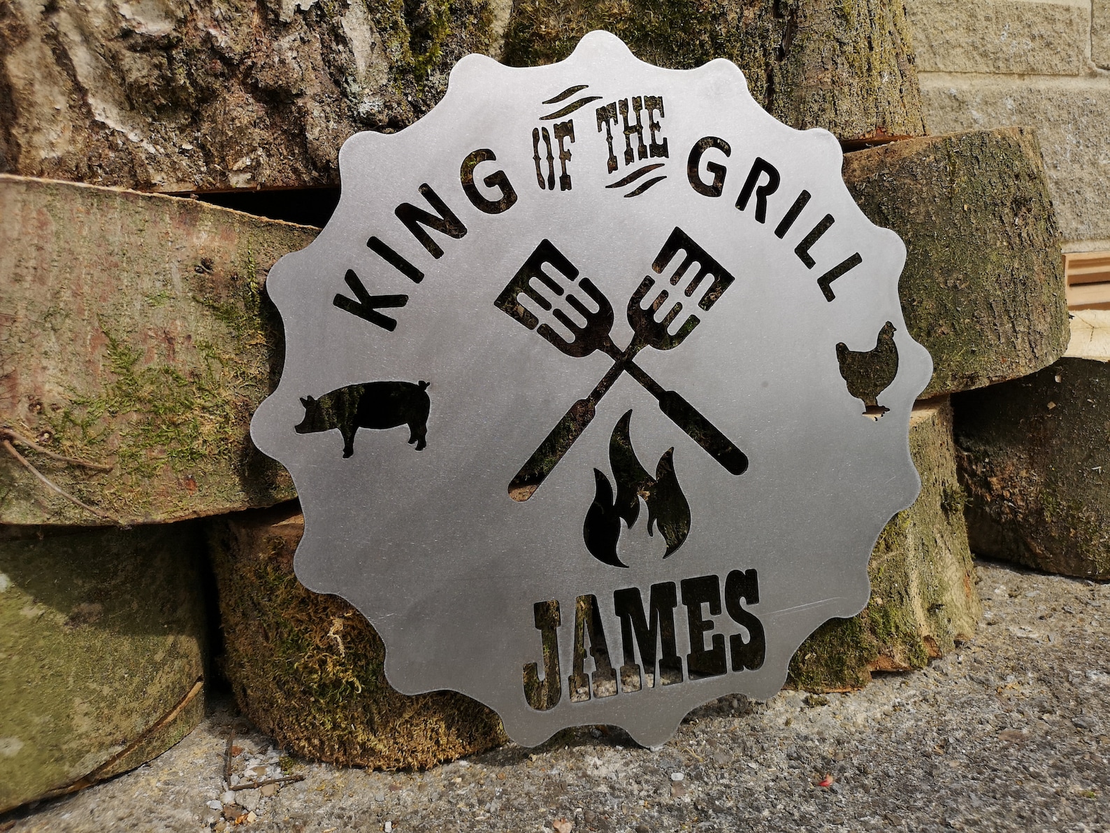 Awesome BBQ sign customized to the Kings name at the bottom. Tell the world that your the BBQ king! We can supply with, or without invisible stud mounting hardware or a simple hook on the rear.