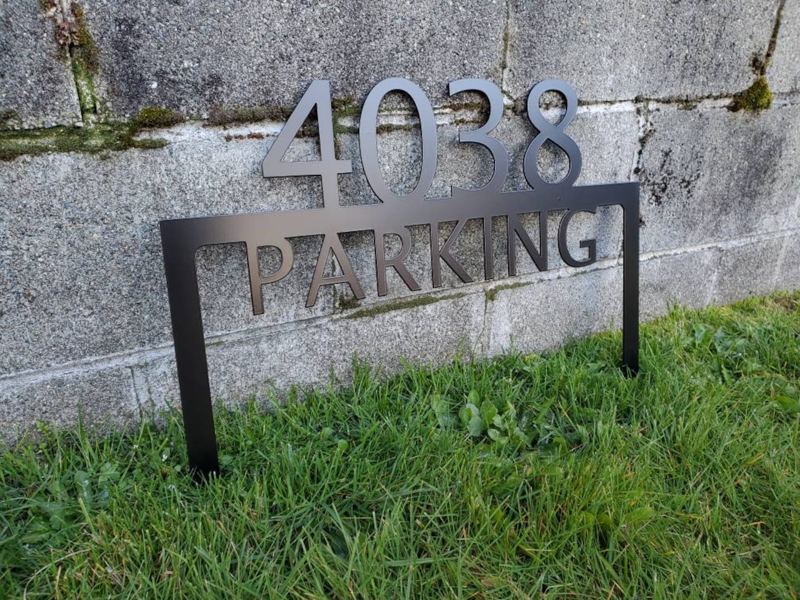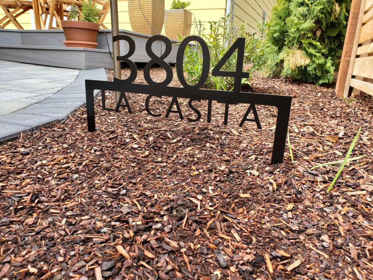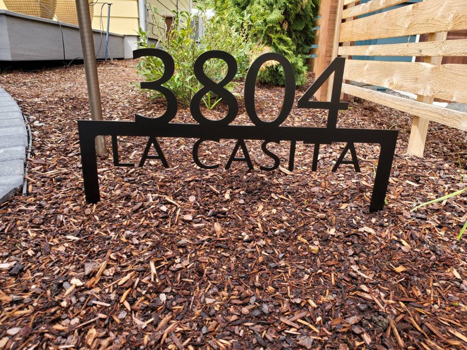 Custom metal personalized address sign/house numbers yard stake sign. Finished with highly durable exterior matte black powder coating. This address sign is made out of highly quality durable/sturdy 1/8 inch thick steel(12gauge). This gives the item a very sturdy feel. Item comes as shown in listing photos numbers and text is centered. Size is 15.5 inch tall by 22 inch wide.
