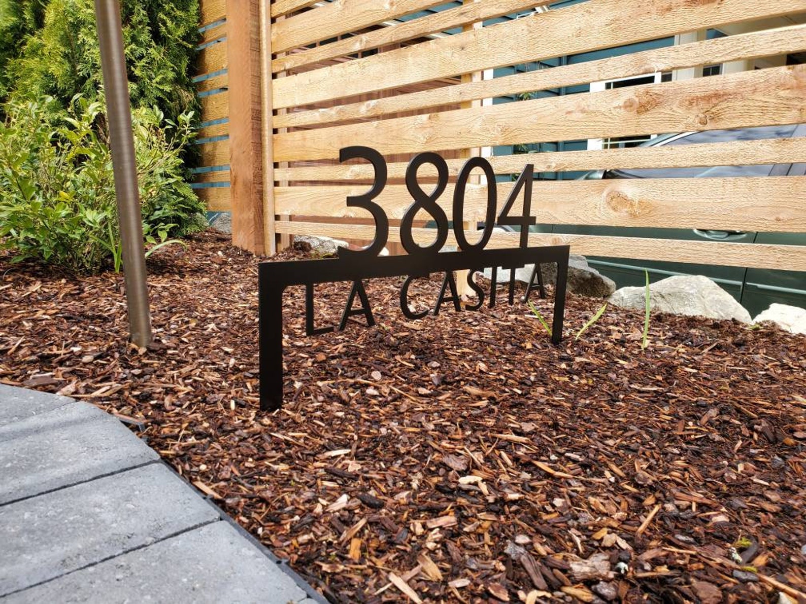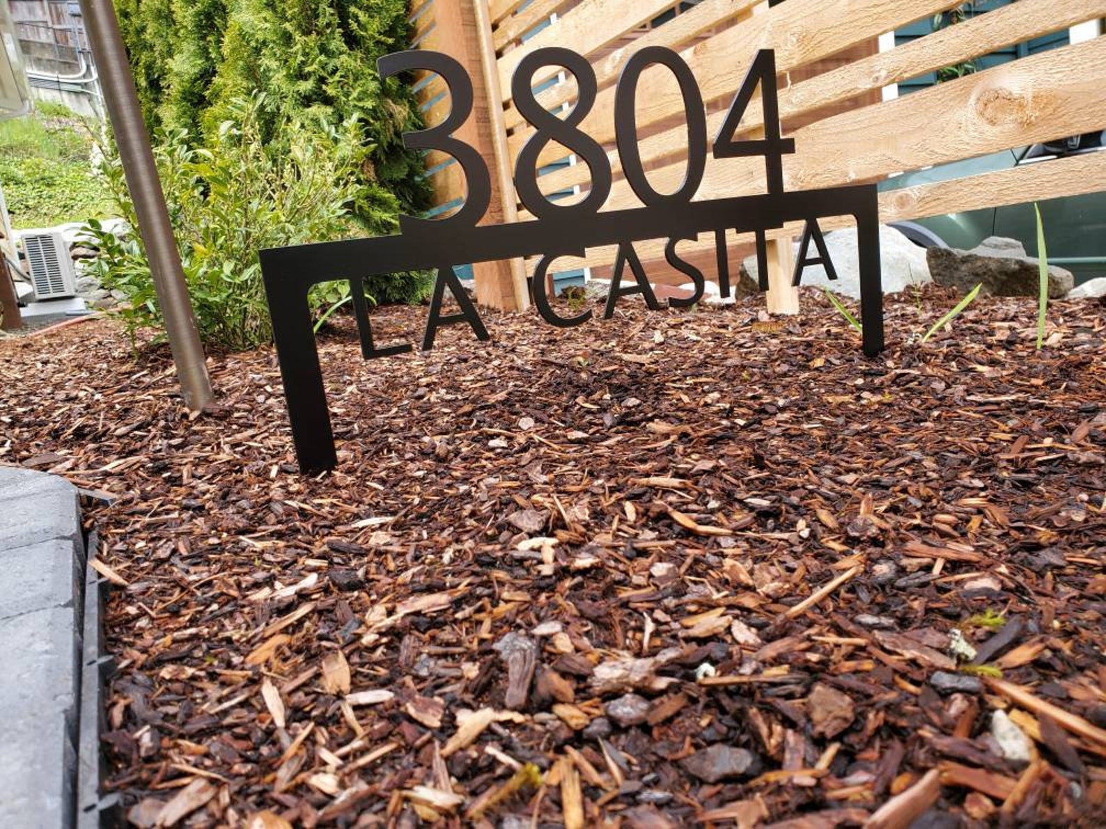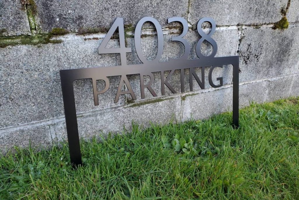 Custom metal personalized address sign/house numbers yard stake sign. Finished with highly durable exterior matte black powder coating. This address sign is made out of highly quality durable/sturdy 1/8 inch thick steel(12gauge). This gives the item a very sturdy feel. Item comes as shown in listing photos numbers and text is centered. Size is 15.5 inch tall by 22 inch wide.