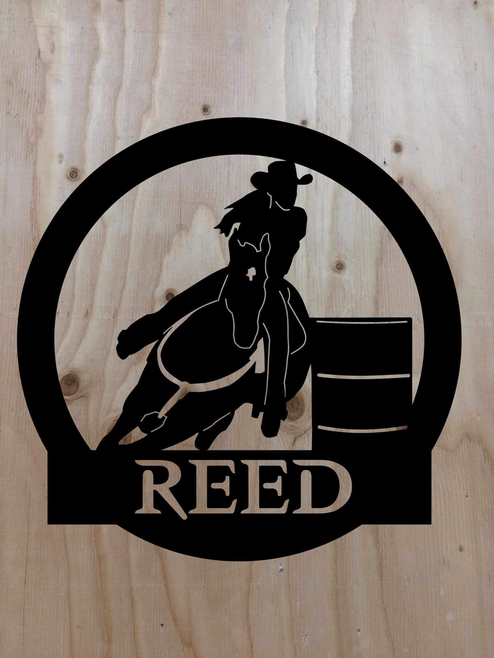 Made in the USA from 16 gauge steel. CNC plasma cut and hand finished. Powder coat for durability. More designs at our facebook page @rmfsigns Reed Machine and Fabrication LLC. Custom names and sizes available. Barrel Racer, Horse, Cowgirl, Rodeo, Western wall decor.