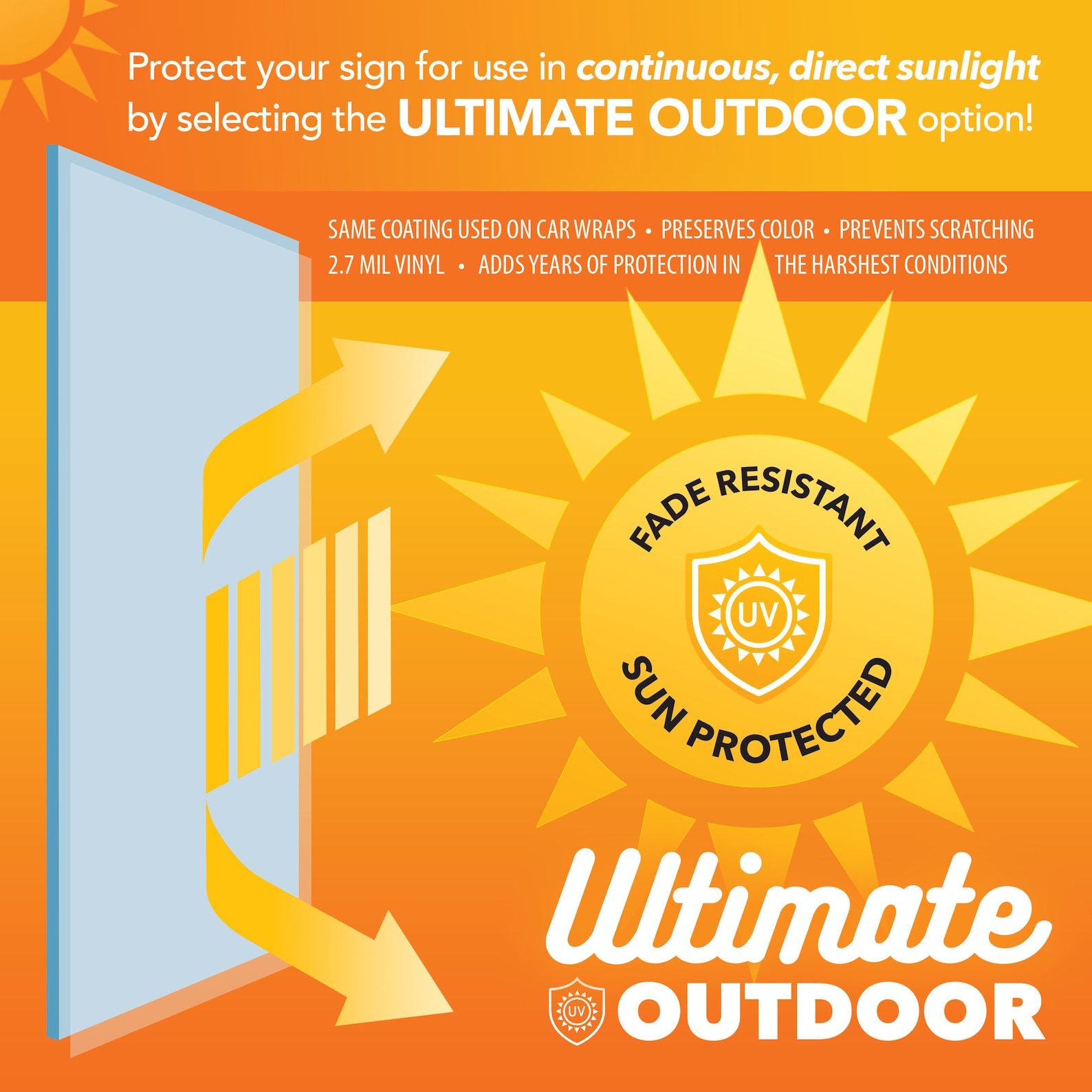 Order the Ultimate Outdoor version if you will be mounting your sign in a place that gets lots of direct sunlight. The Ultimate Outdoor version is made of the same rustproof, painted aluminum as the Outdoor/Indoor model. Then we add a 2.7 mil vinyl coating that blocks the UV rays. This is the same coating used on car wraps to preserve color and prevent scratching. This film will provide protection for 7 years. Ultimate Outdoor FRAMES are coated with polyurethane to shed moisture and block the suns damaging rays.