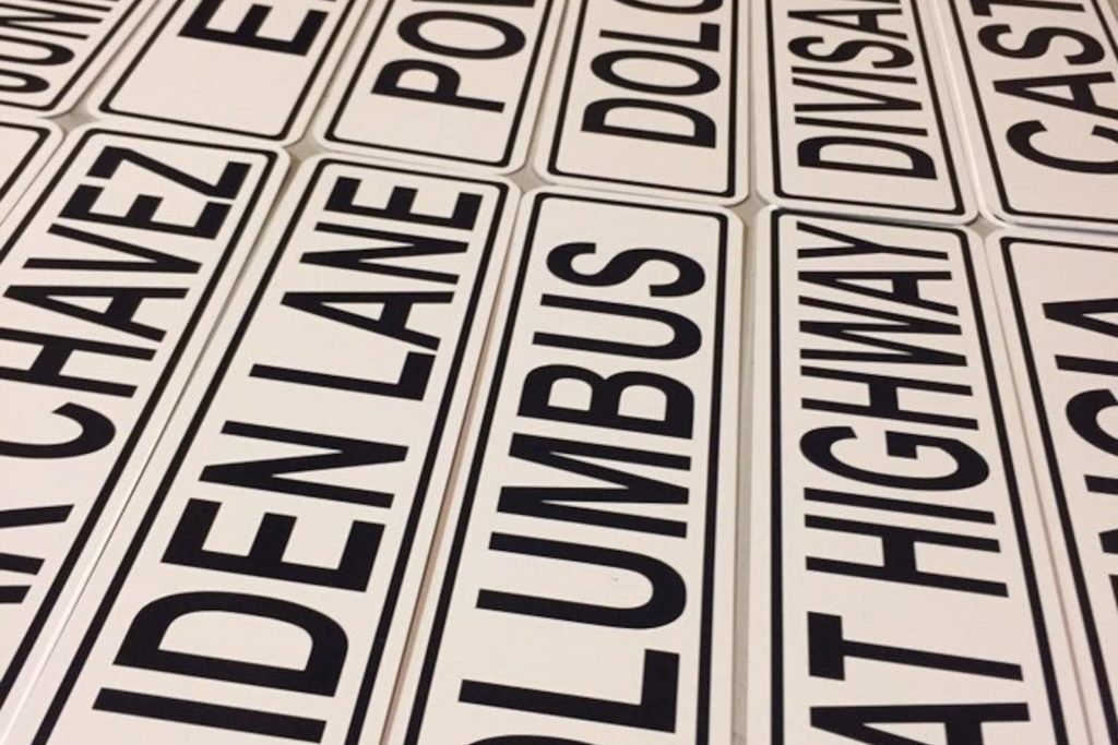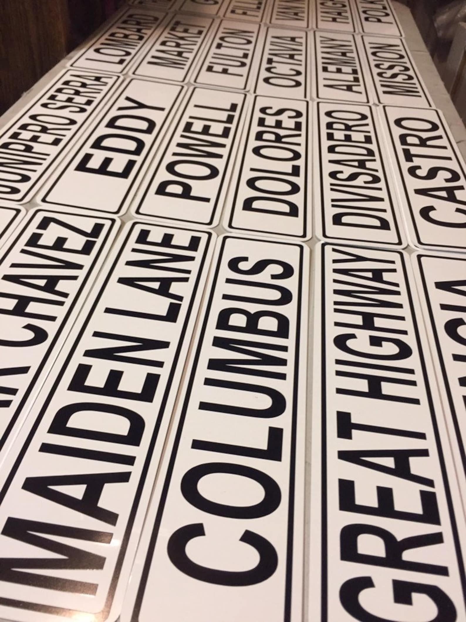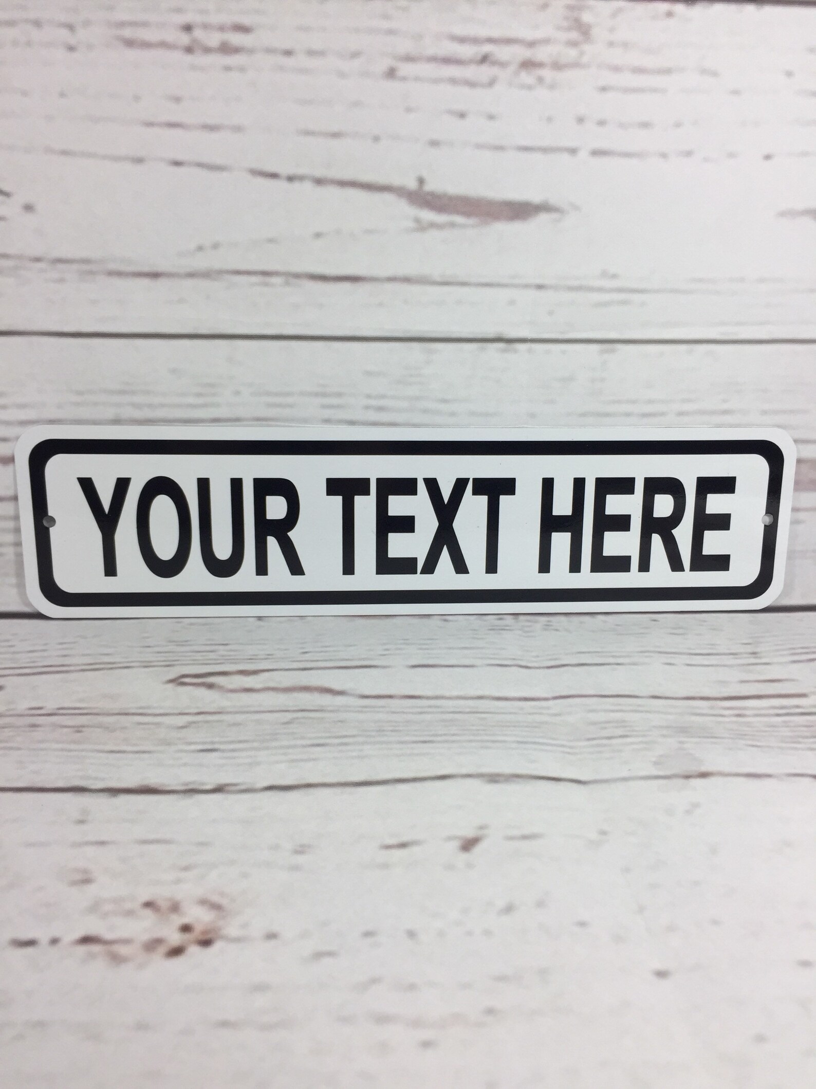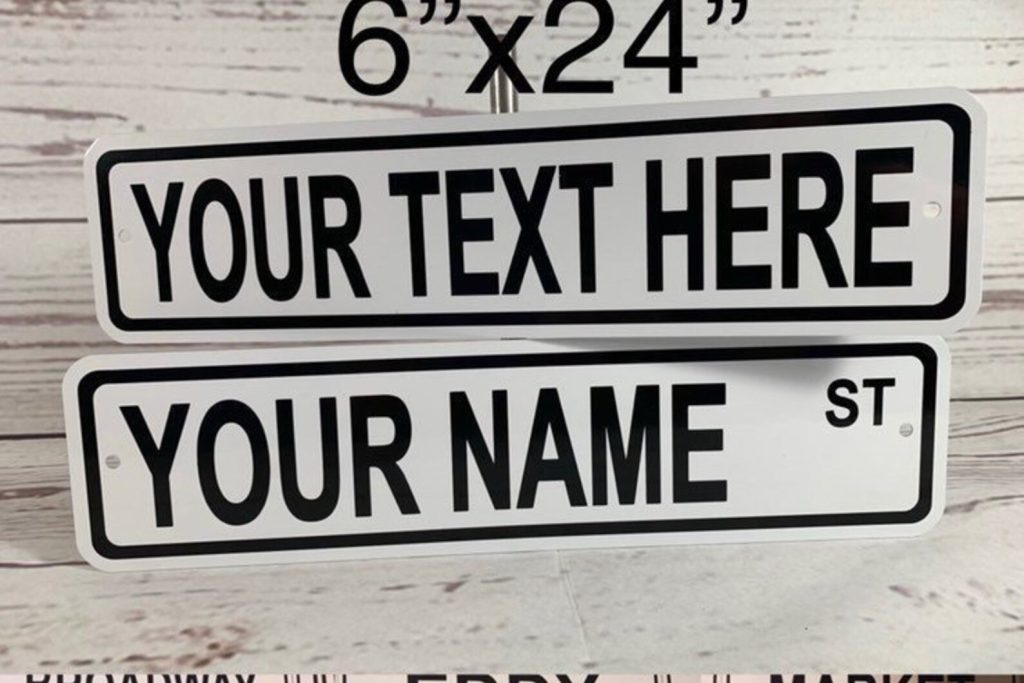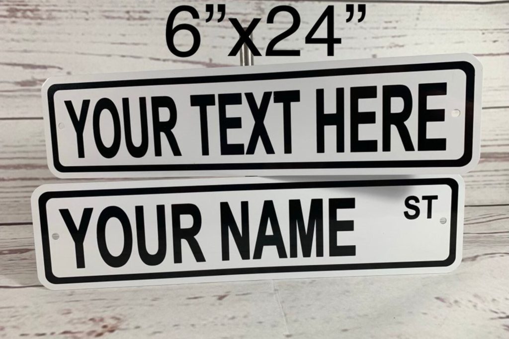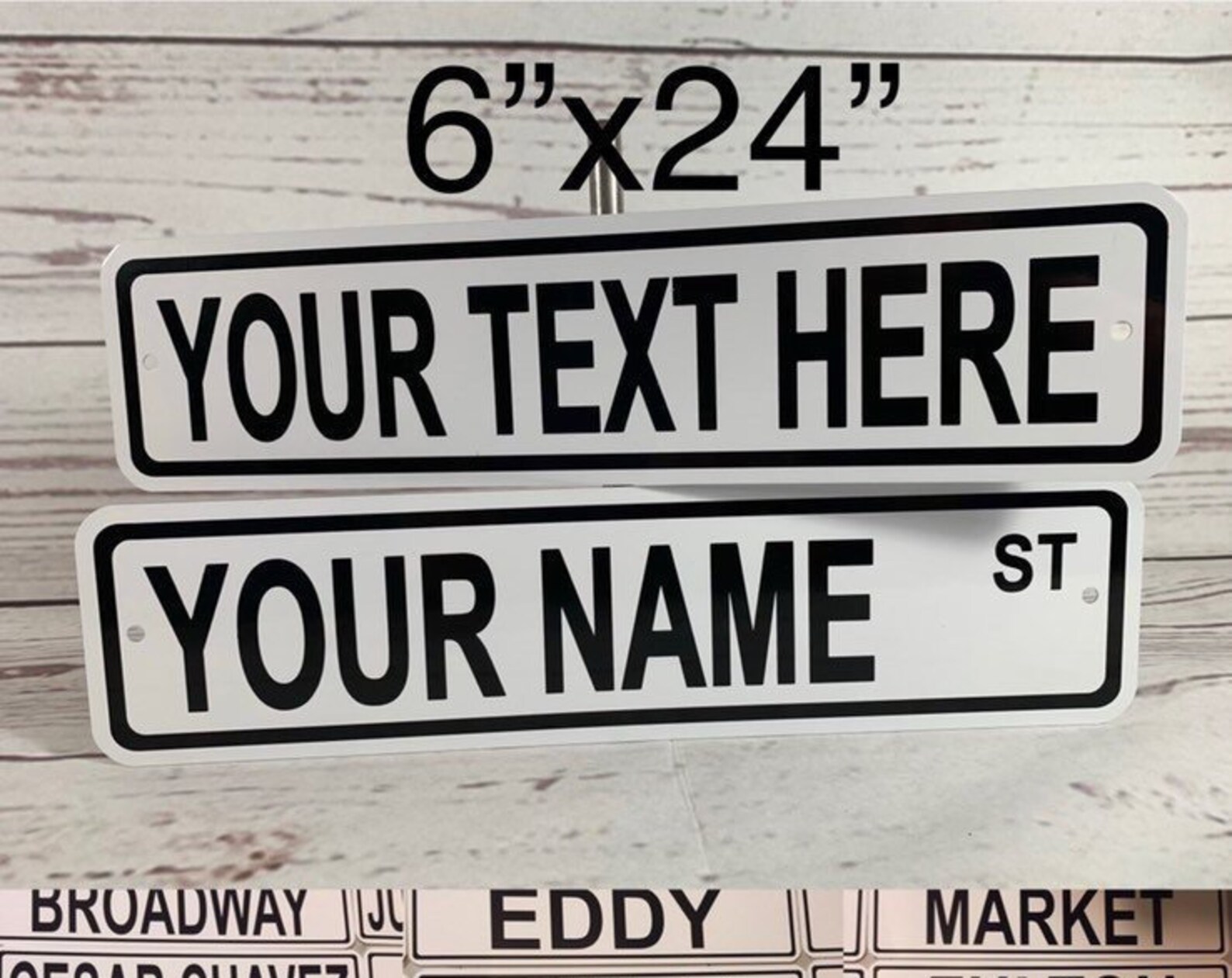 You choose the text or name made on the sign. (No images or logos). You can choose the street ending from the drop down menu. Ex: ST, RD, LN, BLVD, CIR, ALLEY, TRAIL, LOOP, WAY… or NO Ending, your choice!