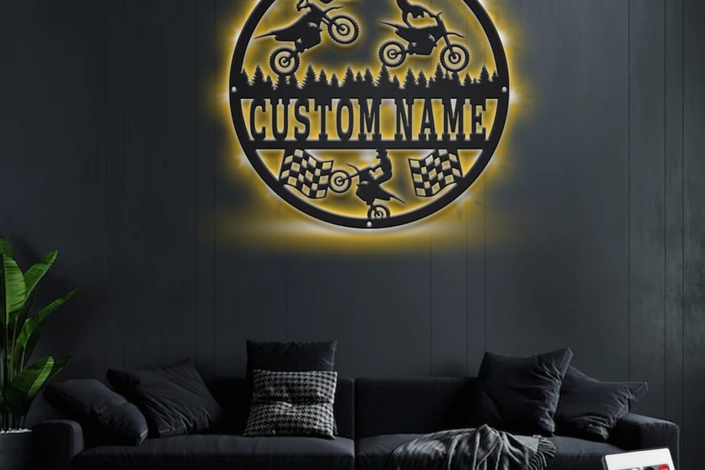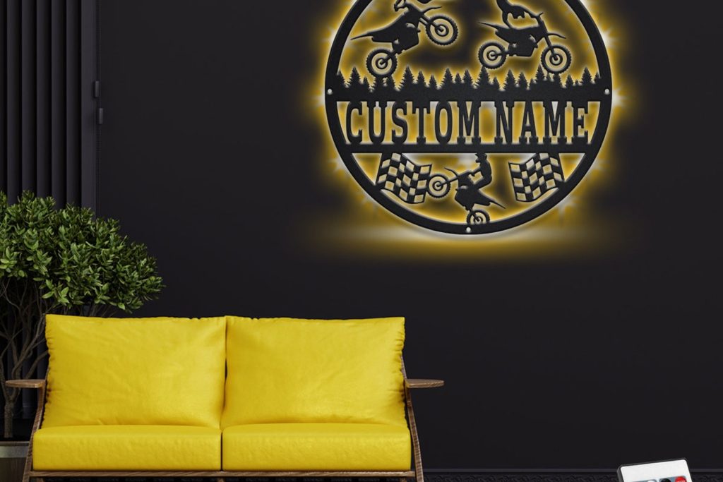 Custom Motocross Dirt Bike Metal Wall Art – LED Light, Personalized Biker Name Sign