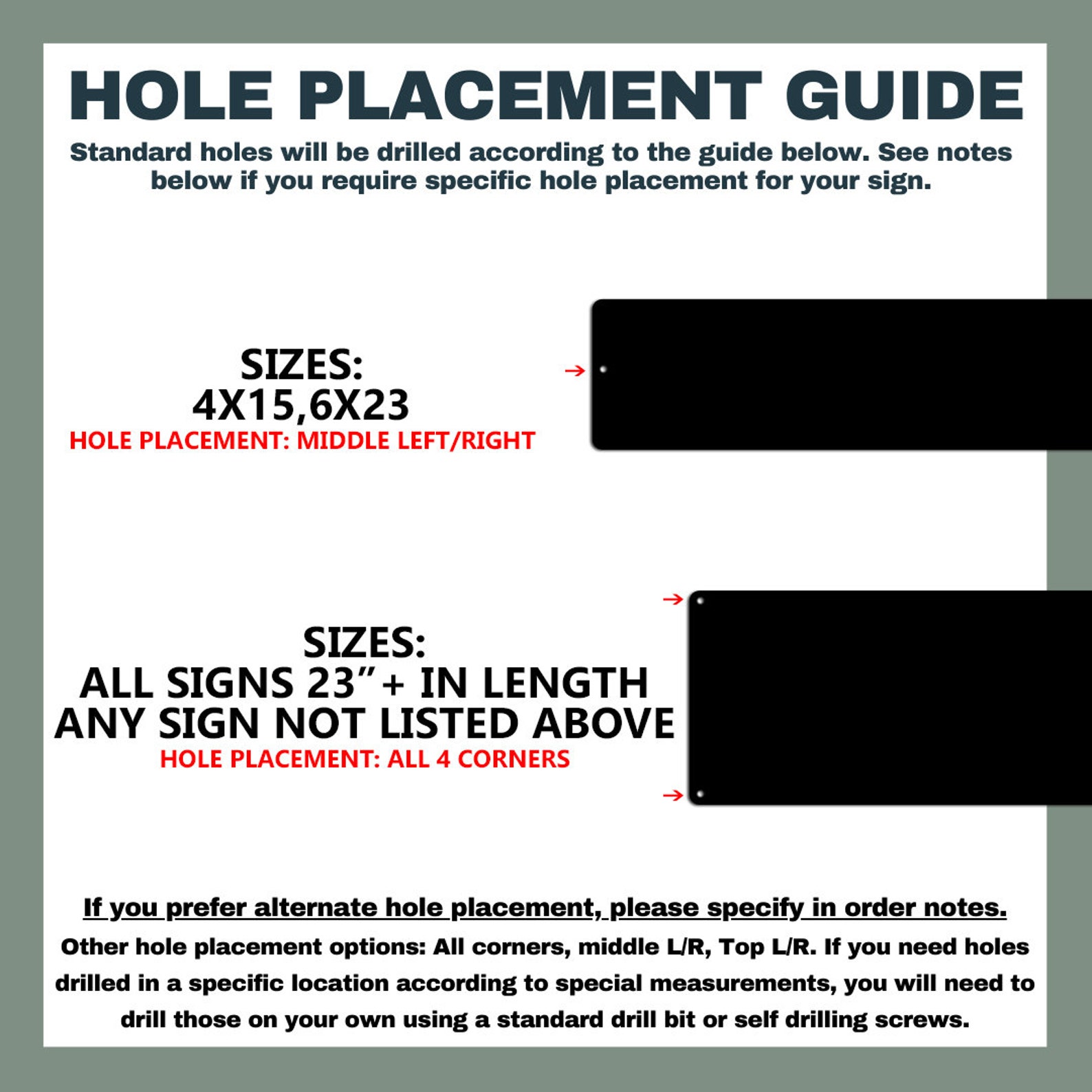 Pre-drilled holes: Hang using zip ties, screws, nuts & washers, sign brackets, rope, etc. Holes will be drilled in all corners unless otherwise specified.