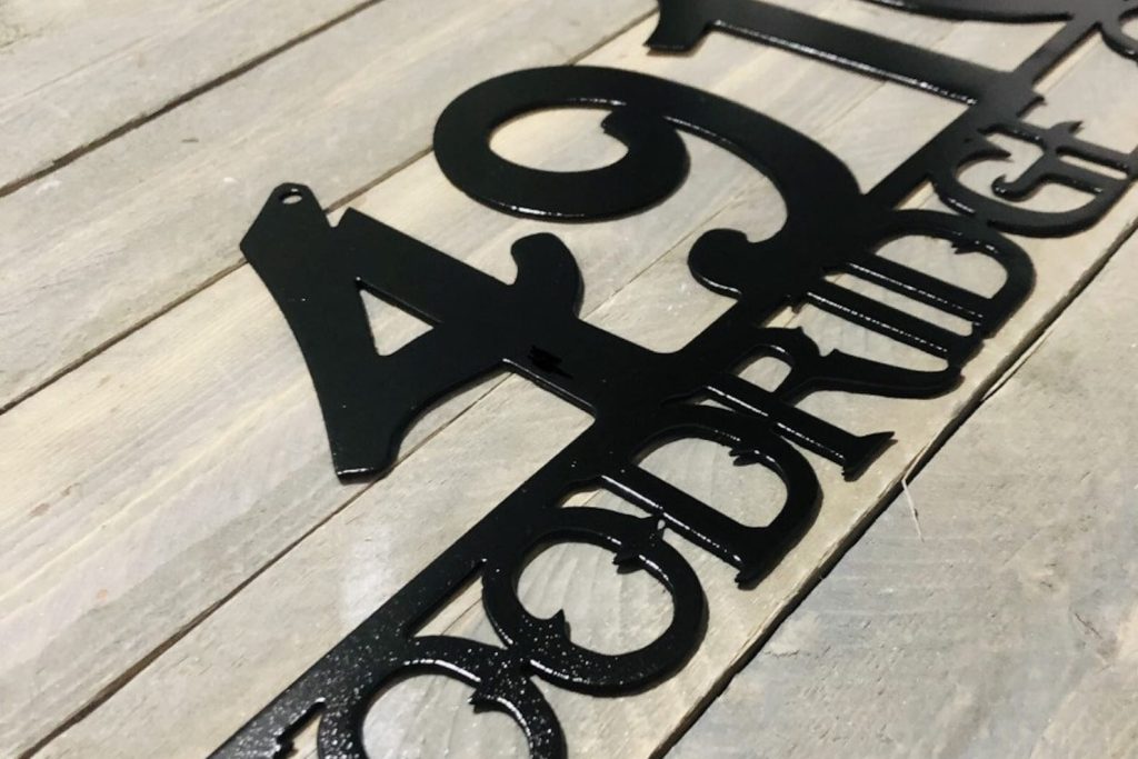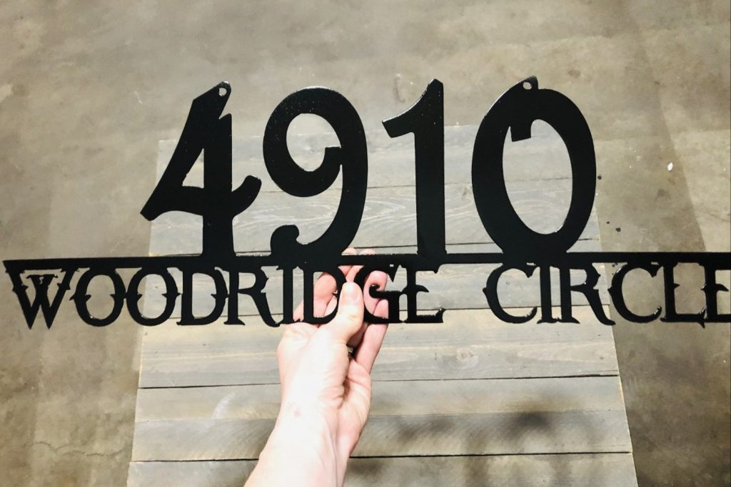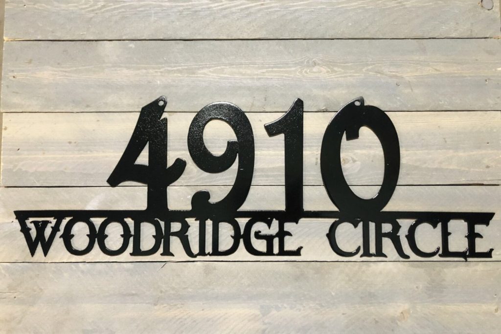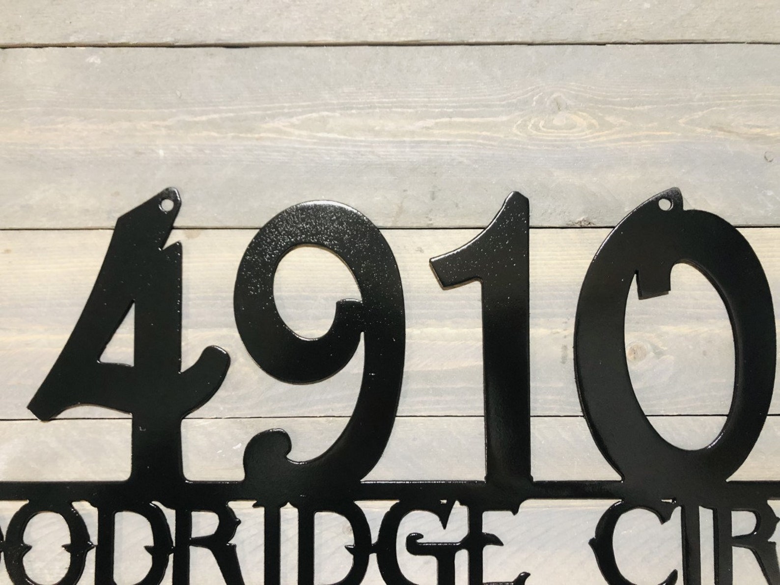 23 wide, a classy way to display your address number and street name. Two holes cut for either hanging with screws or on hooks. Durable. Painted black or grained silver and clear coated for protection.