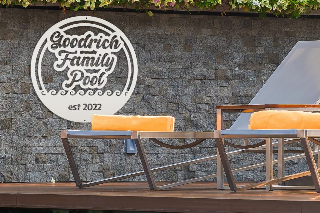 This custom pool sign is perfect for outdoor personalized patio family sign. It is made of metal and is perfect for tropical pool house decor. It makes a unique compliment as a welcome sign for deck or lanai area. It makes a great gift for your dad on father9;s day, wedding registry gift, or as a housewarming gift.
