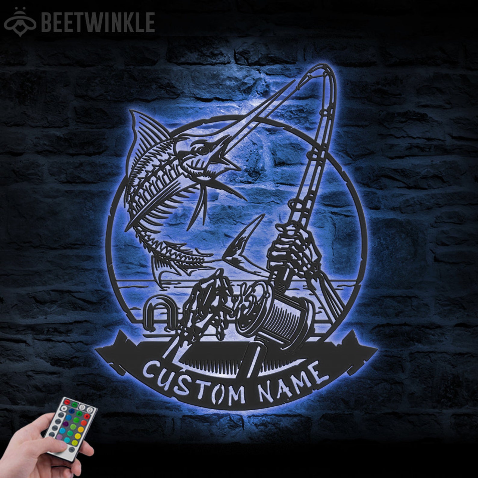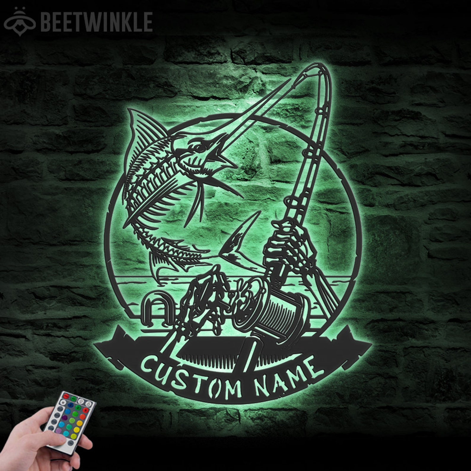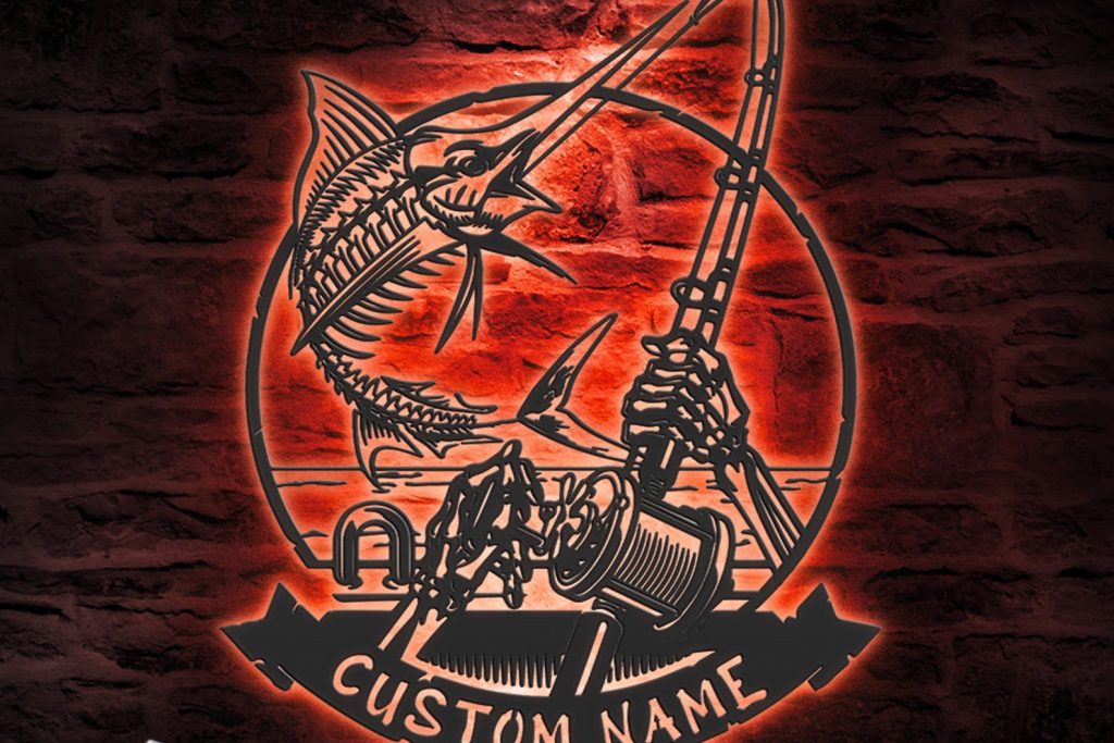 Custom Skeleton Marlin LED Metal Art – Skull Fisher Name Sign