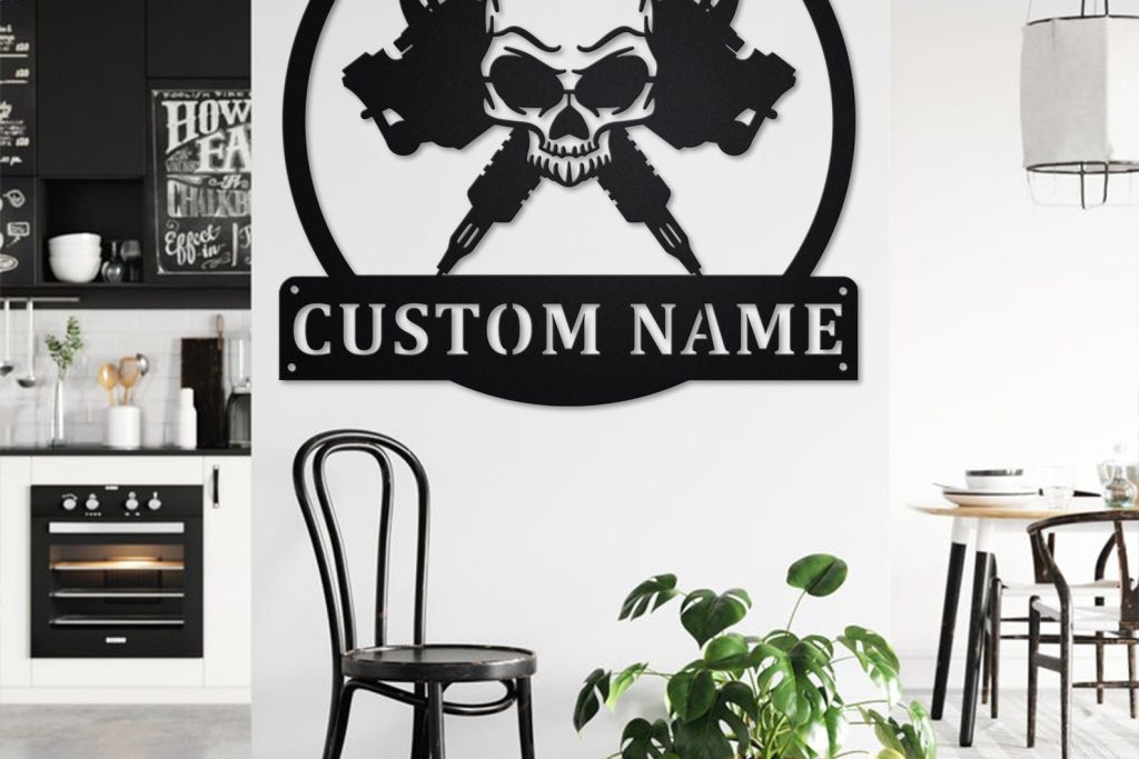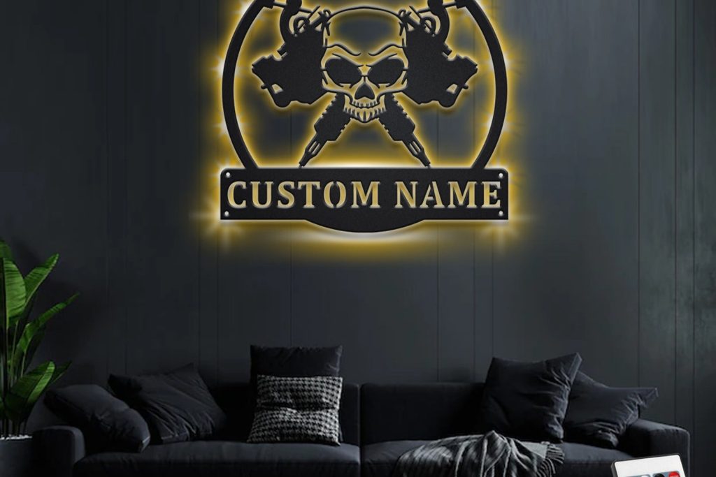 Custom Skull Tattoo Machine Metal Sign with LED – Room Decor
