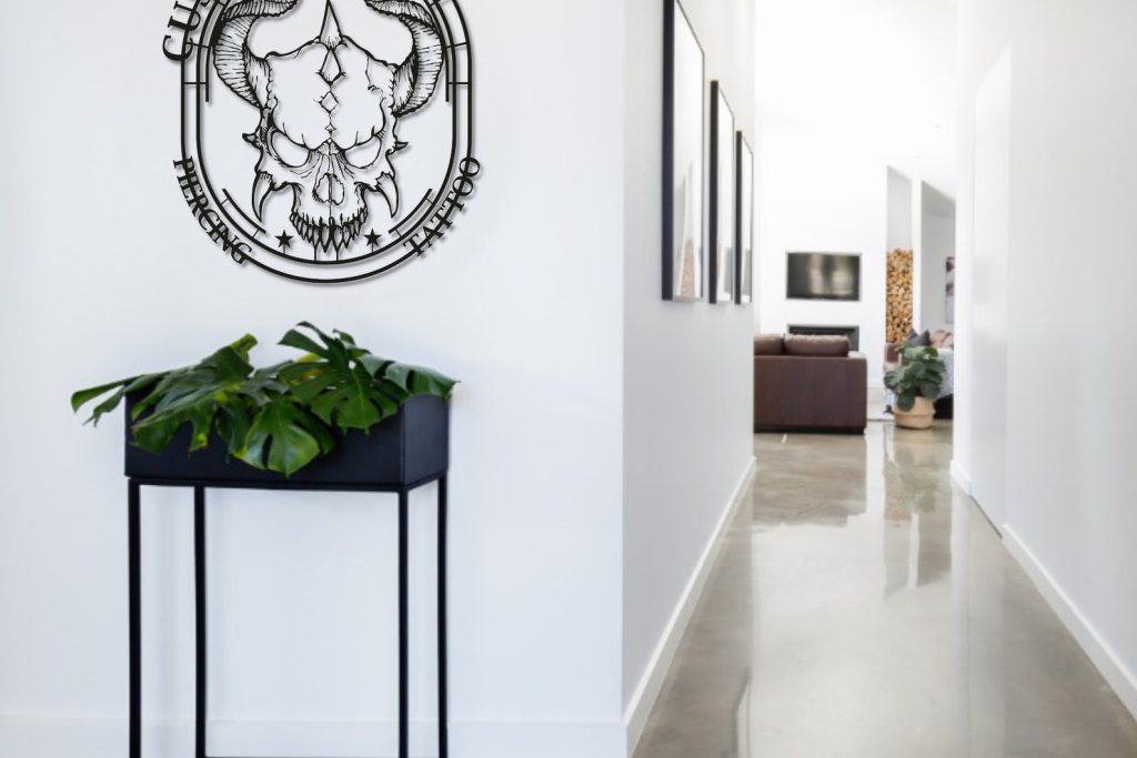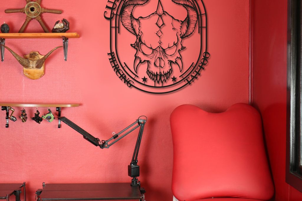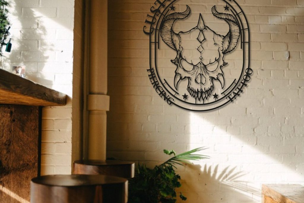 A skull themed metal tattoo wall decor with devil detail underneath. It is suitable for writing your brand name on the upper part, describing the business area with Tattoo and piercing writings on the lower part. If you want a different design, just contact us.