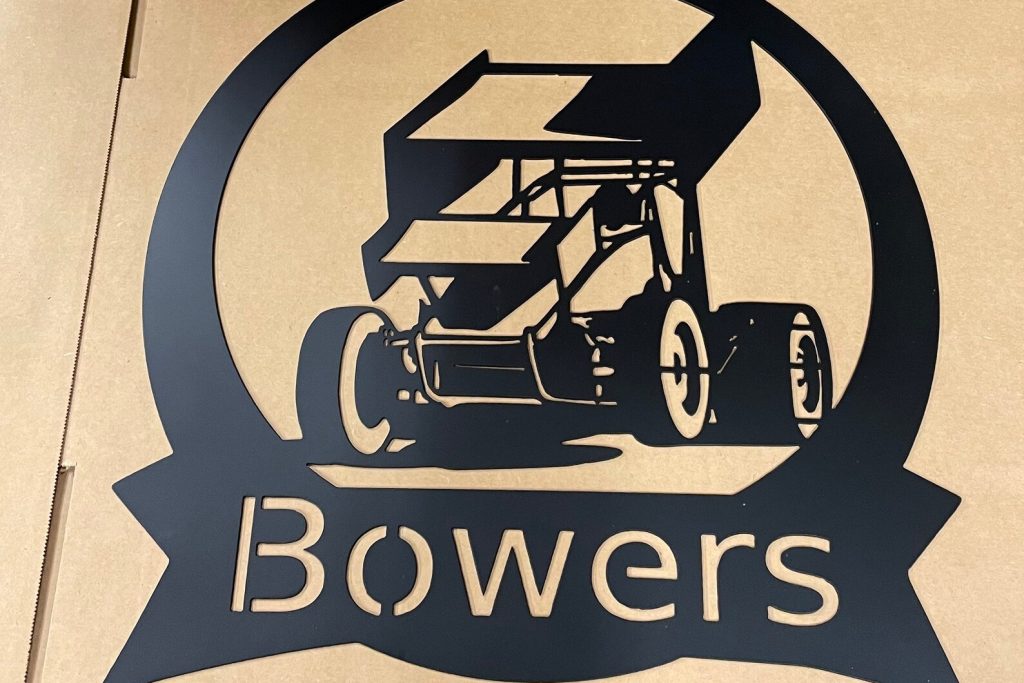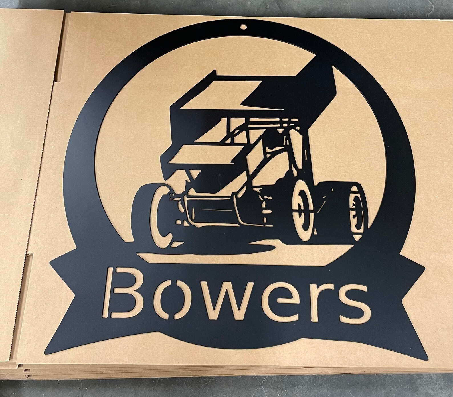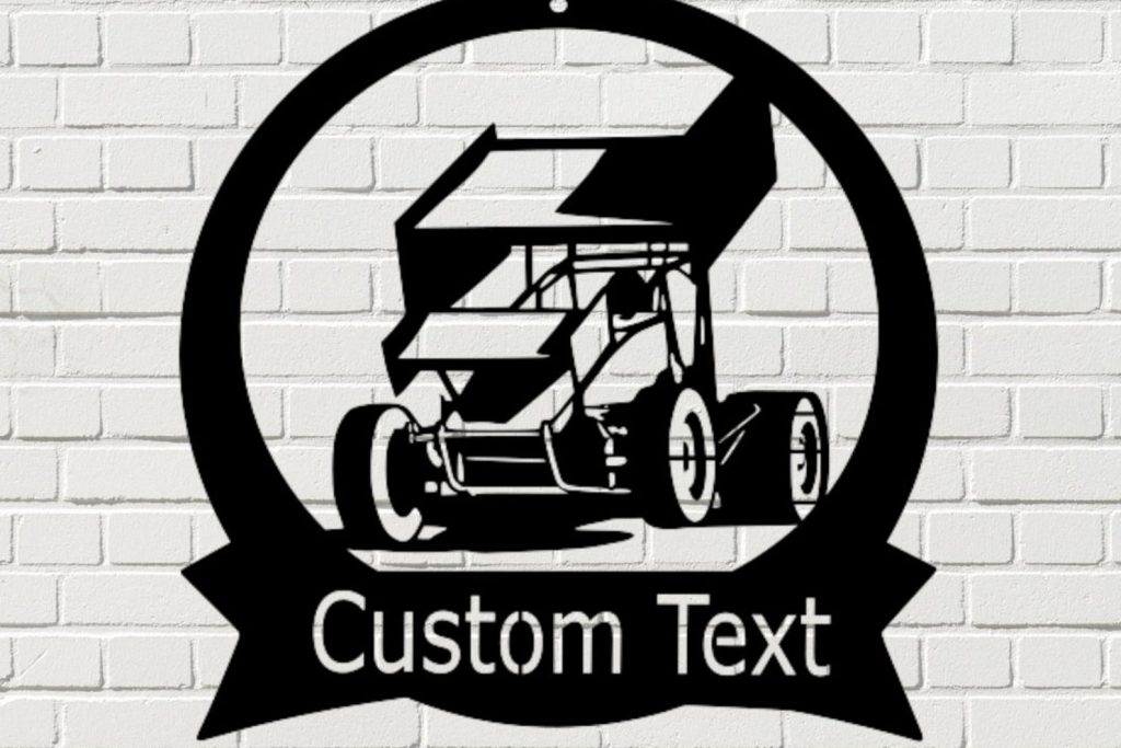 This personalized sprint car metal Sign is designed in house. It is a Fuller9;s Fabrication original. Equipped with an open hole for an easy attaching experience. This product is created on demand. It is finished with a powder coat and is an indoor and outdoor sign.