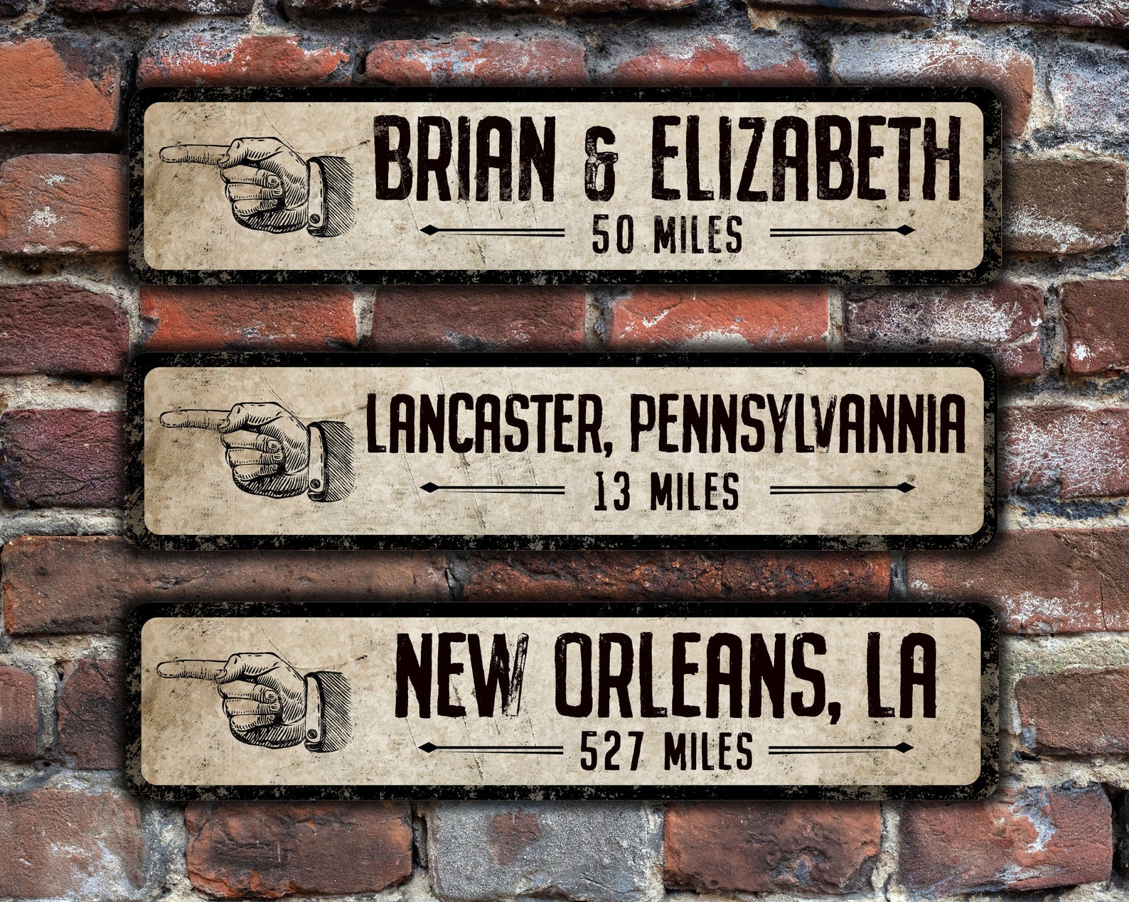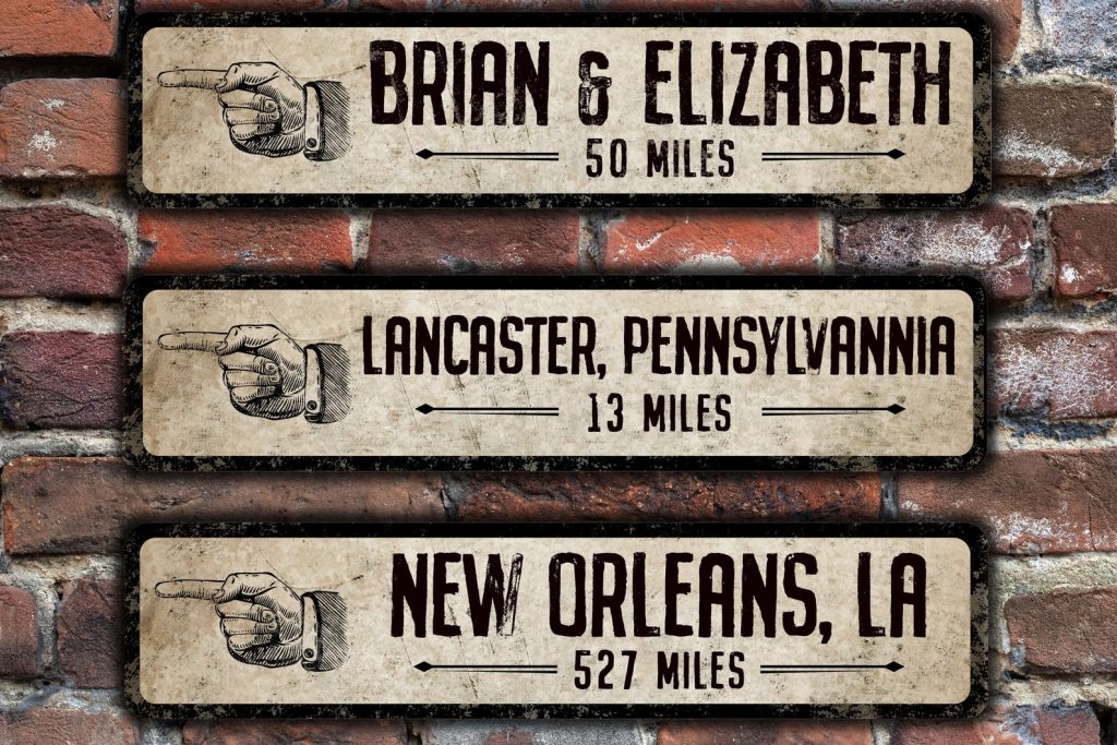 Let your imagination run wild with these super affordable vintage-style directional street signs. Have some fun by checking the distance to your favorite locations and posting them as a reminder of the great times you had or will have. Light weight and durable, these nifty signs are made to order in the USA. These custom metal signs will look perfect in any kitchen, home, bar, pub, bath, office, garage, and business. Our signs are made from .032 UV treated aluminum, which means they9;re built to last. Sublimation creates a super tough image that is fused into the surface of the metal making it almost impossible to scratch. You can install these signs anywhere indoors or outdoors though we do recommend not placing them in direct sunlight to avoid fading over time.