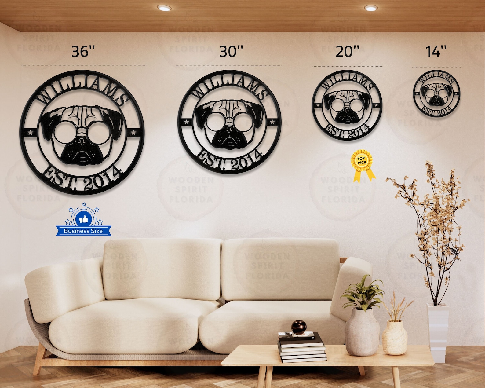 Cute Pug Dog Art Decor – Personalized Name Wall Sign, Custom Metal Monogram