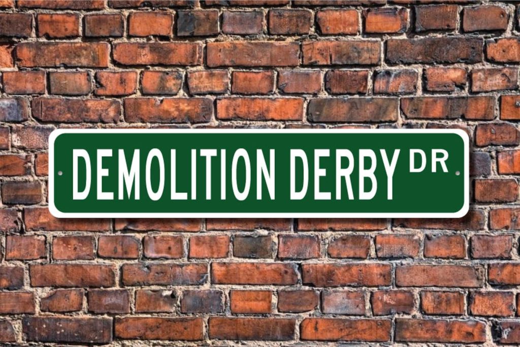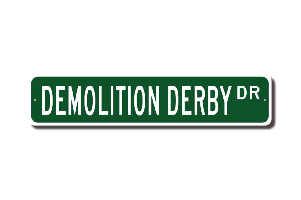 Demolition Derby lovers check out this awesome street sign! This will make the perfect piece for any Demolition Derby fan, or maybe you are a Demolition Derby lover looking for a cool decor piece ! Made of premium aluminum it will stand the test of time. This sign will look great in any room, home den, cave, or office ! Get this sign for your favorite Demolition Derby aficionado !