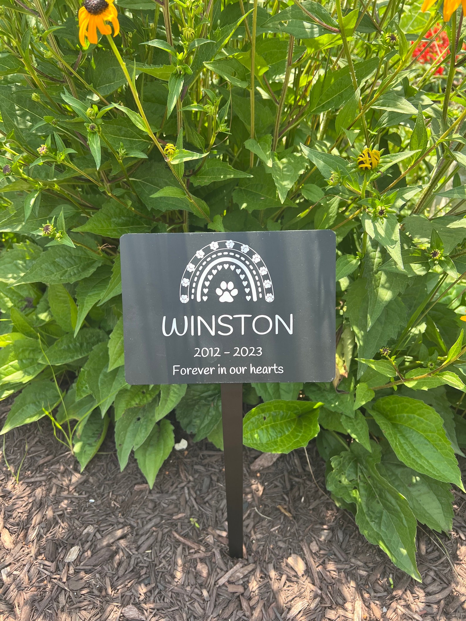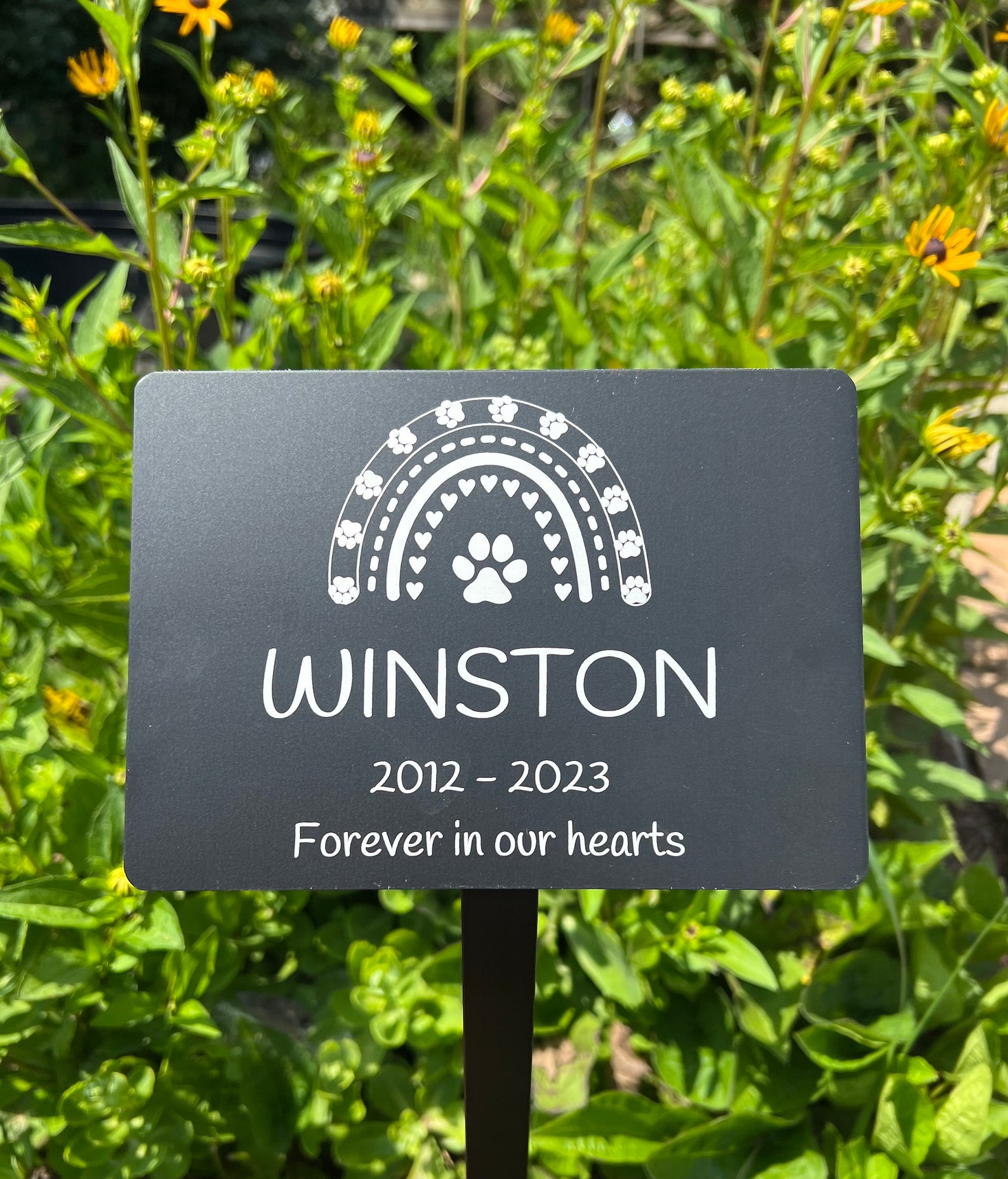 7"L x 5"H- Engraved black metal plaque and stake. Engraved with rainbow design shown. Add your custom name, date and quote.