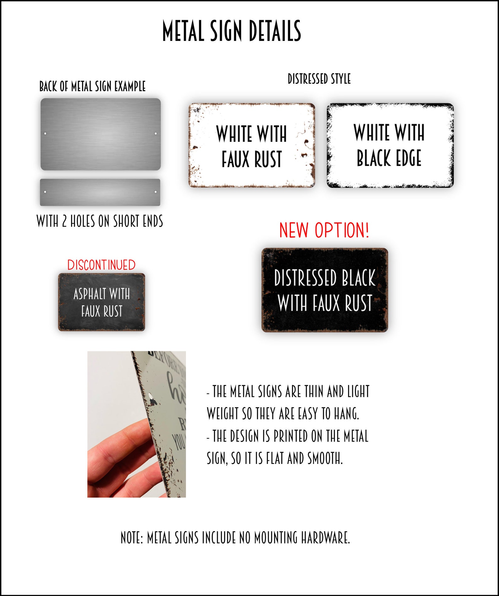NOTE: All rustic add-ons including any rust, distressed marks, etc. are printed on and not real, so the signs are smooth to the touch.
