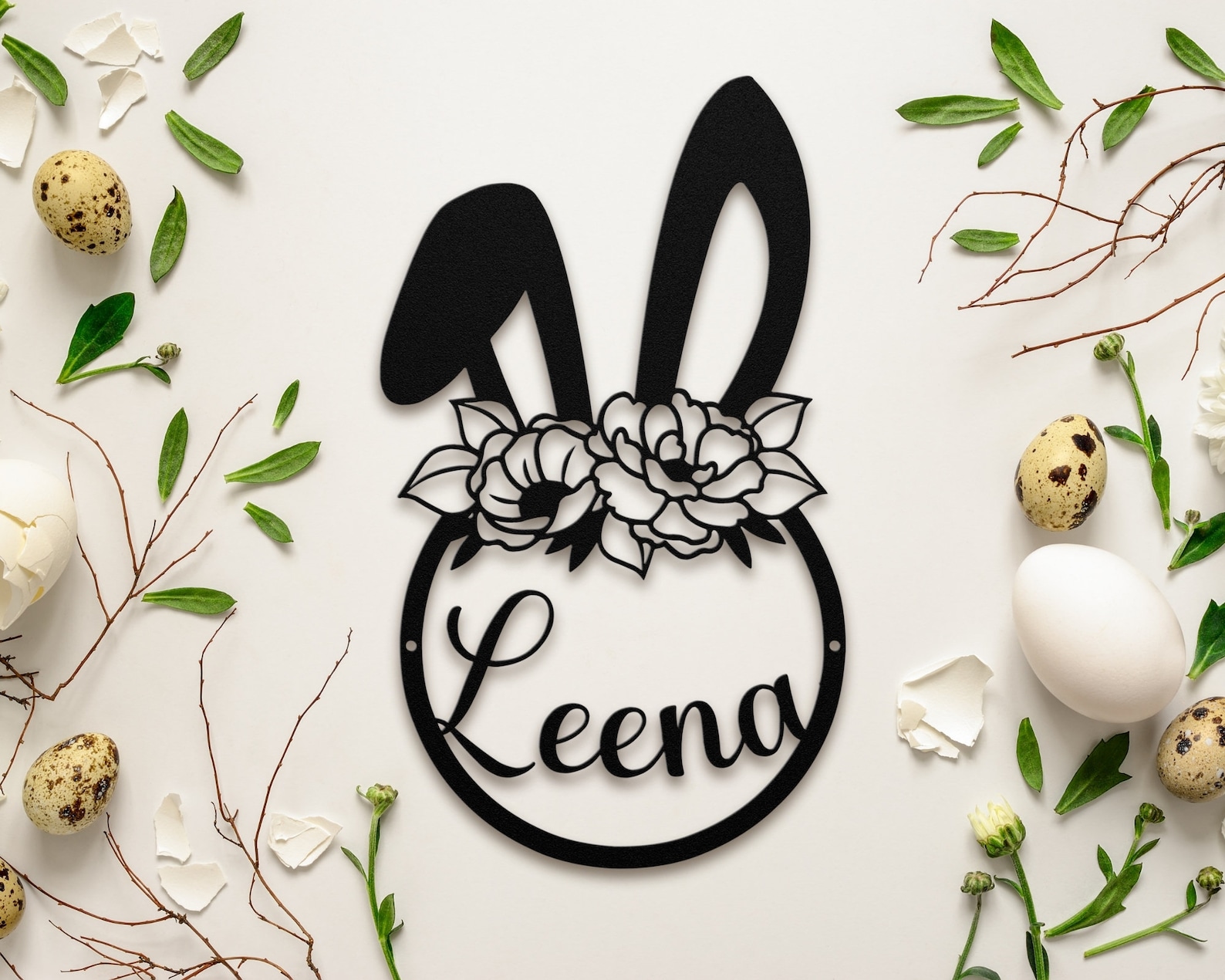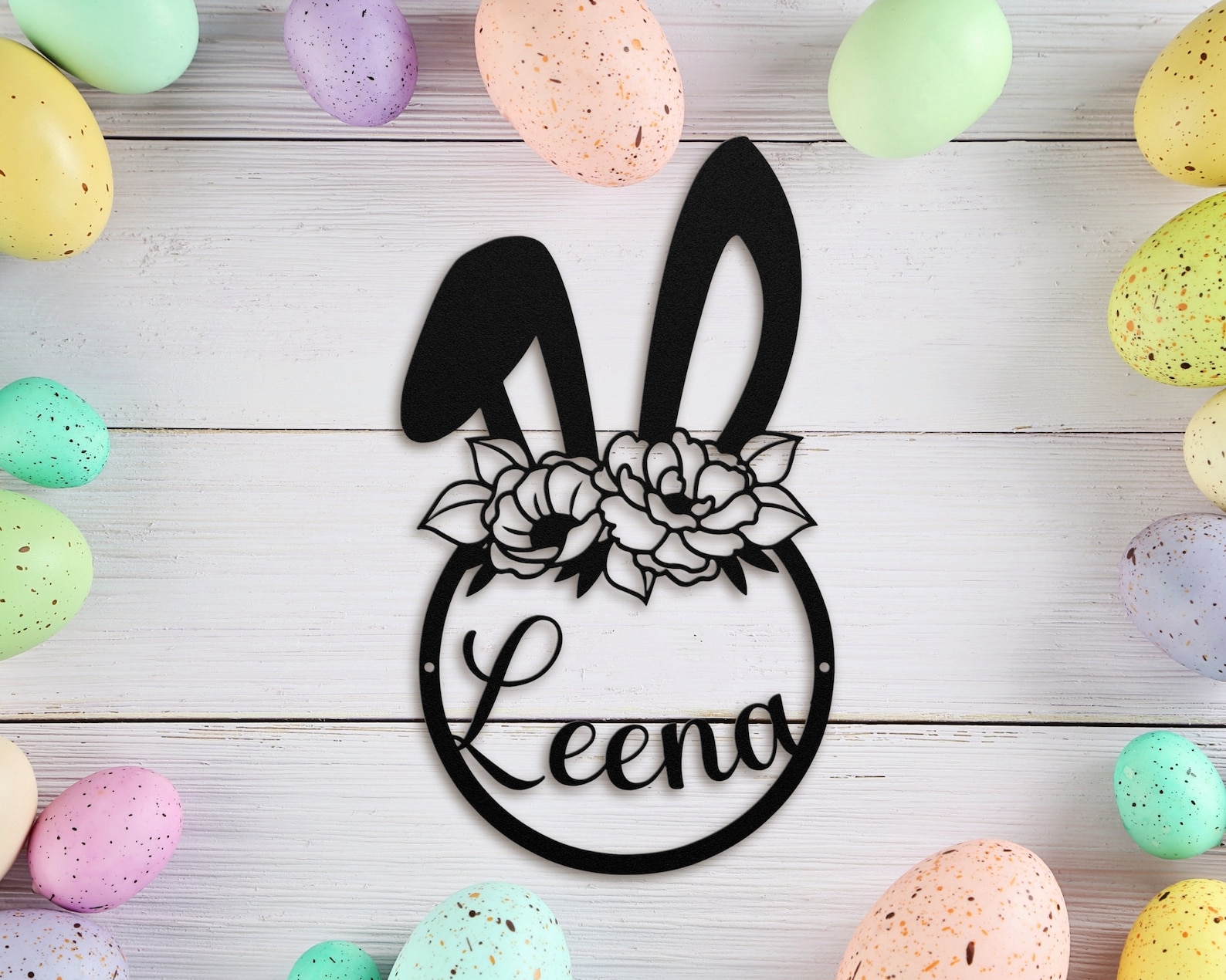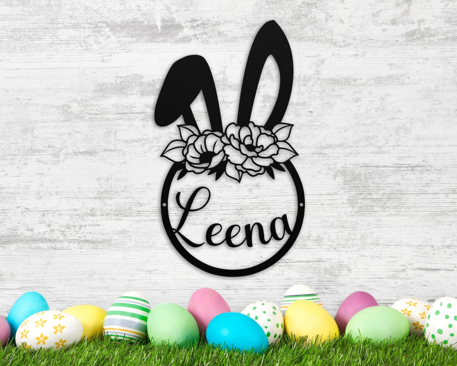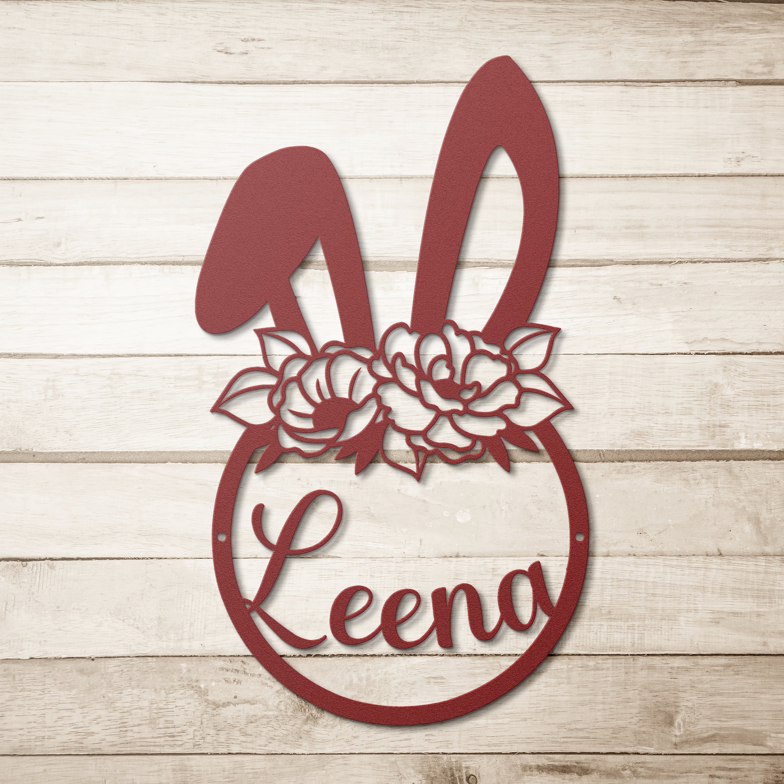 Decorate your home for Easter with this charming Easter Bunny Metal Name Sign! Perfect for outdoor decor, this whimsical bunny ears monogram wreath is a delightful addition to your front door. Handcrafted with care, this adorable bunny hanger is sure to bring a festive touch to your spring celebrations. Personalize it with your family name to make it uniquely yours. Welcome guests with style this Easter season with this Bunny Metal Name Sign!