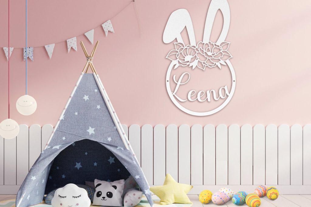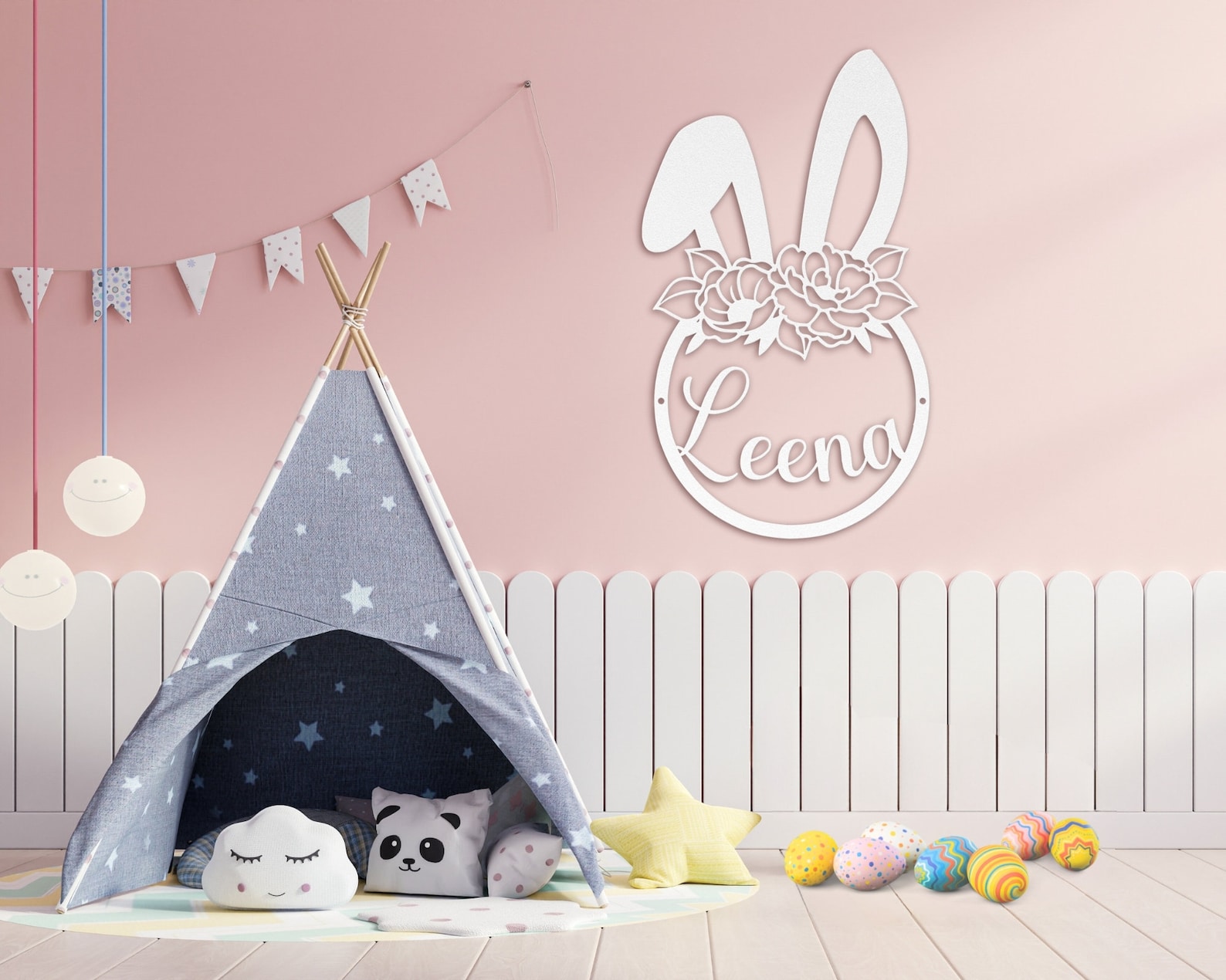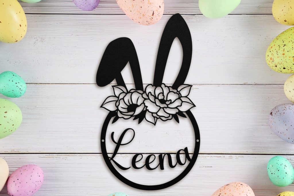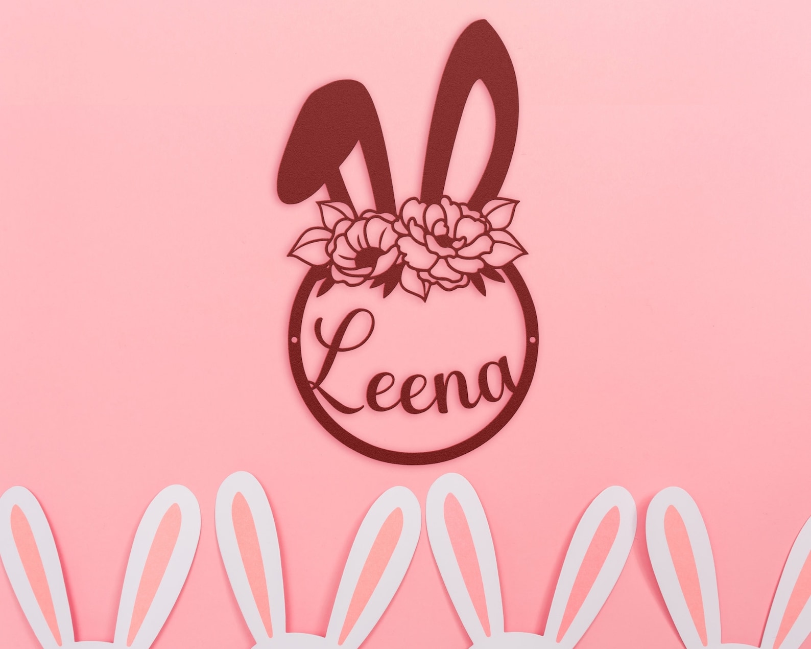 Decorate your home for Easter with this charming Easter Bunny Metal Name Sign! Perfect for outdoor decor, this whimsical bunny ears monogram wreath is a delightful addition to your front door. Handcrafted with care, this adorable bunny hanger is sure to bring a festive touch to your spring celebrations. Personalize it with your family name to make it uniquely yours. Welcome guests with style this Easter season with this Bunny Metal Name Sign!