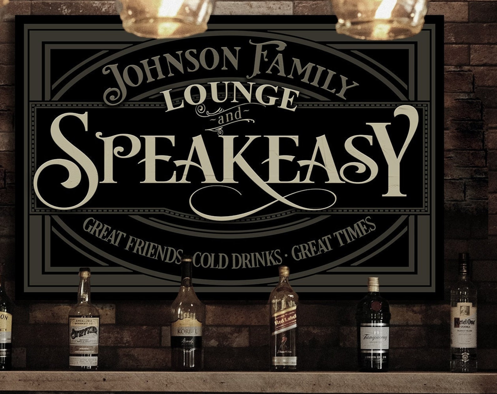 This personalized Speakeasy Bar sign offers a vintage, pub decor look and feel. I will customize this Speakeasy Lounge sign by integrating your name into the vintage art you see.