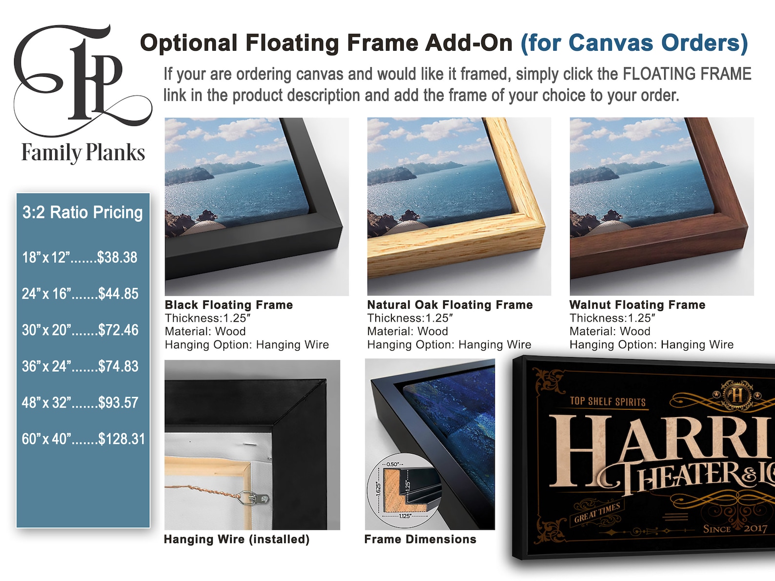 We will install a sawtooth hanger on the back of your canvas or leave it off if requested.